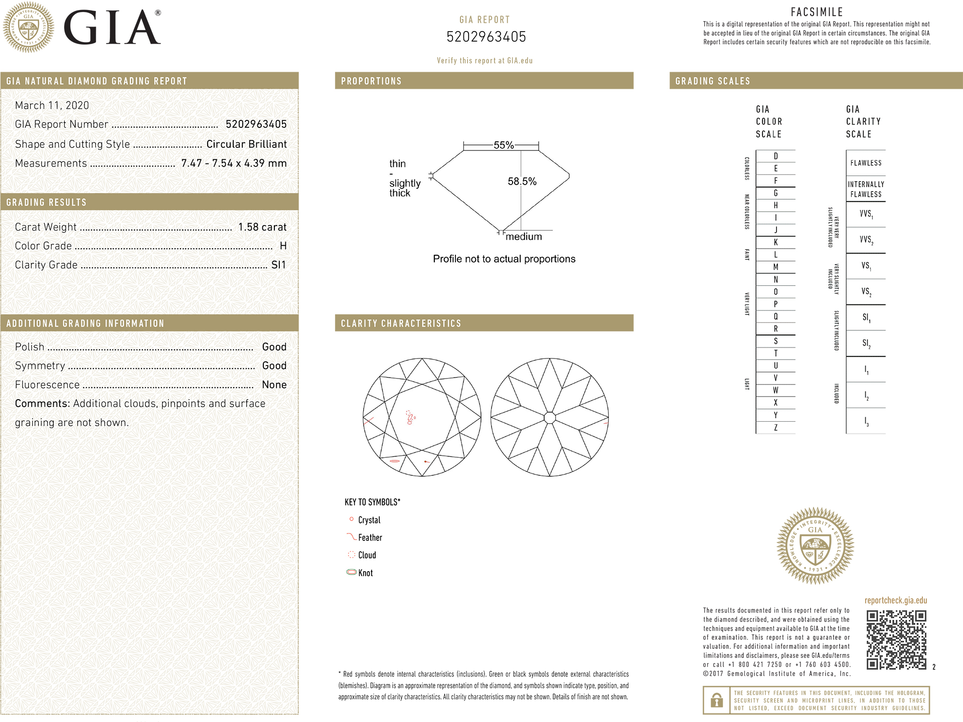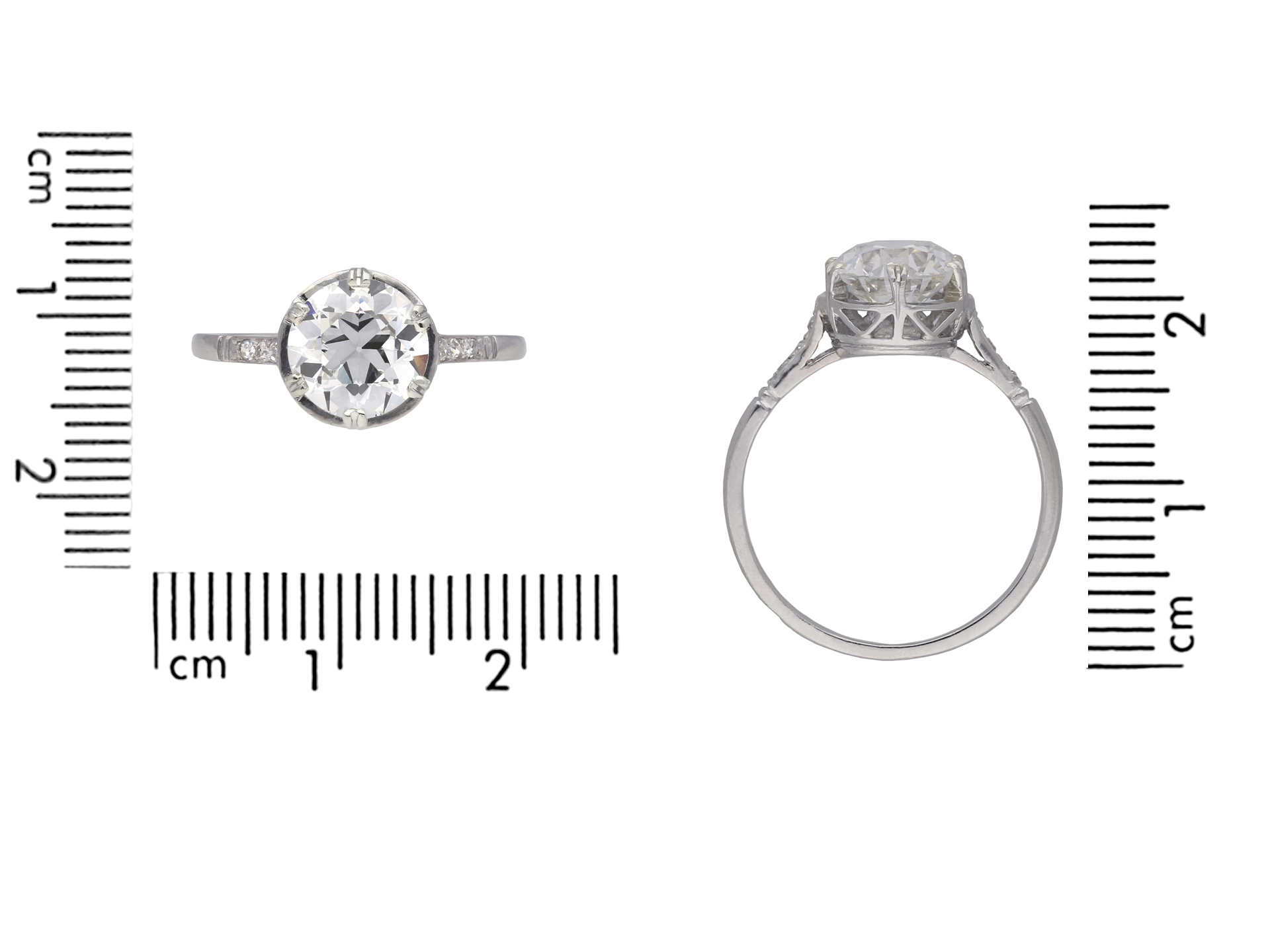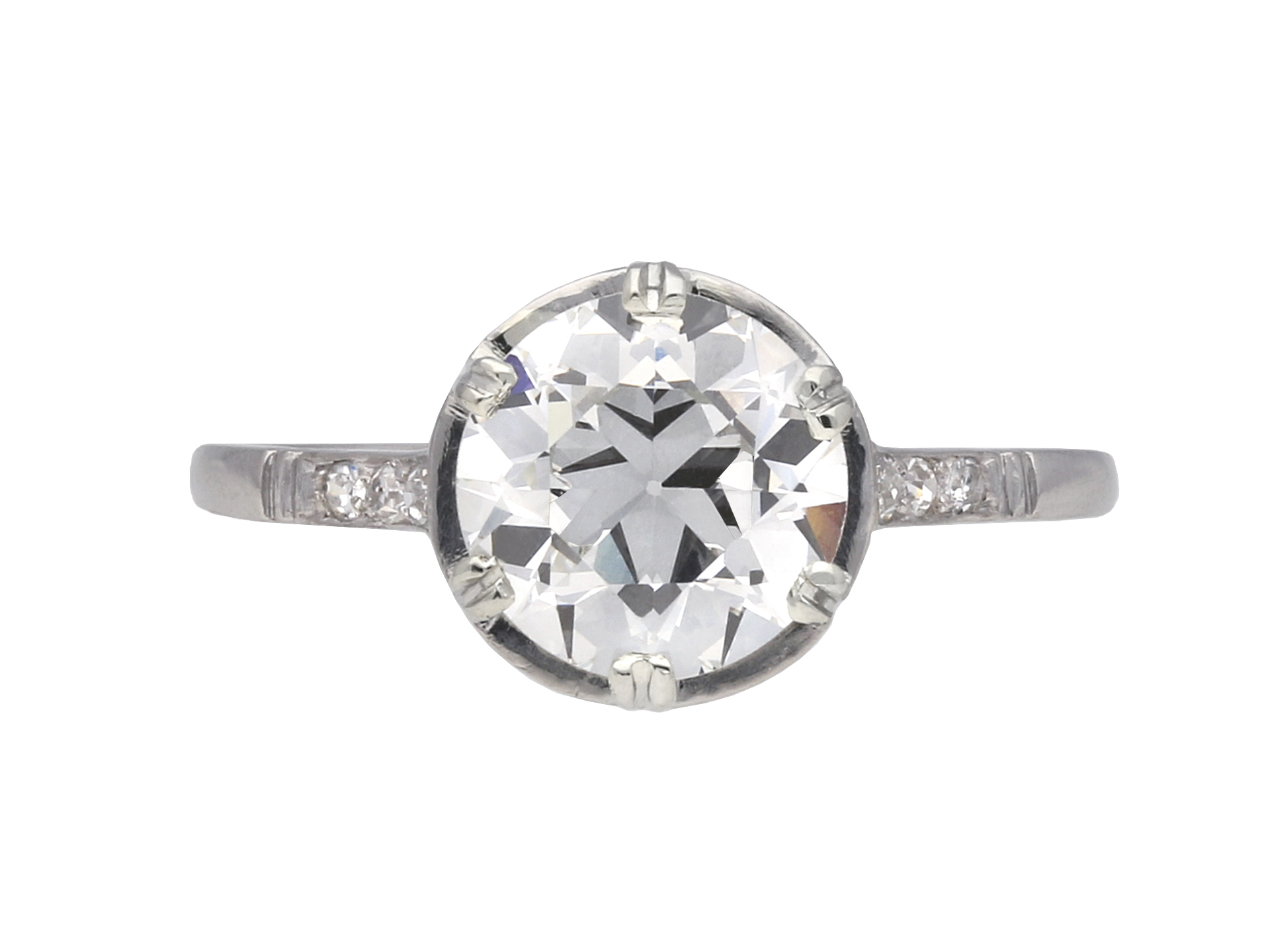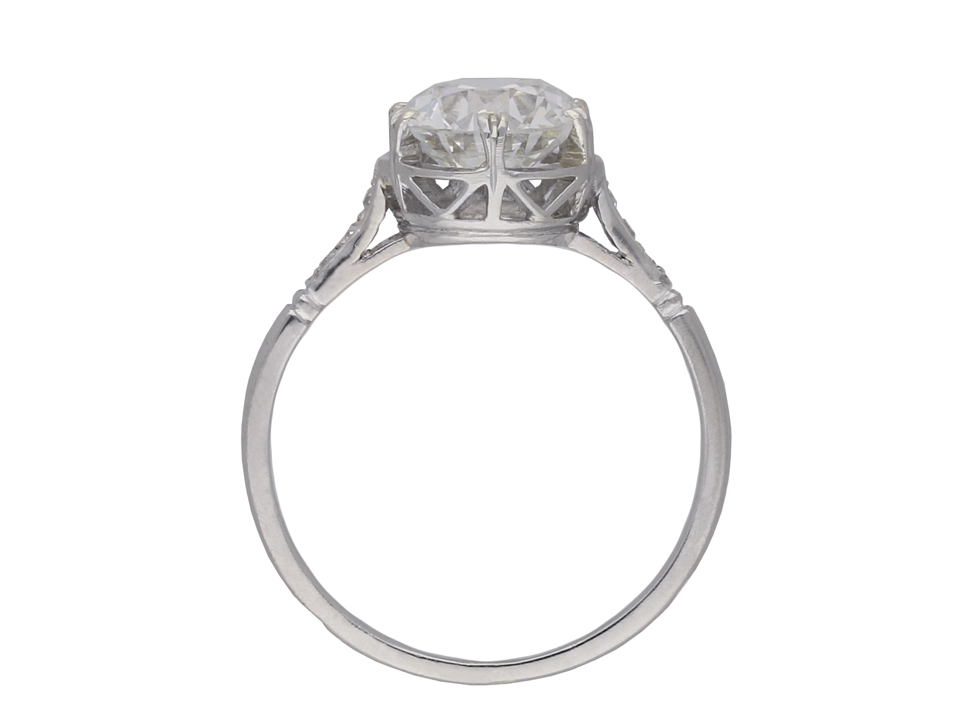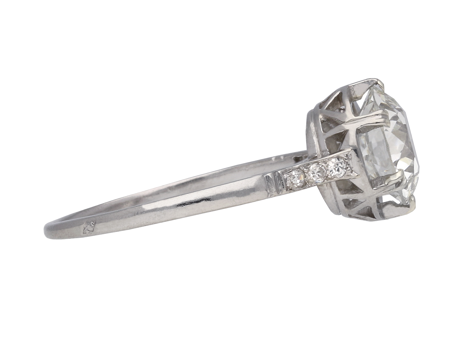 Art Deco diamond flanked solitaire ring. Centrally set with a round old cut diamond, H colour, SI1 clarity, with a weight of 1.58 carats in an open back claw setting, further set with six round eight cut diamonds in open back grain settings with a combined approximate weight of 0.06 carats. The total approximate diamond weight is 1.64 carats, to an elegant solitaire design featuring curving double claws, polished edges, an intricately pierced linear gallery and open backholing, the slightly raised shoulders with grooved detail tapering to a solid D-shape shank. Marked platinum, indistinct makers mark, French, circa 1920. accompanied with Gemmological Institute of America (GIA) report #5202963405.