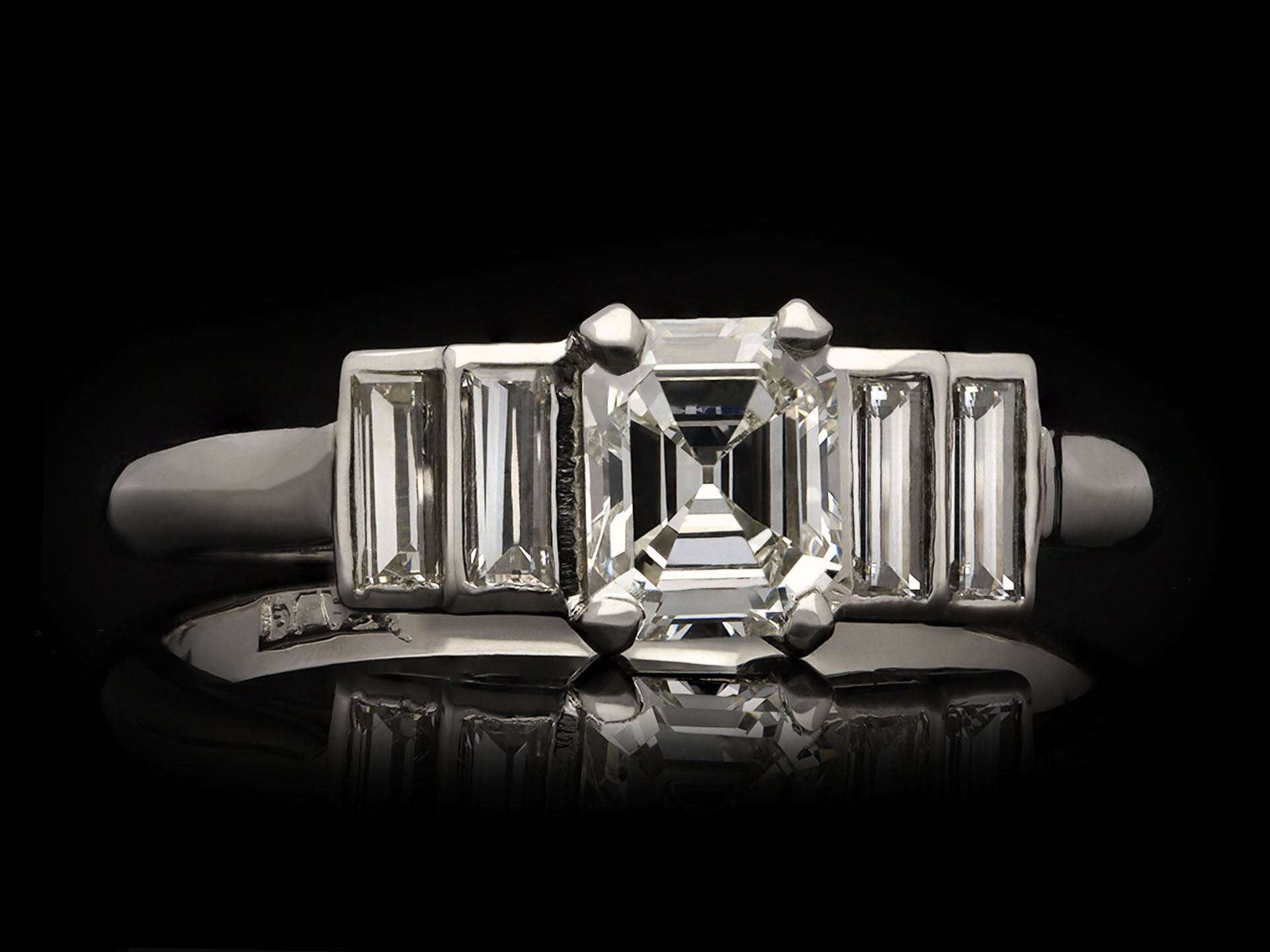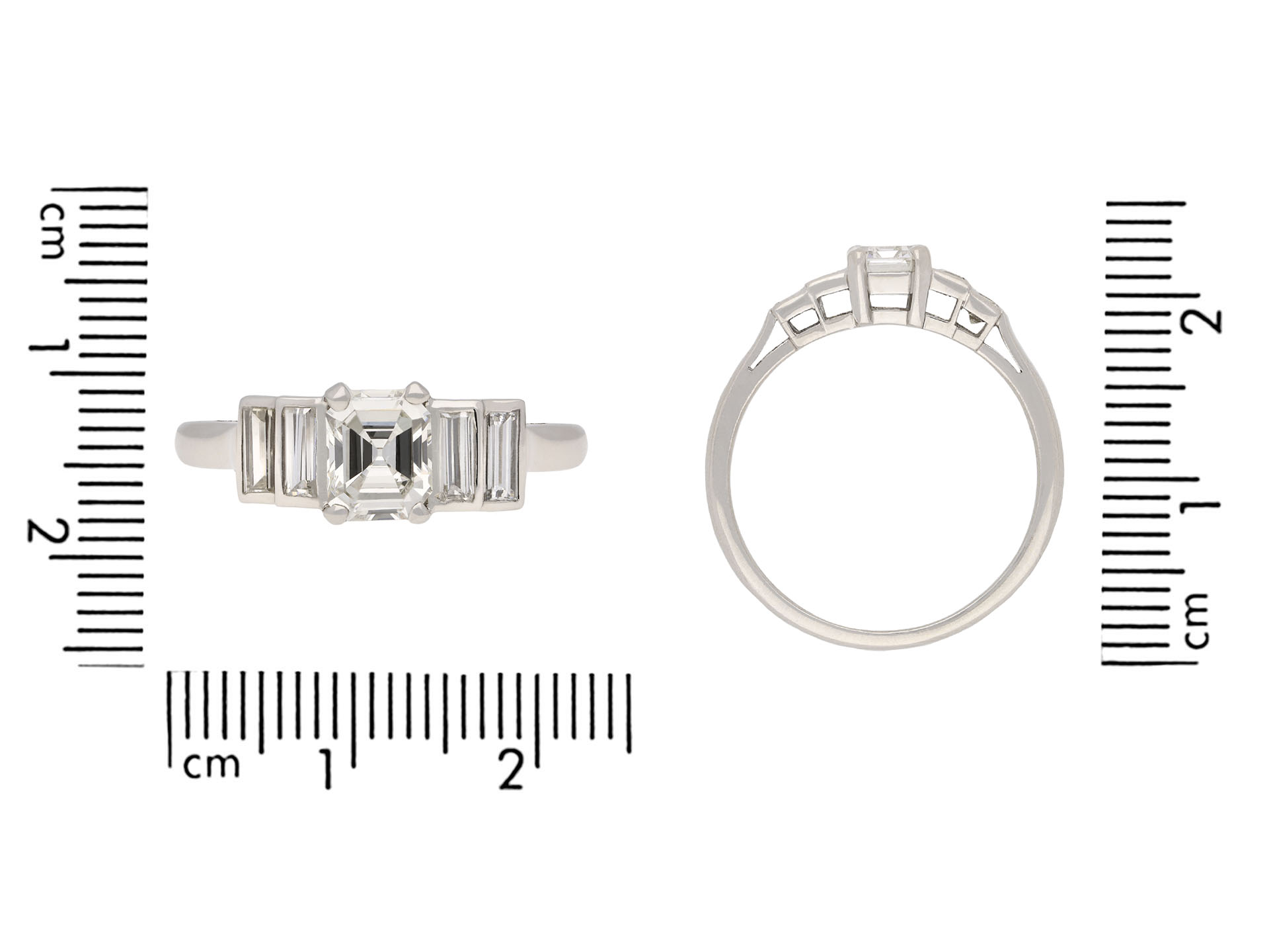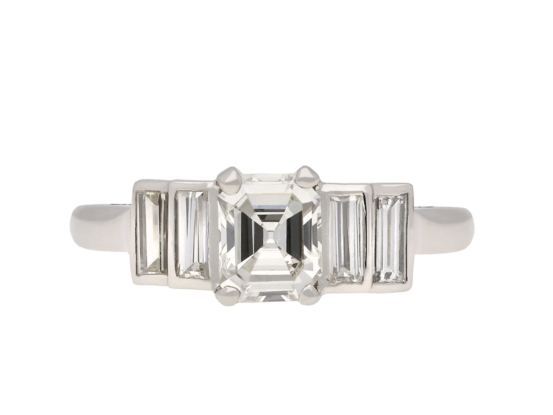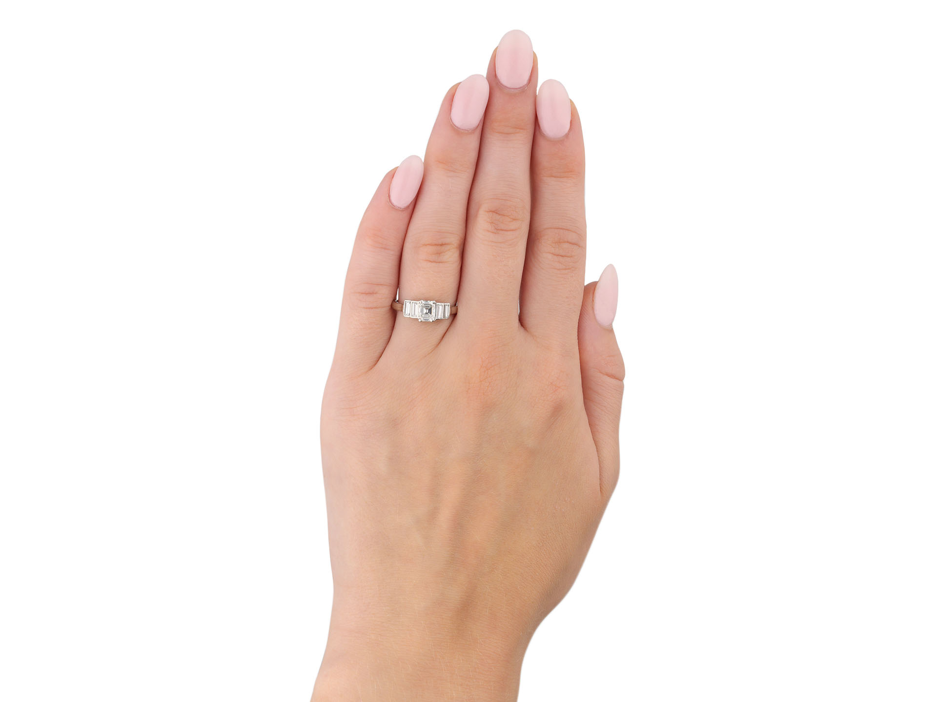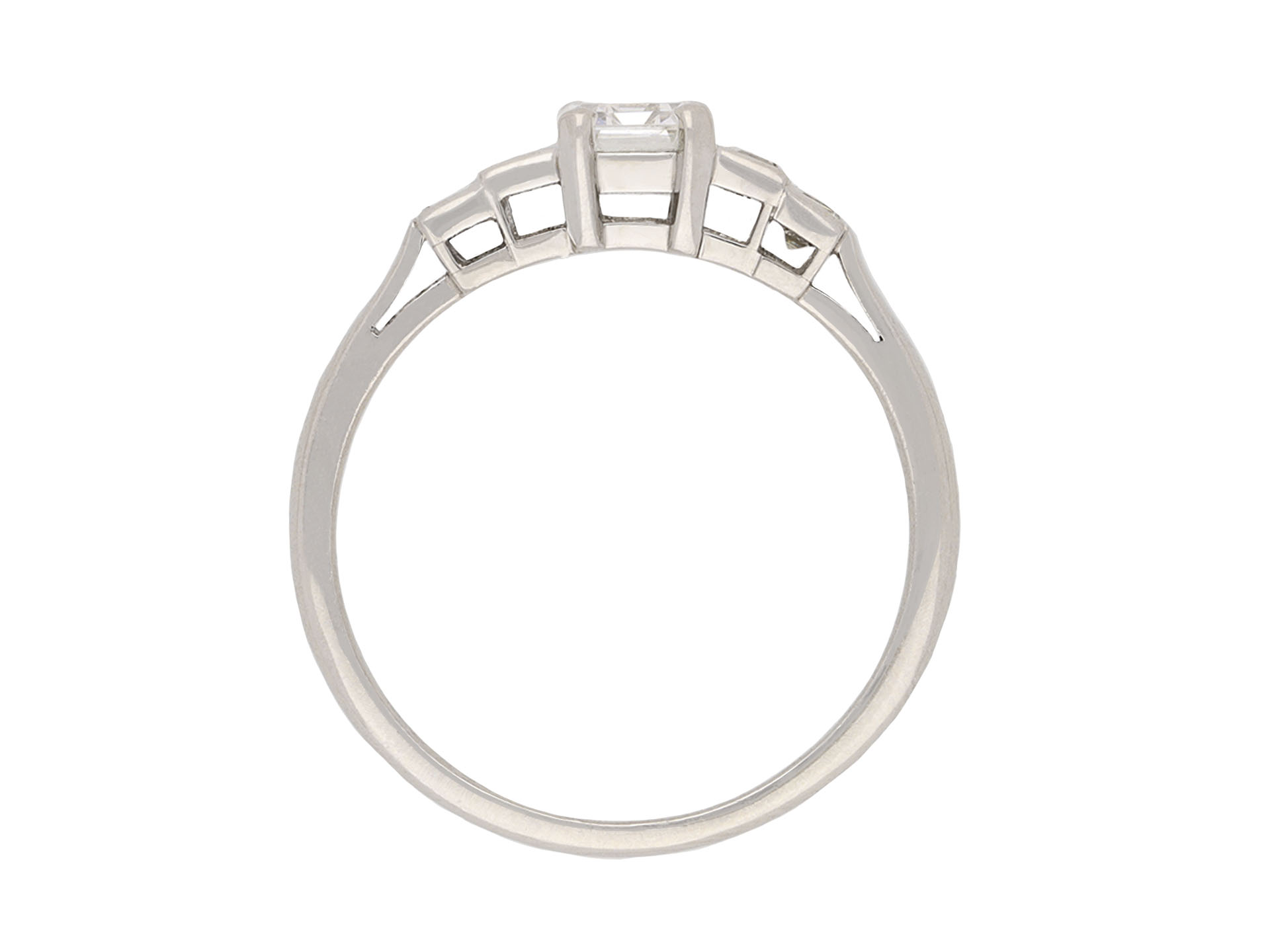 Art Deco diamond flanked solitaire ring. Set to centre with one octagonal emerald-cut diamond in an open back claw setting, with an approximate weight of 0.70 carats, flanked by four rectangular baguette cut diamonds in open back rubover settings, with a combined weight of 0.24 carats. The total approximate diamond weight is 0.94 carats, to an impressive flanked design featuring polished borders, a linear pierced gallery and fancy open backholing, flanked by broad raised shoulders that flow through to a solid D-shape shank. Marked platinum, circa 1920.