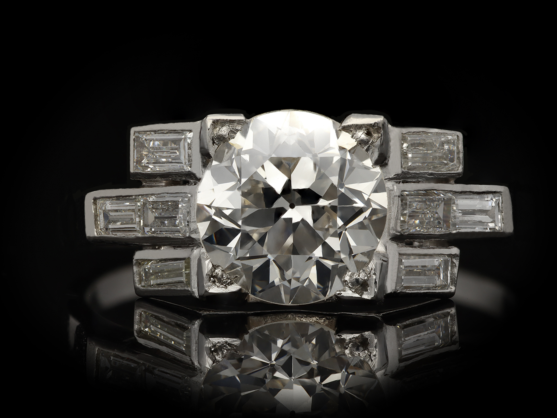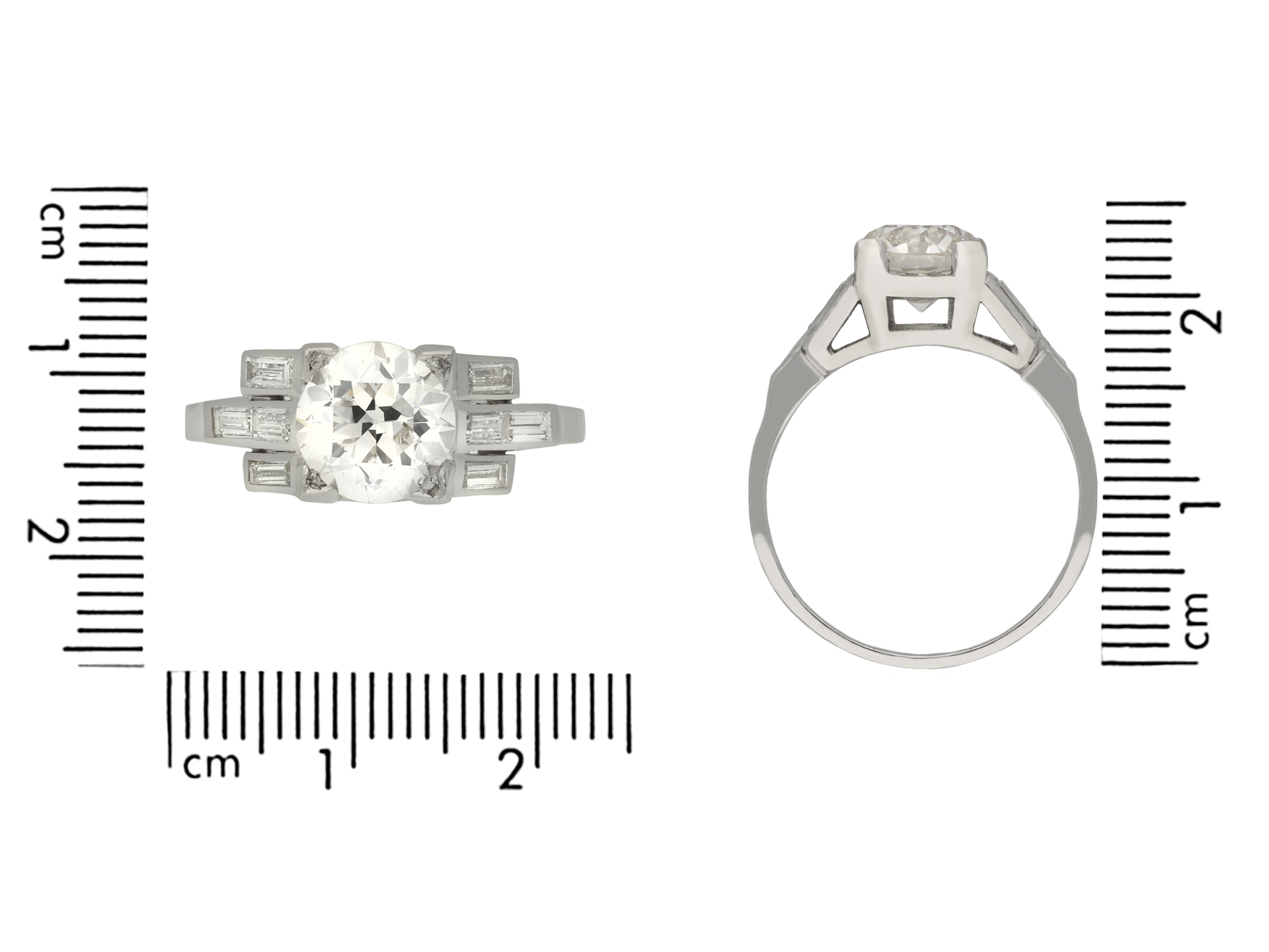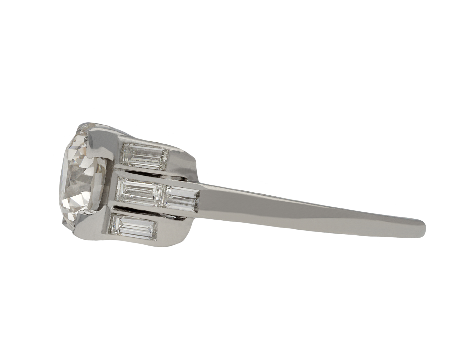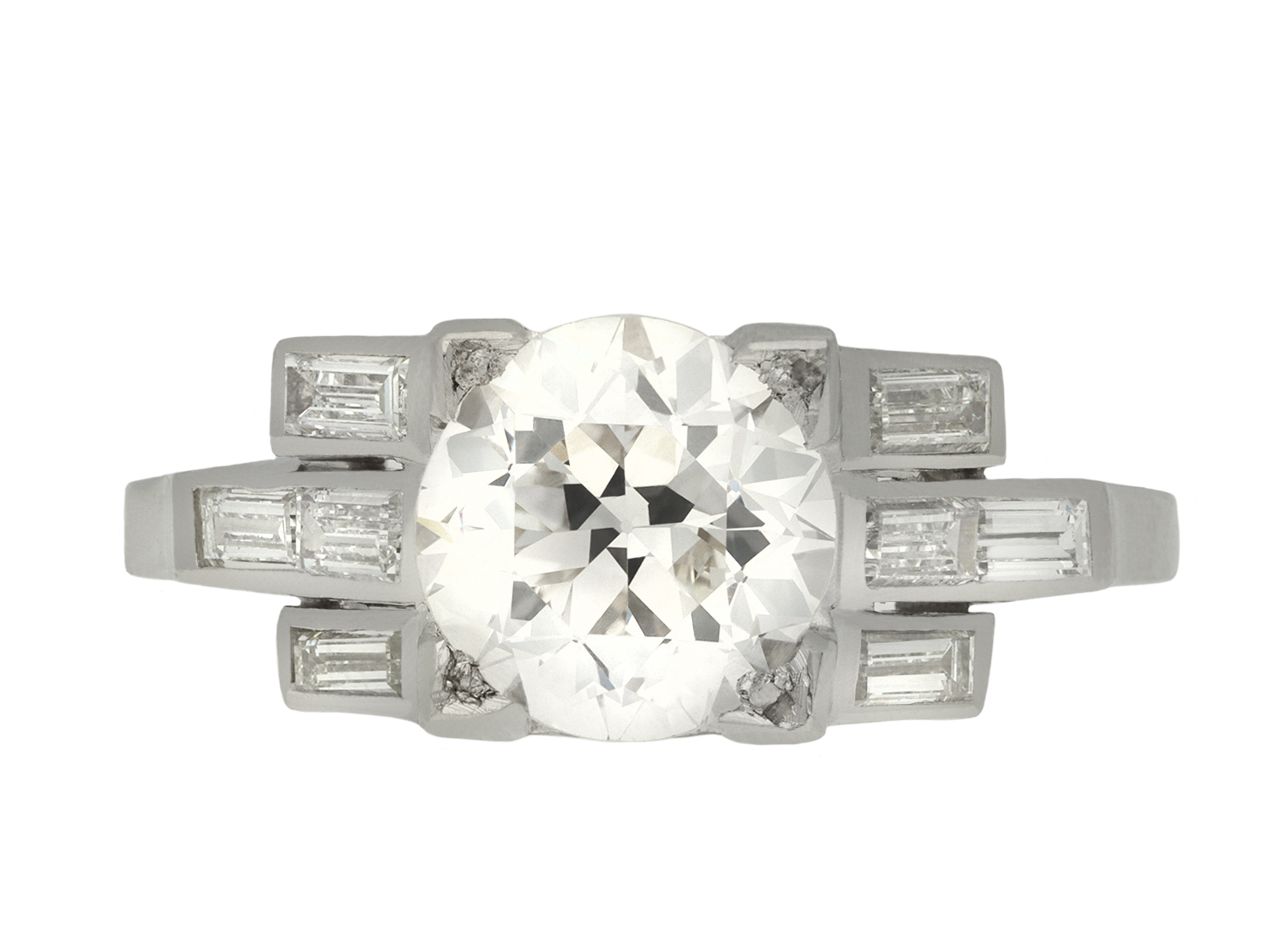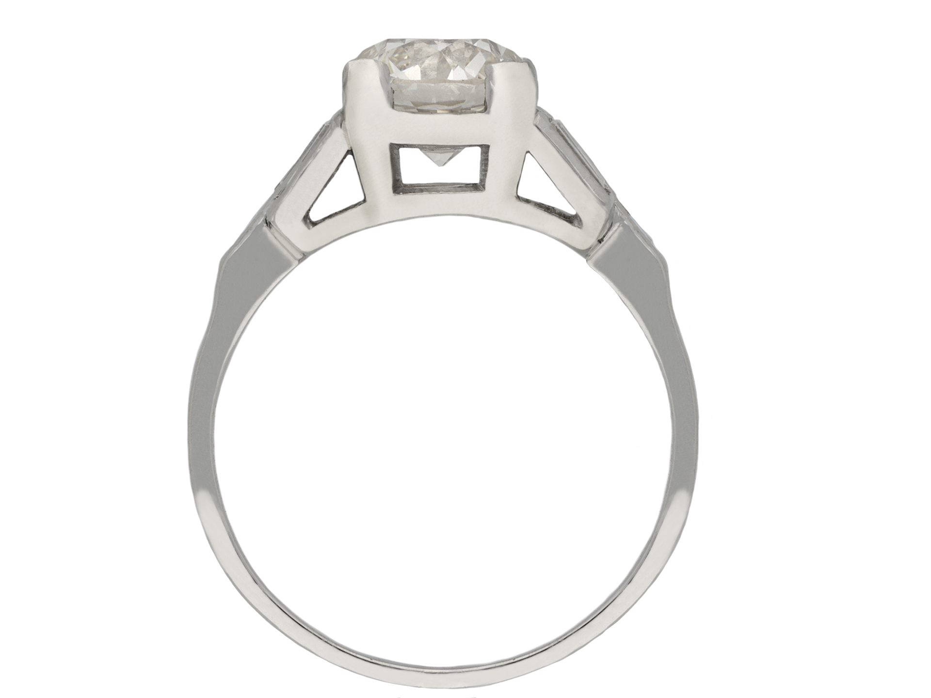 Art Deco diamond ring. Set to centre with a round old cut diamond, L colour, SI2 clarity, with a weight of 1.57 carats in an open back claw setting, flanked by eight rectangular baguette cut diamonds in open back rubover settings with a combined weight of 0.50 carats. The total approximate diamond weight is 2.07 carats, to an elegant linear design featuring corner claws, a geometrically pierced gallery and fancy shaped open backholing, leading to smooth shoulders and flowing through to a tapering solid shank. Tested platinum, circa 1930, accompanied by Gemological Institute of America (GIA) report #6237357378.