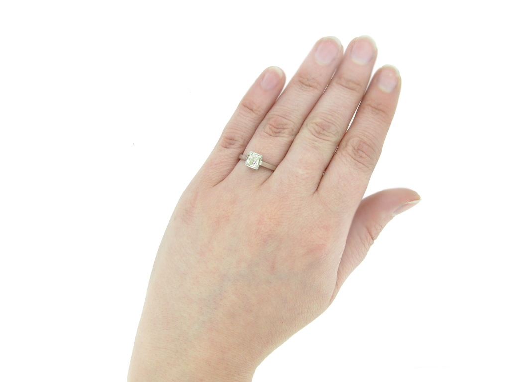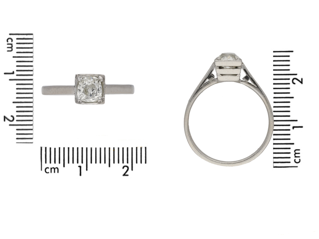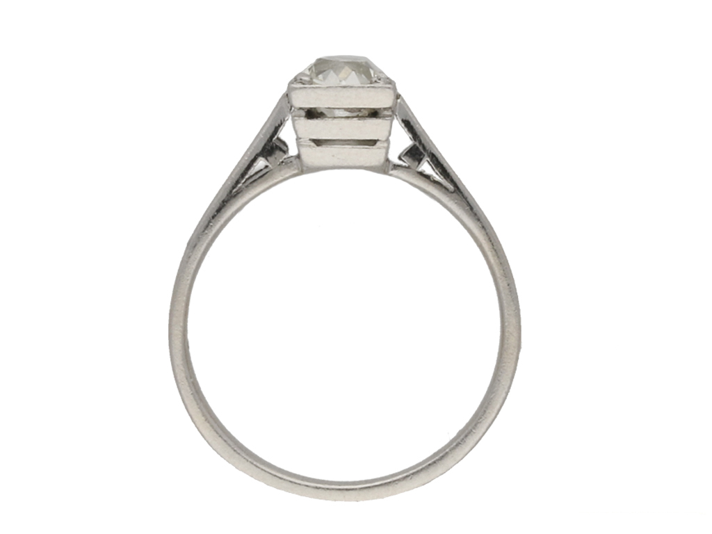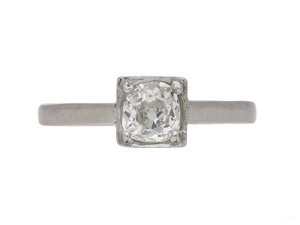 Art Deco diamond solitaire ring. Set with a cushion shape old mine diamond in an open back claw setting with an approximate weight of 0.70 carats, to a stylish solitaire design with a polished squared collet featuring pierced open linear details and shaped backholing, the raised squared open shoulders include geometric decoration and lead to a solid shank. Marked platinum, English, circa 1930.