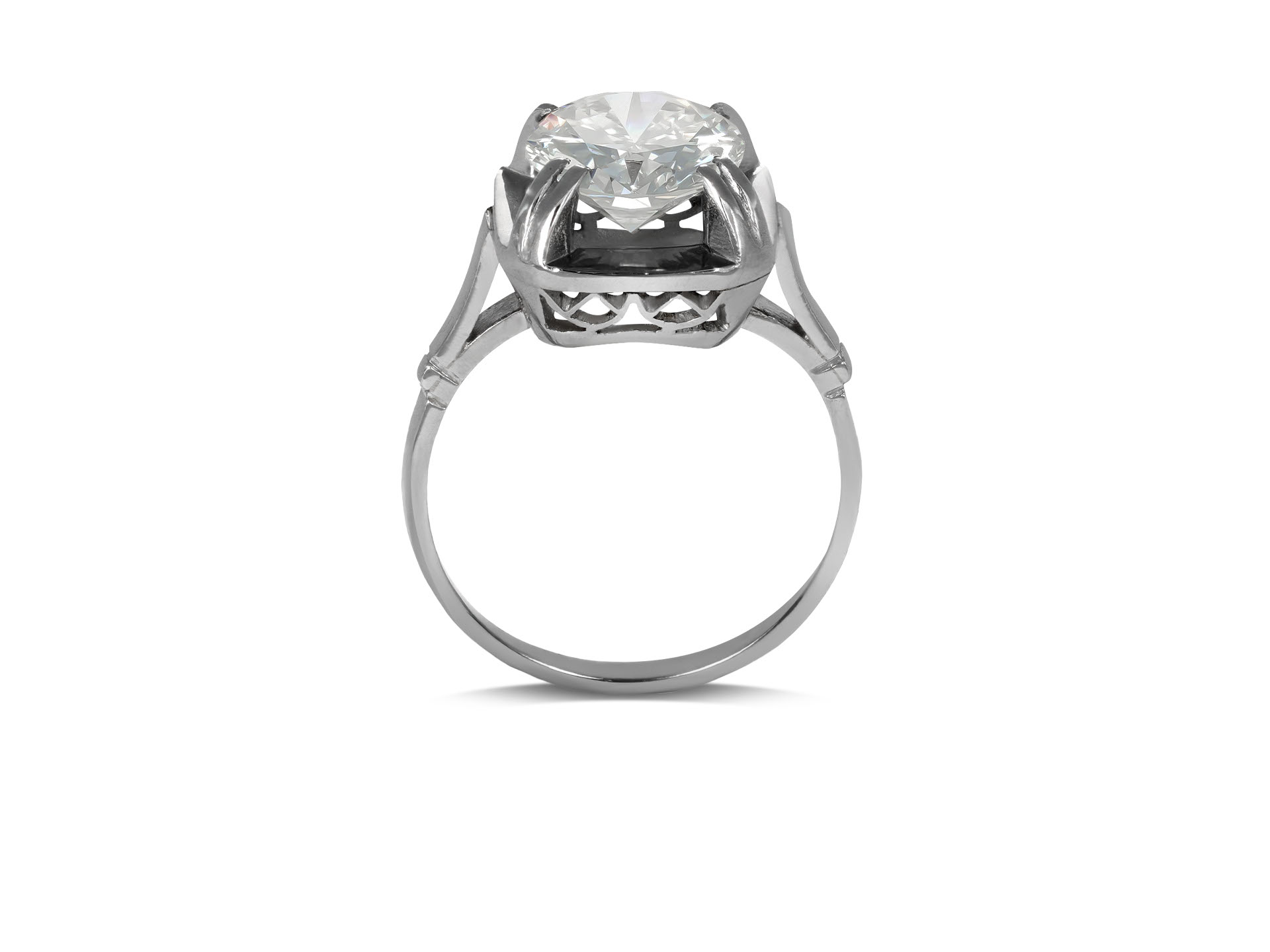 Art Deco diamond solitaire ring. Set to centre with a round old cut diamond, K colour, SI2 clarity, with a weight of 2.08 carats, in an open back claw setting, to an impressive geometric design featuring engraved claw detail, a decoratively pierced gallery and fancy open backholing, leading to raised squared shoulders which terminate in ridged detail and flow through to a solid shank. Marked platinum, indistinct maker's mark, French, circa 1935, accompanied by Gemological Institute of America (GIA) report #7235051965