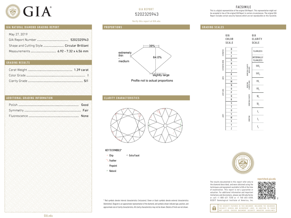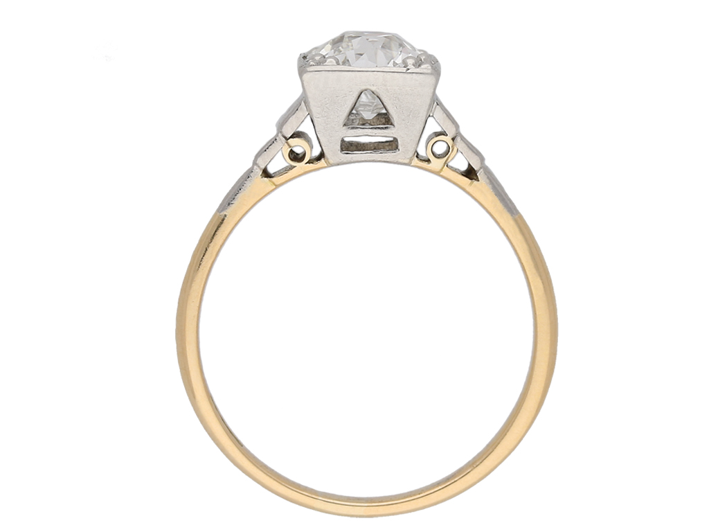 Art Deco diamond solitaire ring. Set with a single round old cut diamond, I colour, SI1 clarity, with a weight of 1.39 carats in an open back grain and rubover setting, to a linear solitaire design featuring a square collet, a geometrically pierced gallery and open square backholing, leading to stepped shoulders and flowing through to a smooth D-shape shank. Tested 18 carat yellow gold and platinum, circa 1935, accompanied by Gemmological Institute of America (GIA) report #5202325943.