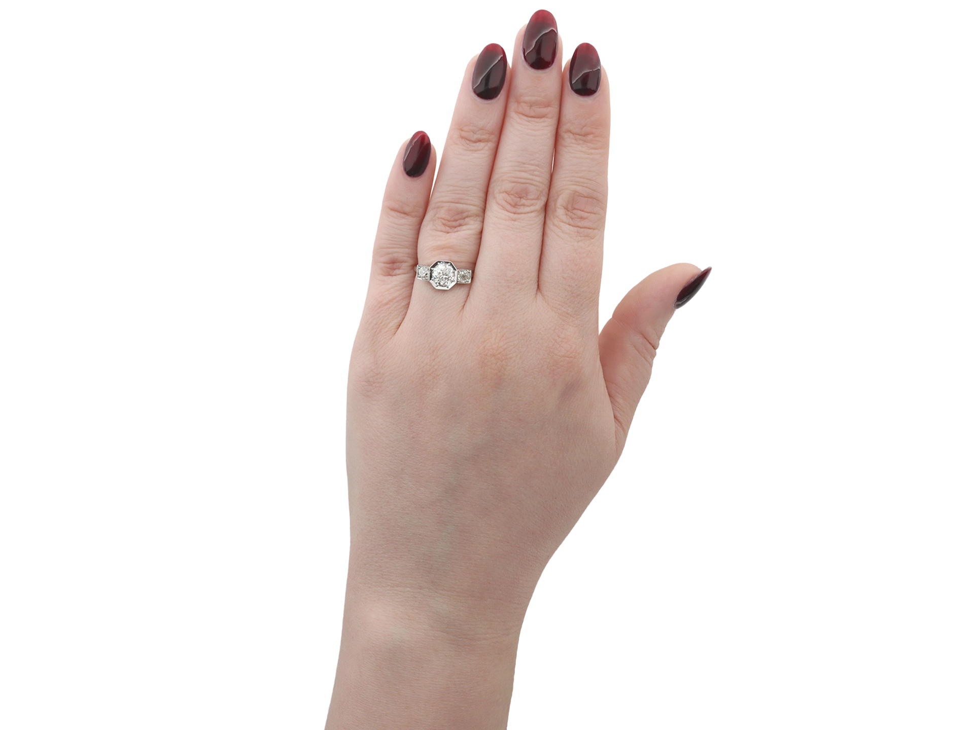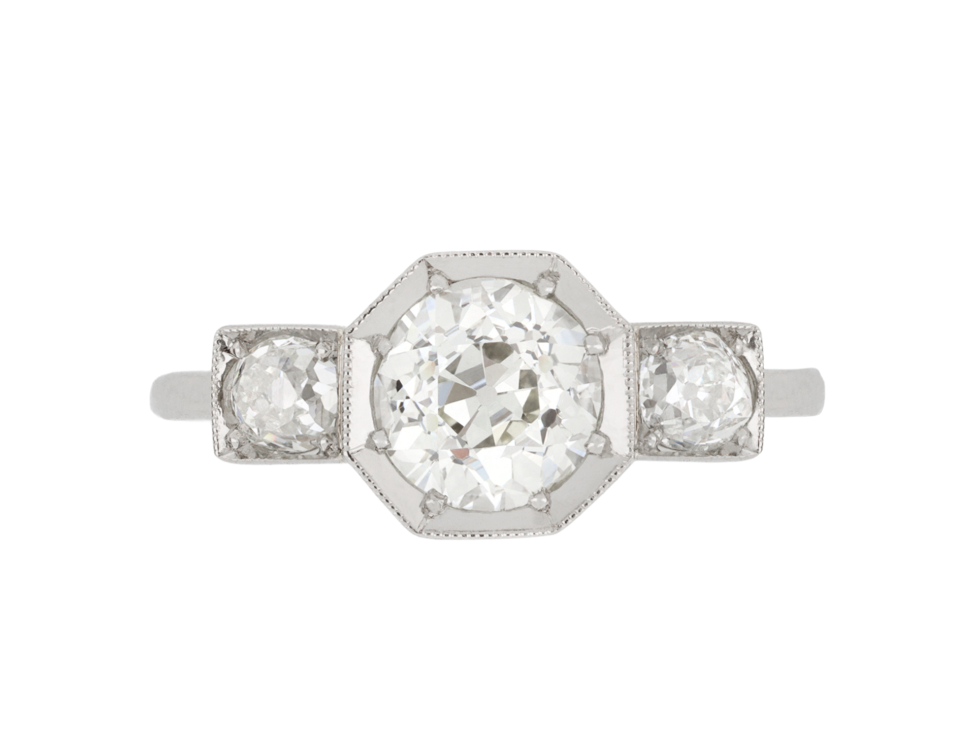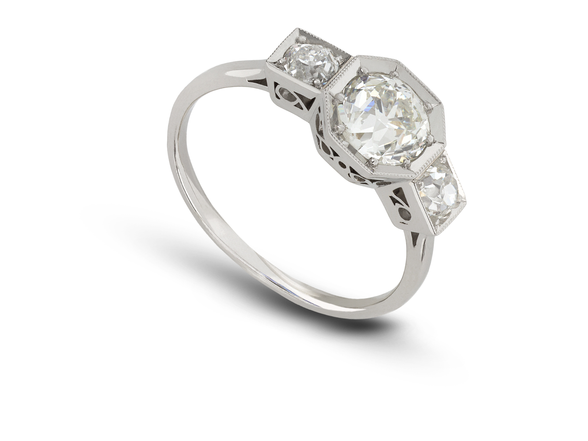 Art Deco diamond three stone ring. Set to centre with a round old cut diamond in an open back grain setting with an approximate weight of 1.20 carats, further set with two round old cut diamonds in open back grain settings with a combined weight of 0.40 carats. The total approximate diamond weight is 1.60 carats, to an elegant geometric three stone featuring an octagonal collet with millegrain borders, a finely pierced gallery with scrolling motifs and fancy open backholing leading to raised shoulders and flowing through to a solid D-shape shank. Tested platinum, English, circa 1930.