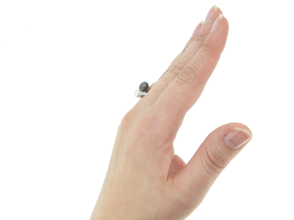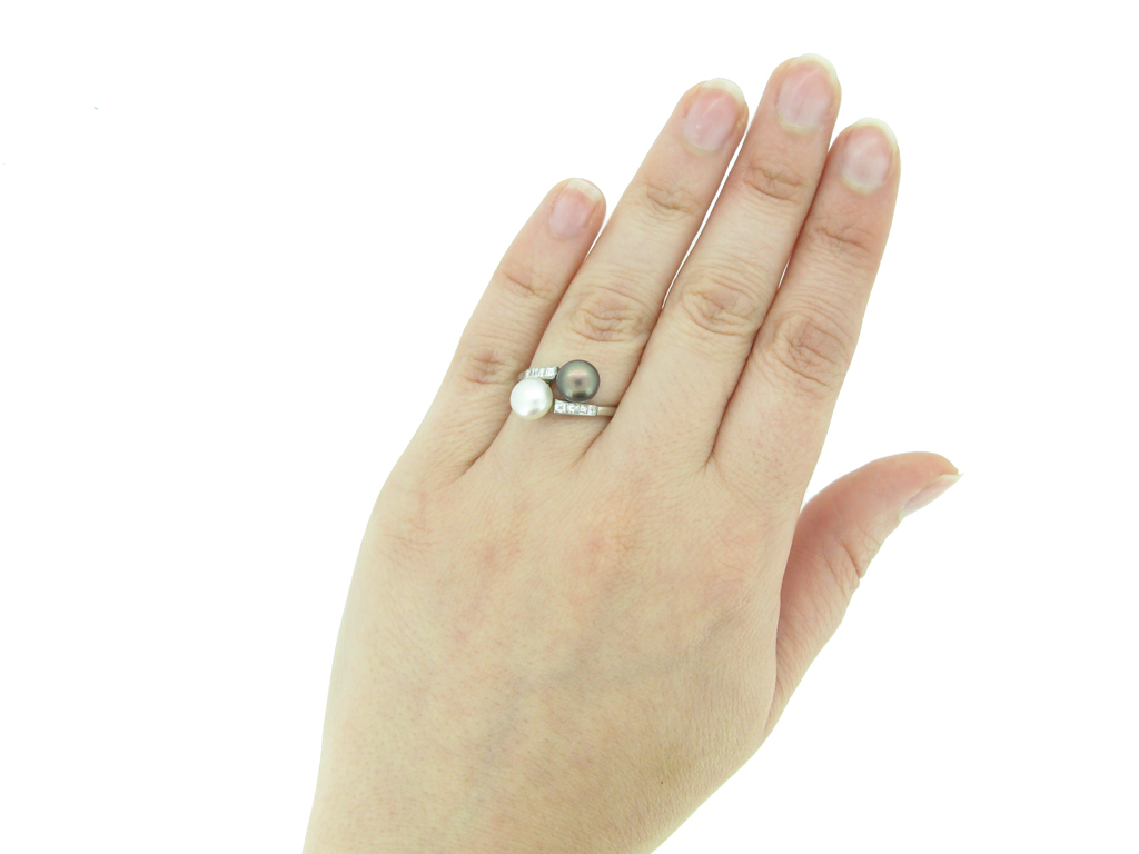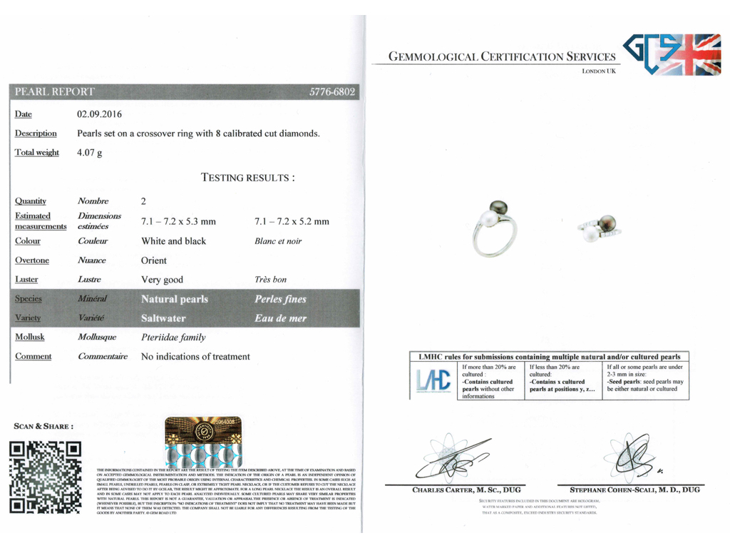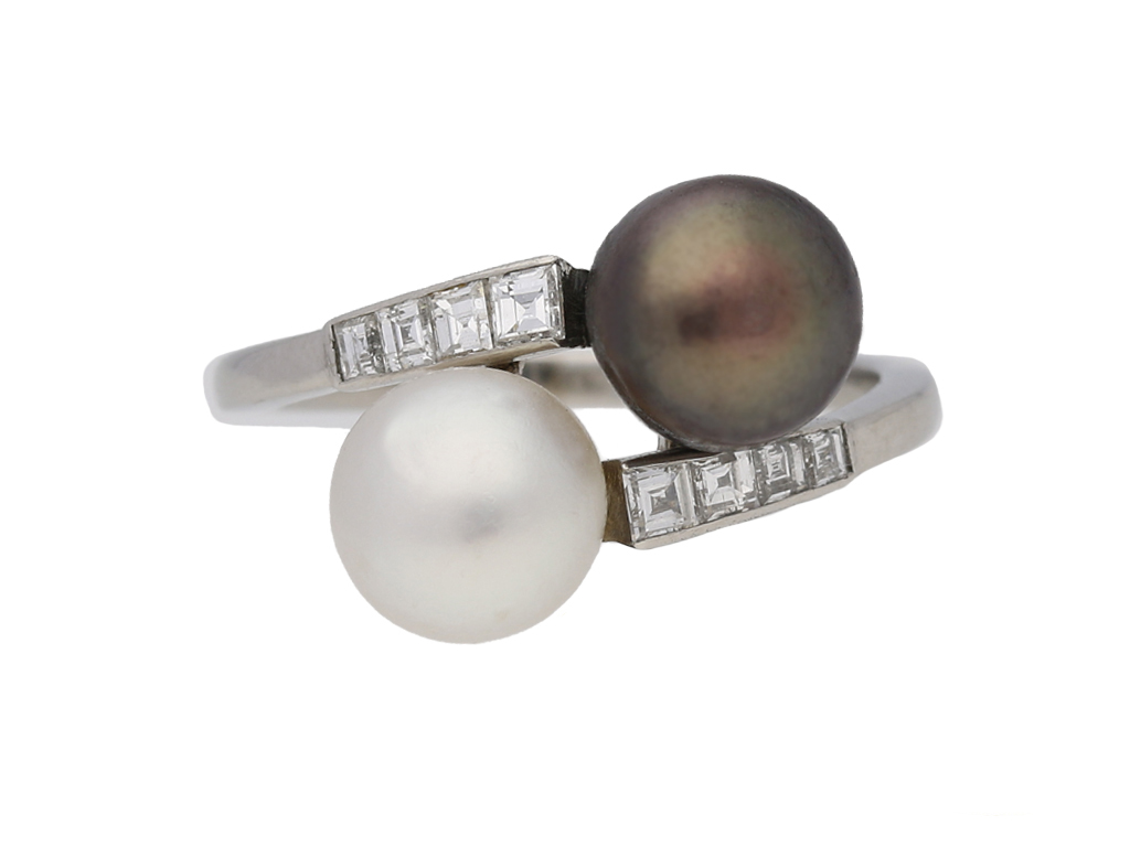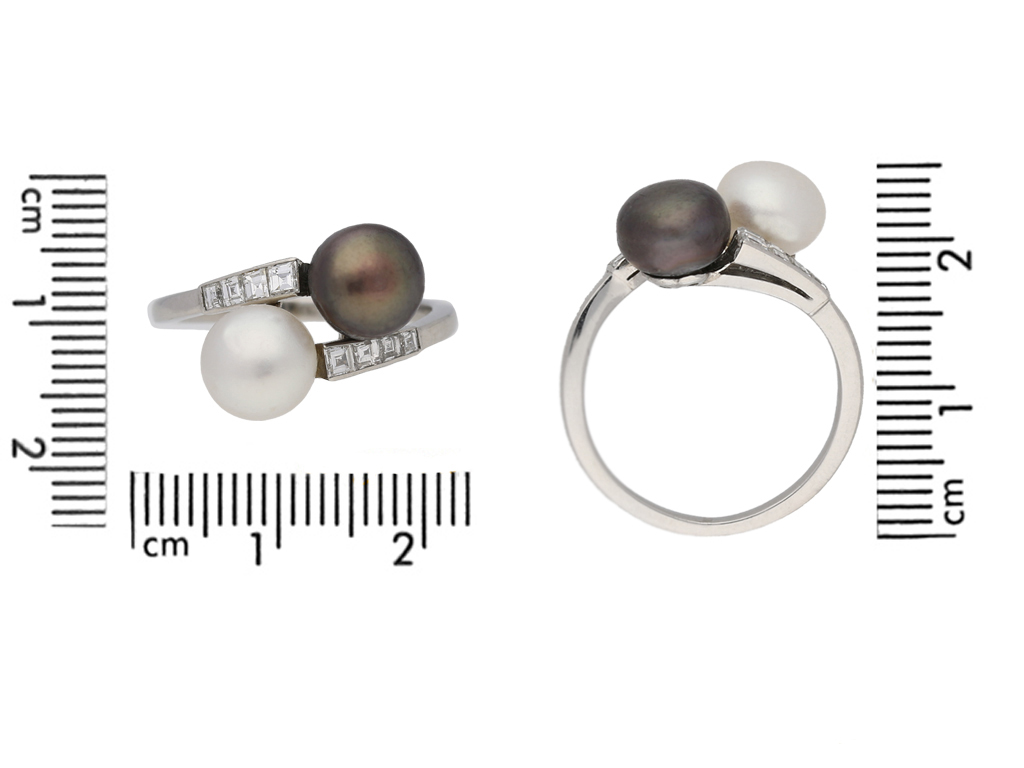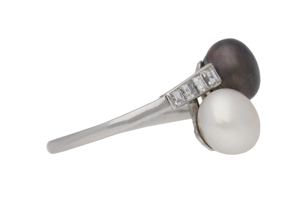 Art Deco natural pearl and diamond ring. Set with one round natural black saltwater pearl, approximately 7.1mm x 5.3mm in an open back setting, asymmetrically set with one round natural white saltwater pearl, approximately 7.1mm x 5.2mm in an open back setting, decorated with eight square baguette cut diamonds in open back channel settings with a combined approximate weight of 0.35 carats, to an elegant crossover form with finely filed gallery and fancy backholing, the trumpeting shoulders curve smoothly to a solid shank. Tested platinum, circa 1935, accompanied by Gemmological Certification Services report #5776-6802.