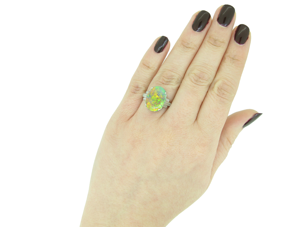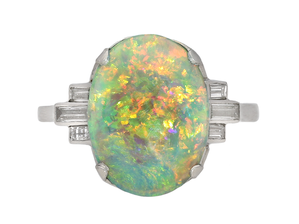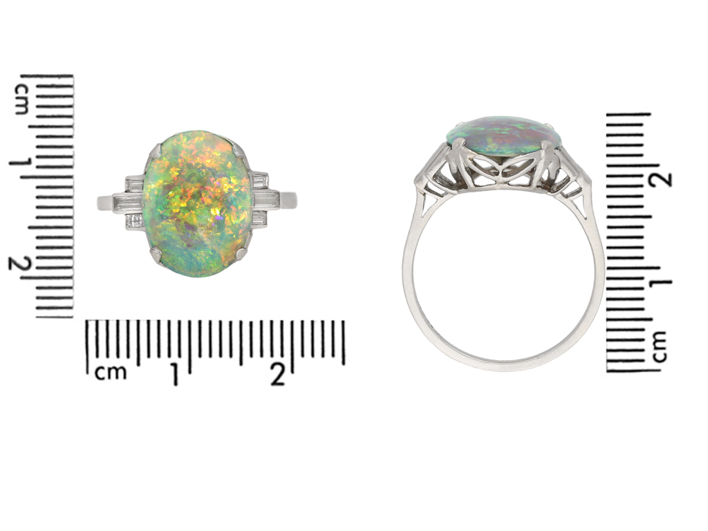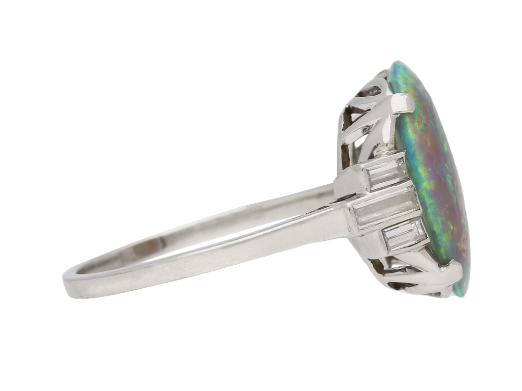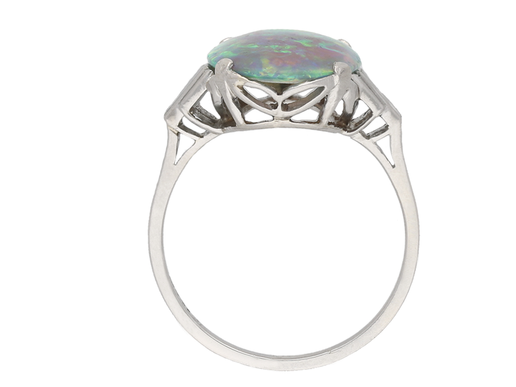Art Deco opal and diamond ring. Set to the centre with an oval cabochon natural opal in an open back claw setting with an approximate weight of 3.50 carats, further set with six rectangular baguette cut diamonds in open back rubover settings with a combined approximate weight of 0.60 carats, to a striking flanked solitaire design with curving claws, an intricately pierced gallery with foliate motifs and fancy shaped backholing, flanked by geometric trumpeting split shoulders flowing through to a solid slim shank. Marked platinum, English, circa 1925.