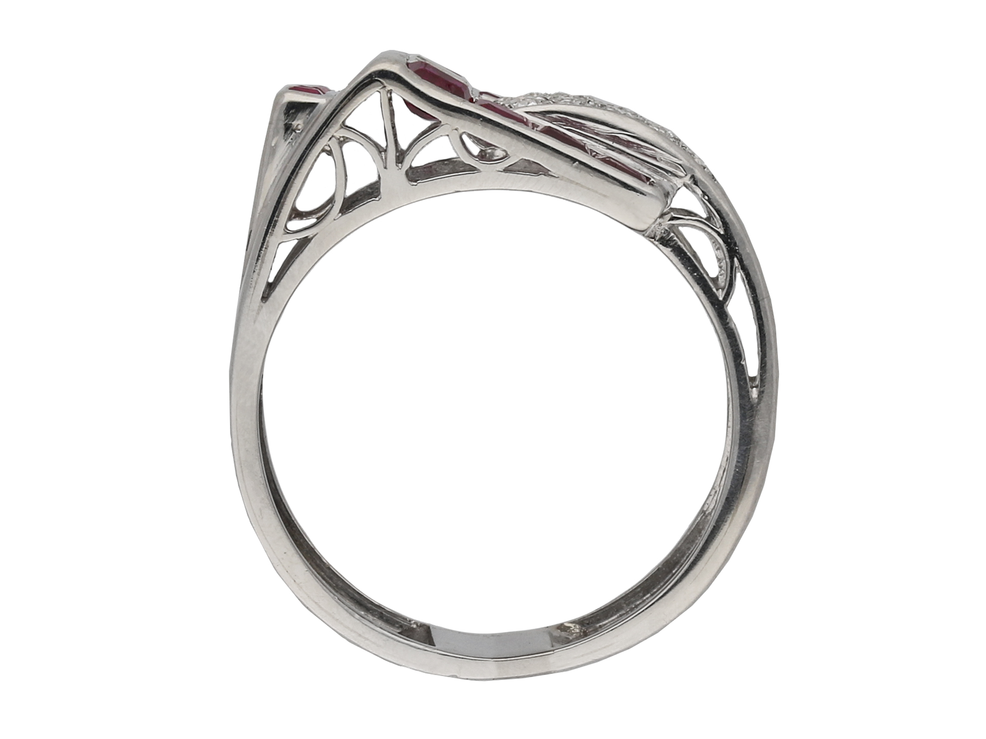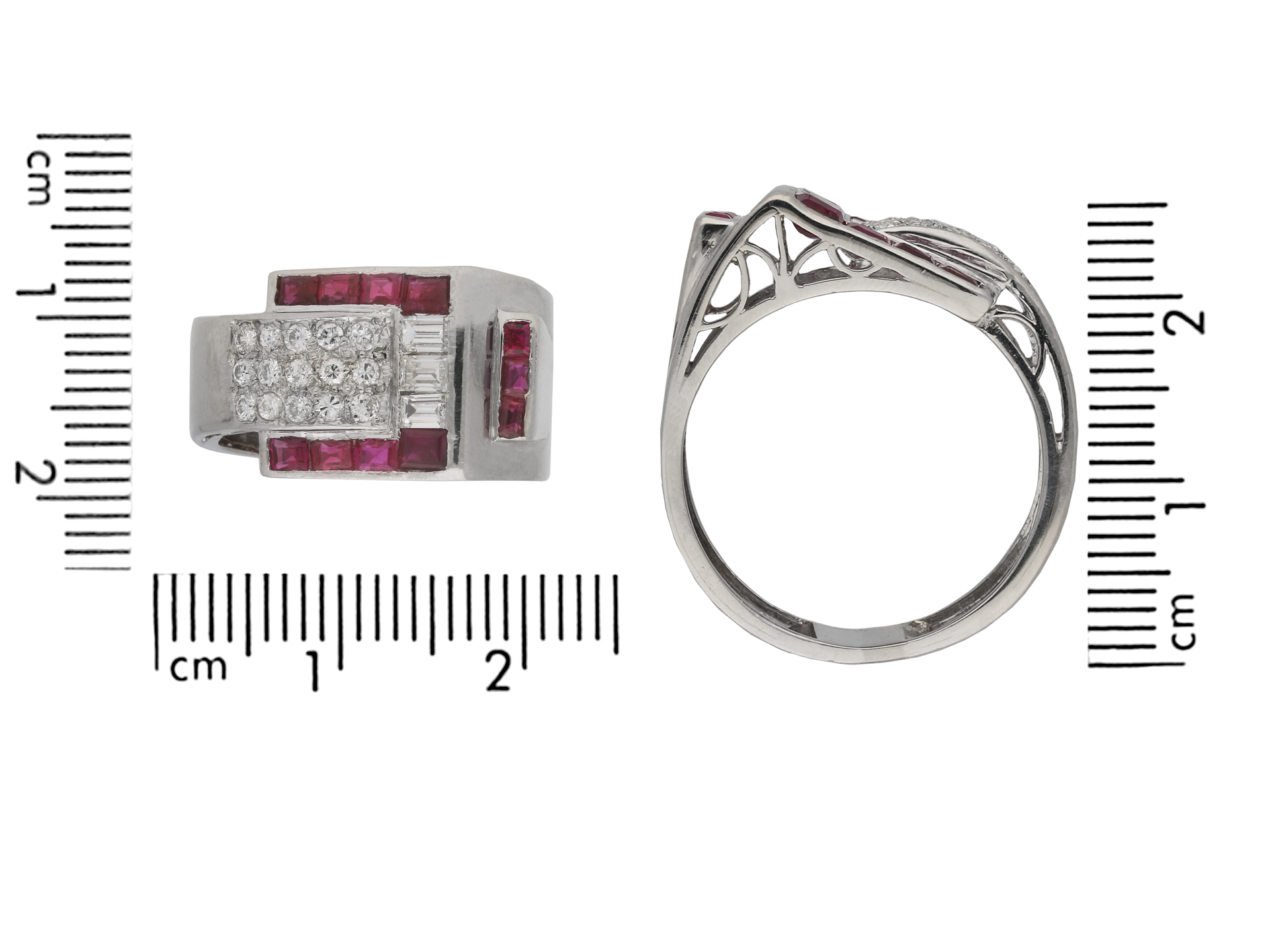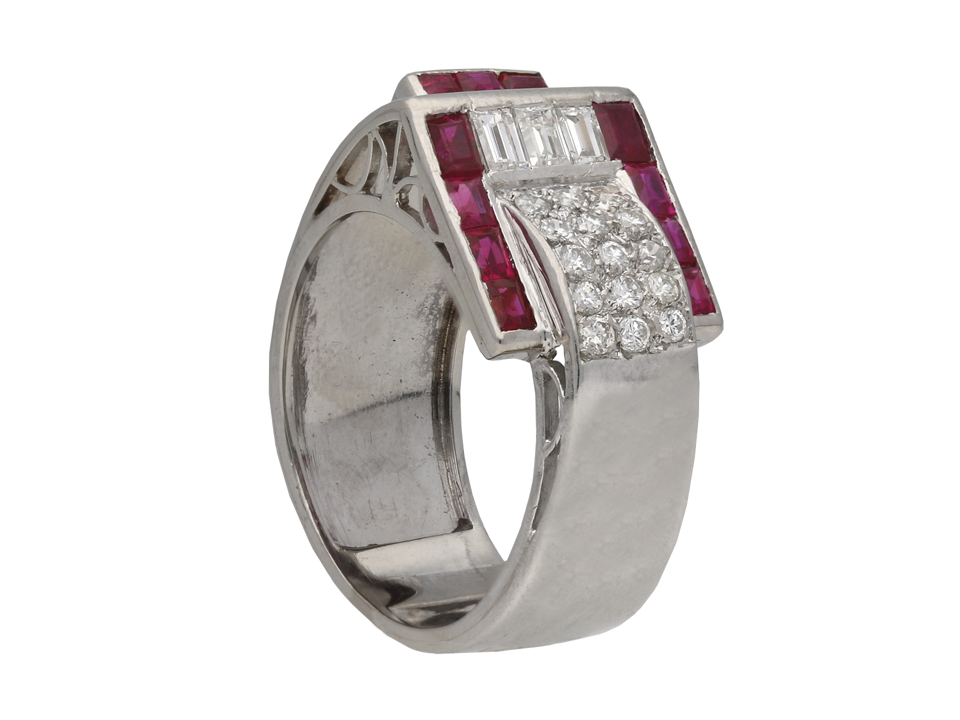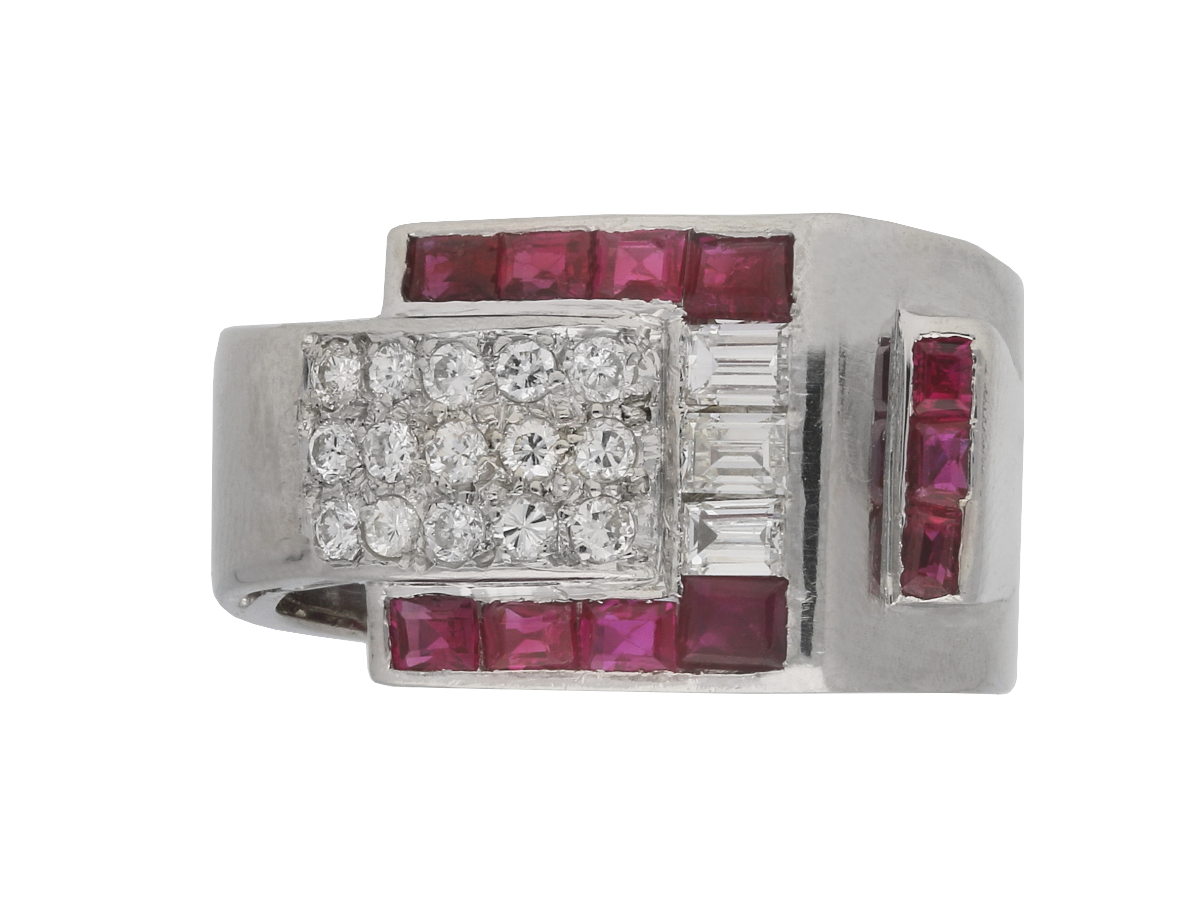 Art Deco ruby and diamond cocktail ring, circa 1935. The rectangle baguette cut rubies are channel set with rubover settings, to two horizontal rows of four and one vertical row of three, with an approximate weight of 1.10 carats, framing a row of three channel set baguette cut diamonds, with an approximate weight of 0.30 carats. To the centre are fifteen round old cut diamonds with an approximate weight of 0.45 carats, grain set and to a rectangular form. The approximate total diamond weight is 0.75 carats. All set to a heavy asymmetric bezel of pierced geometric design, with a sold platinum shank, circa 1935.
