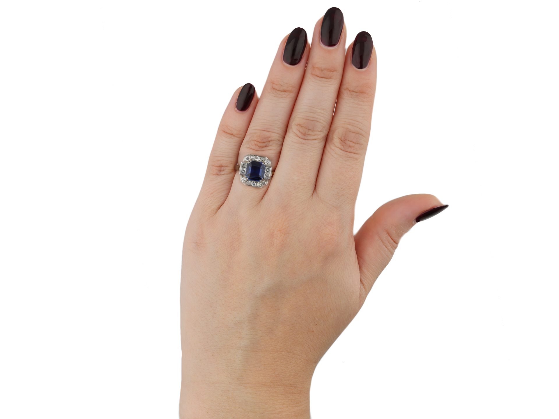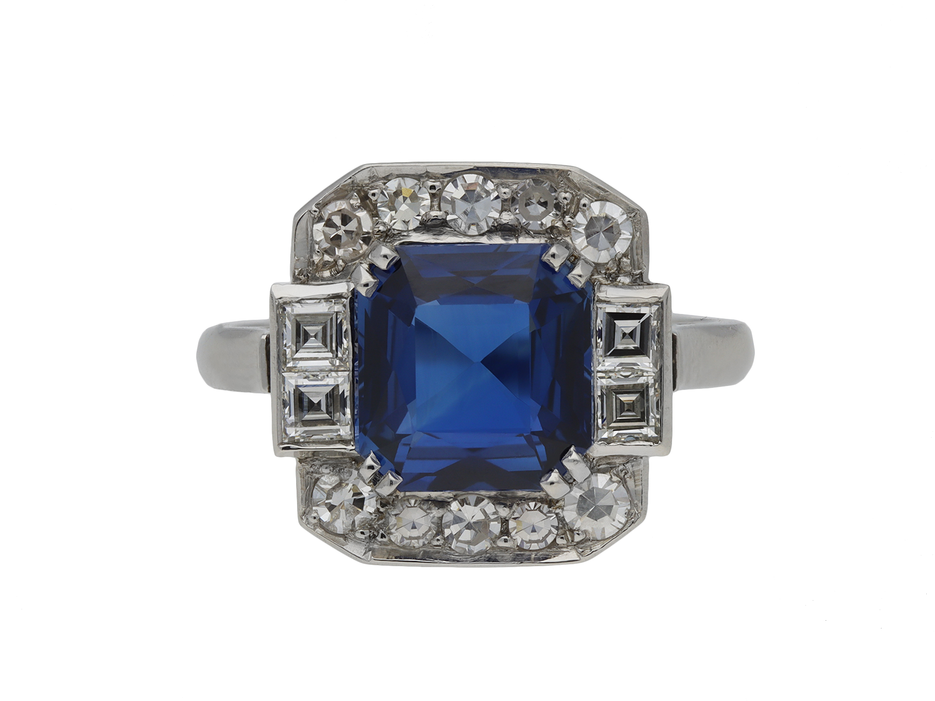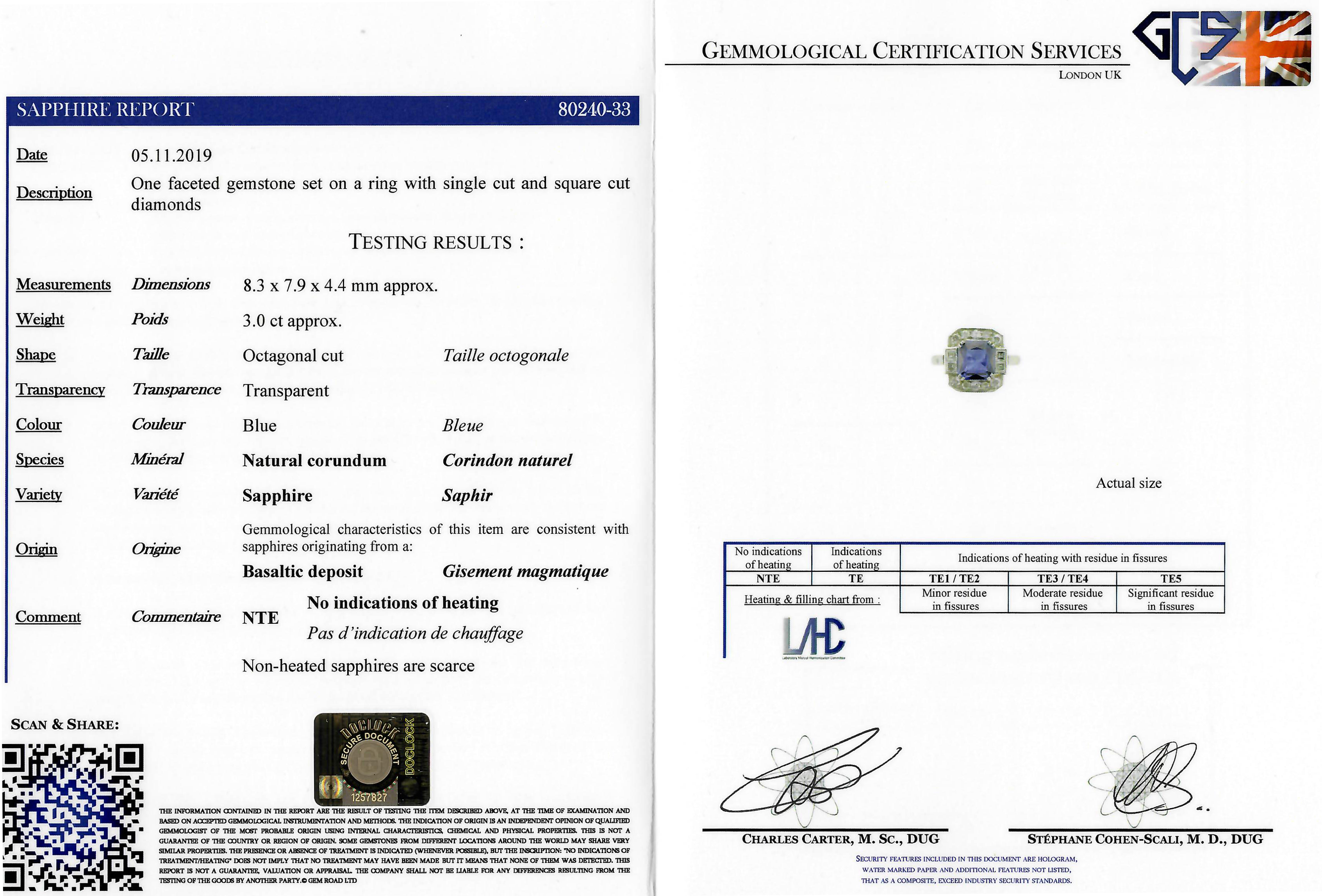Art Deco sapphire and diamond cluster ring. Set with an octagonal scissor cut natural unenhanced sapphire in an open back claw setting with an approximate weight of 3.10 carats, further set with four square step cut diamonds in open back rubover settings with a combined approximate weight of 0.40 carats, encircled by a row of ten round eight cut diamonds in open back grain settings with a combined weight of 0.40 carats. The total approximate diamond weight is 0.80 carats, to a geometric cluster design featuring split corner claws, a scrolling openwork gallery and fancy open backholing, flanked by trumpeting split shoulders with cheniers, flowing through to a solid D-shape shank. Marked platinum, English, circa 1935, accompanied by Gemmological Certification Services report #80240-33.
