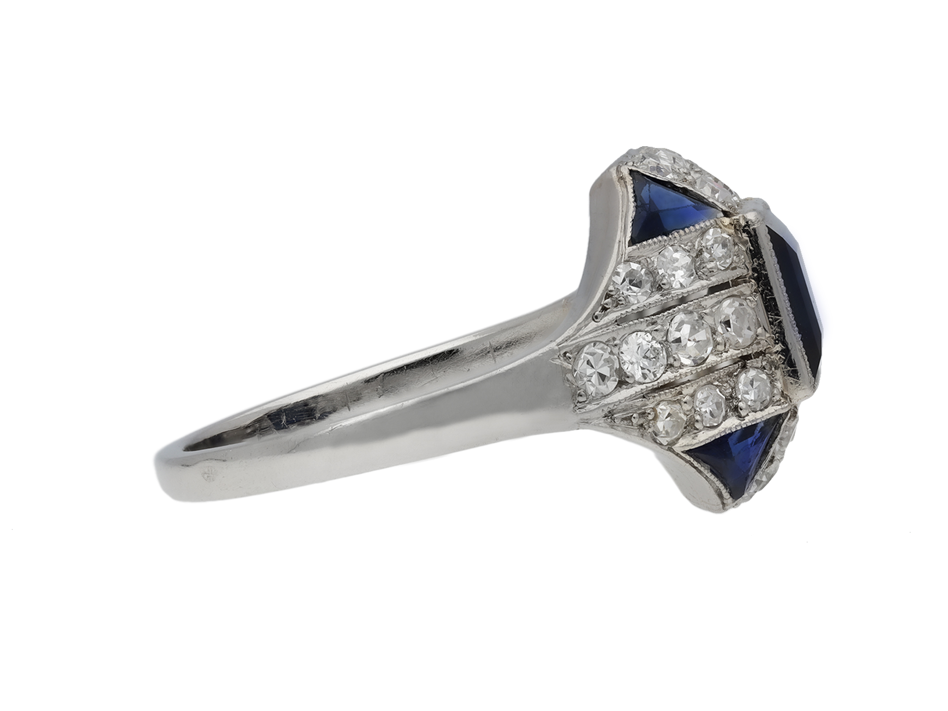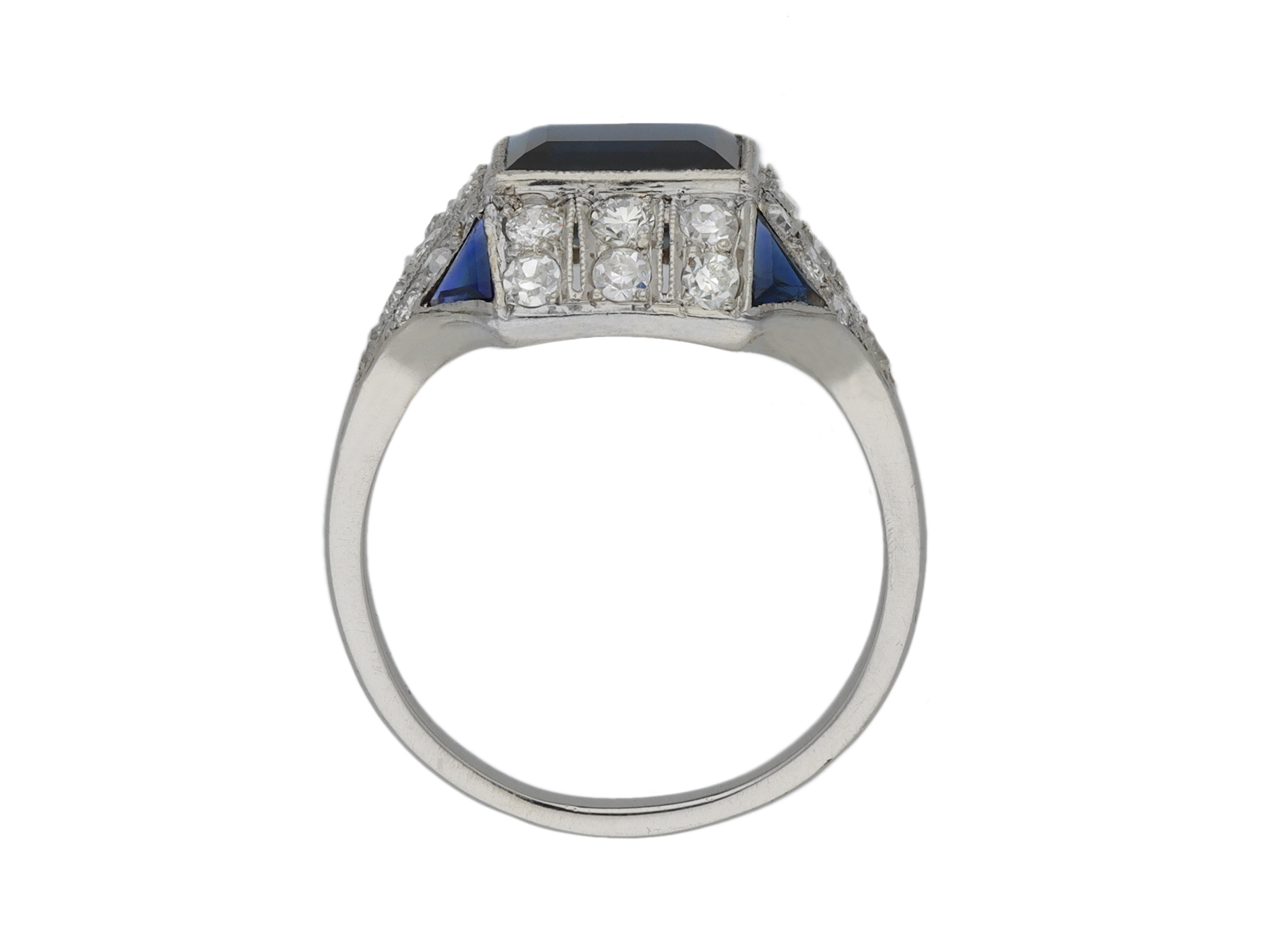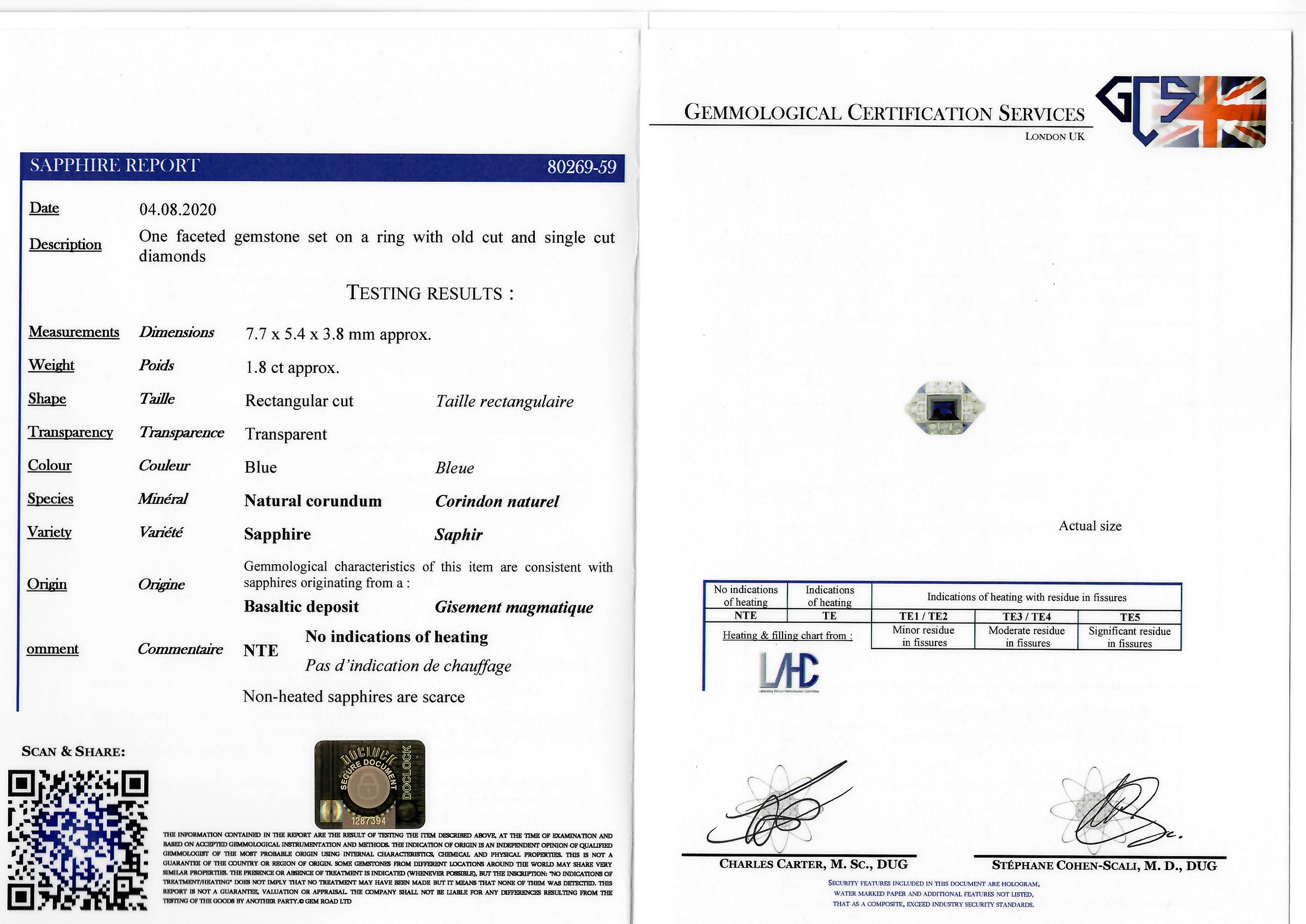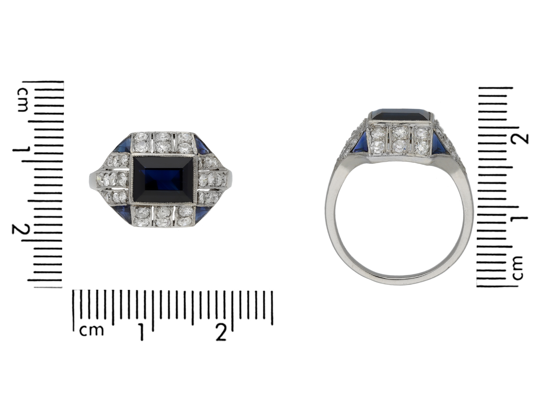 Art Deco sapphire and diamond cluster ring. Set with one central rectangular step cut natural unenhanced sapphire in an open back rubover setting with an approximate weight of 1.80 carats, further set with thirty two round old cut diamonds in open back grain settings, with a combined approximate weight of 1.00 carats, further adorned with four calibre cut natural unenhanced sapphires in open back rubover settings with a combined weight of 0.80 carats. The total approximate sapphire weight is 2.80 carats, to a geometric openwork cluster design featuring a pierced bezel, fine millegrain edging and fancy open backholing, flanked by trumpeting shoulders flowing through to a solid tapered square shank. Marked platinum, French, circa 1930, accompanied by Gemmological Certification Services (GCS) report #80269-59.
