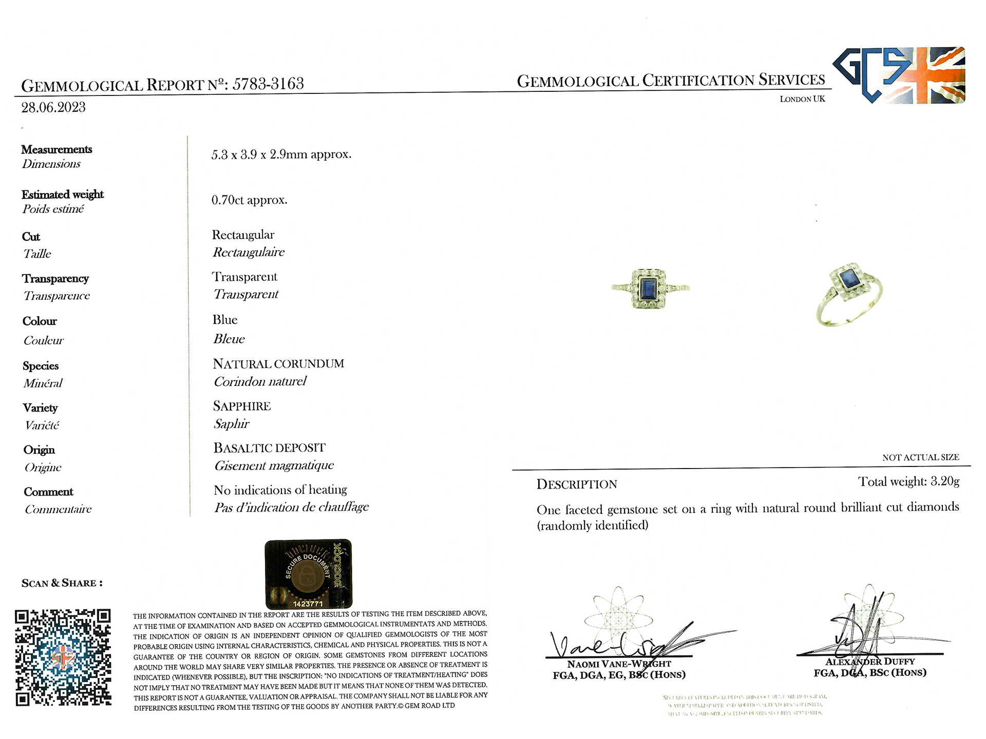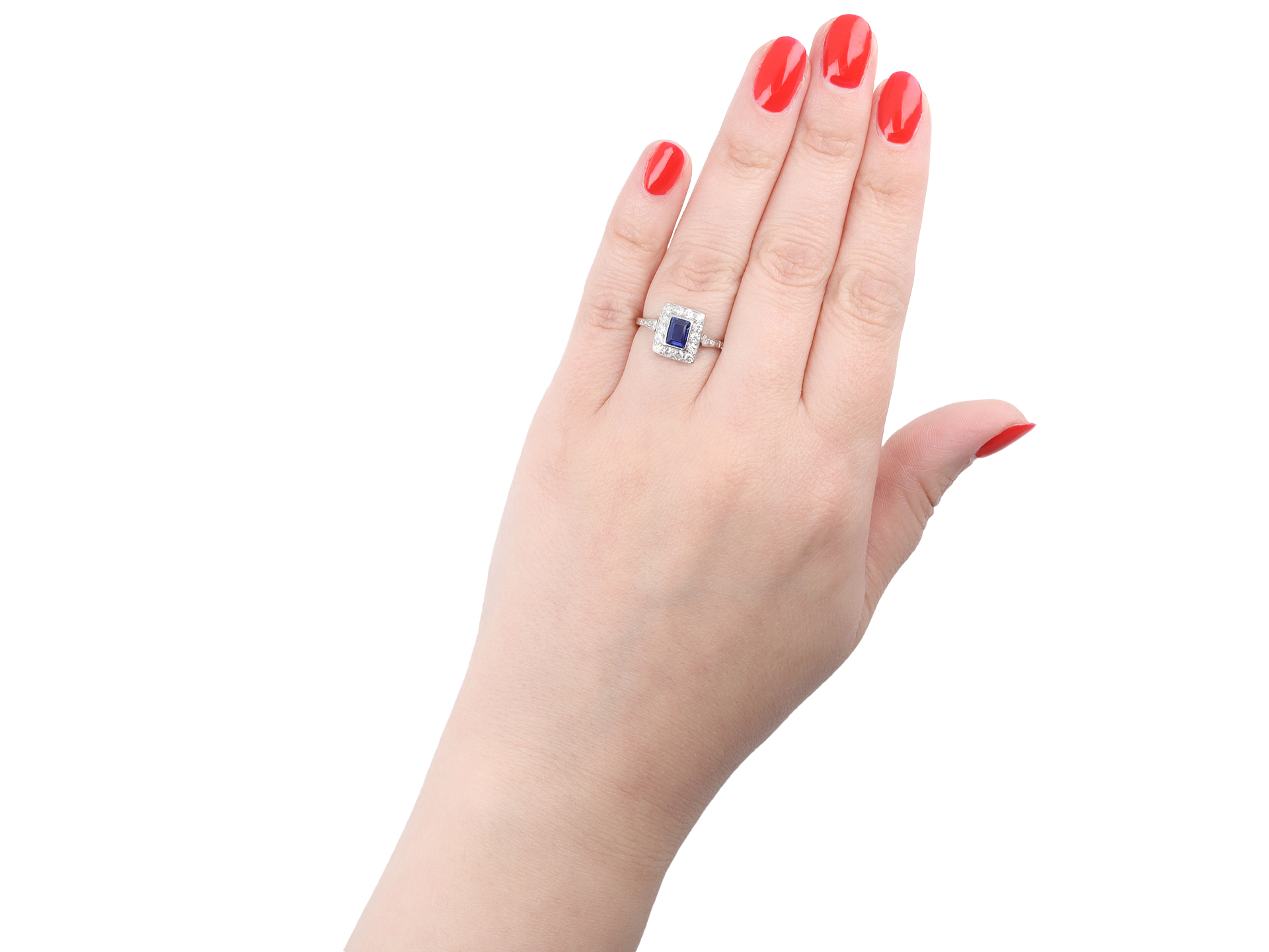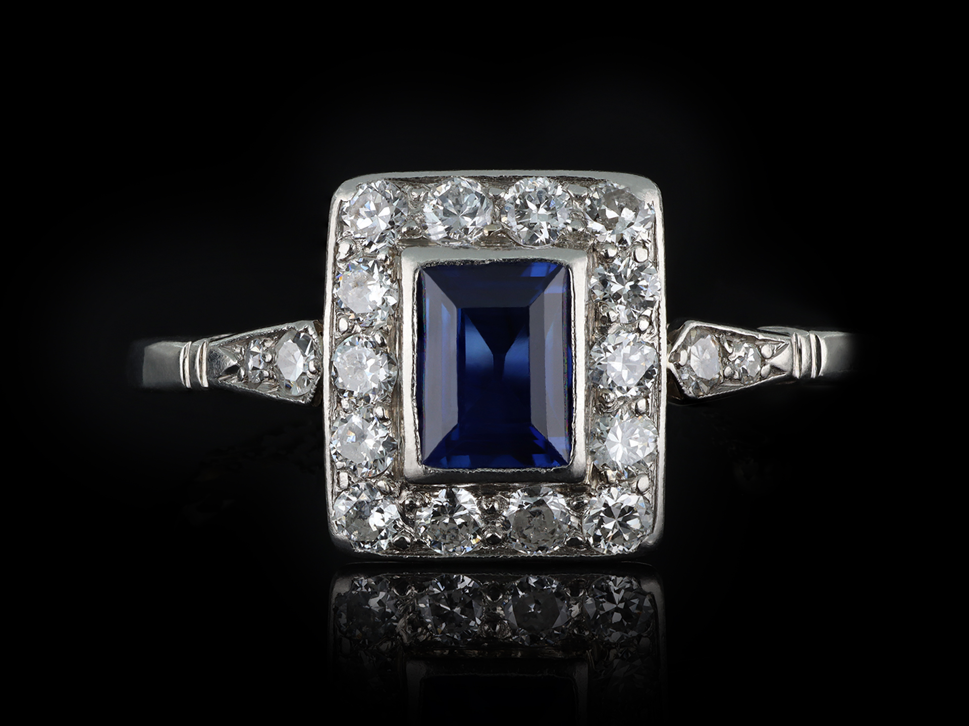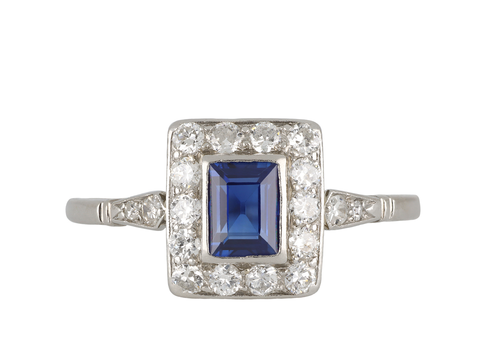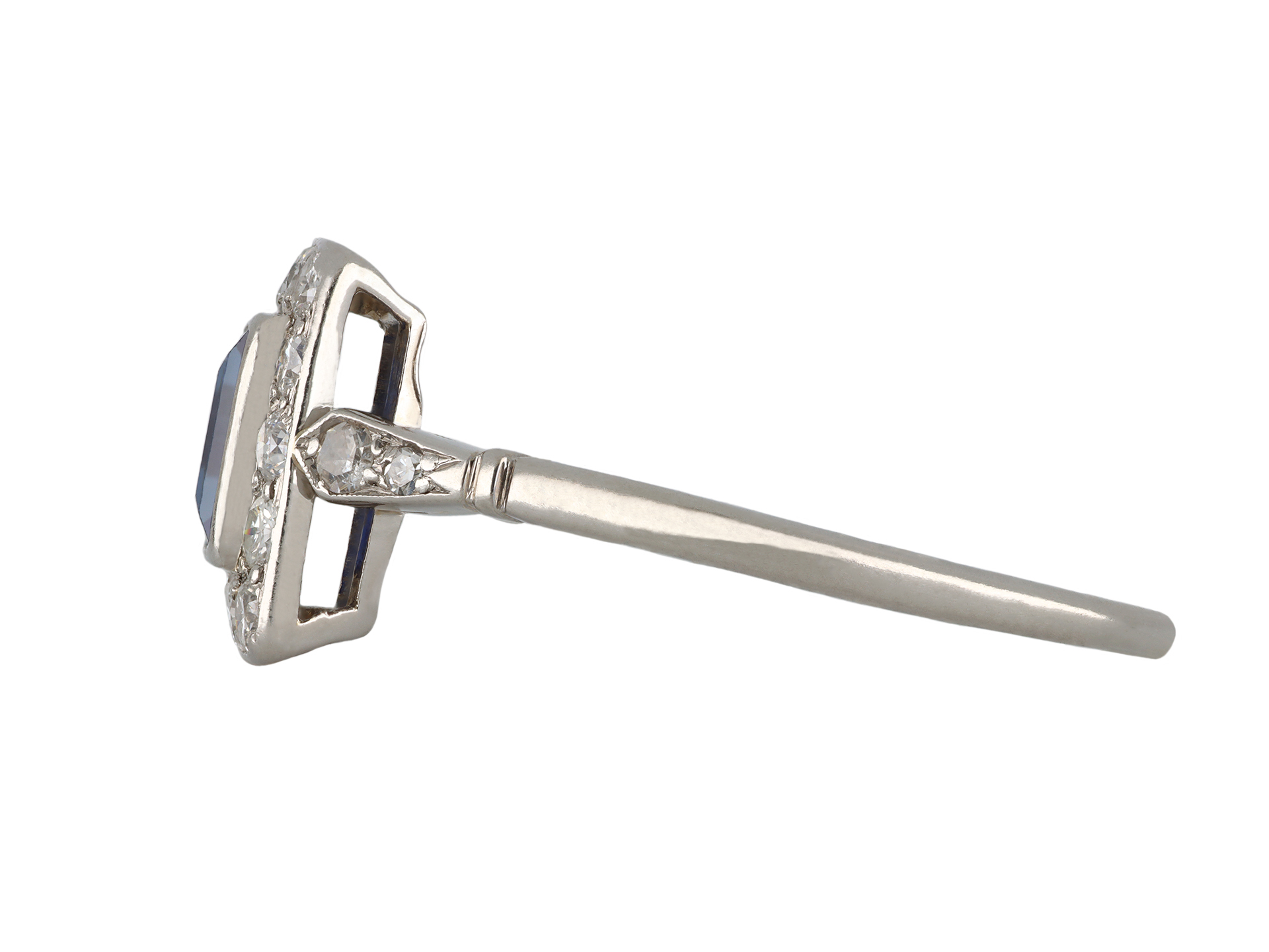 Art Deco sapphire and diamond coronet cluster ring. Set to centre with a rectangular step-cut natural unenhanced sapphire in an open back rubover setting with an approximate weight of 0.70 carats, encircled by fourteen round transitional cut diamonds in open back grain settings, with a combined approximate weight of 0.60 carats, further set with four round eight-cut diamonds in open back grain settings with a combined weight of 0.08 carats. The total approximate diamond weight is approximately 0.68 carats, to a geometric coronet cluster design featuring smooth borders, a linear open gallery and fancy open backholing, flanked by raised shoulders that terminate in ridged detailing, flowing through to a solid D-shape shank. Tested platinum, circa 1935, accompanied by Gemmological Certification Services report #5783-3163.