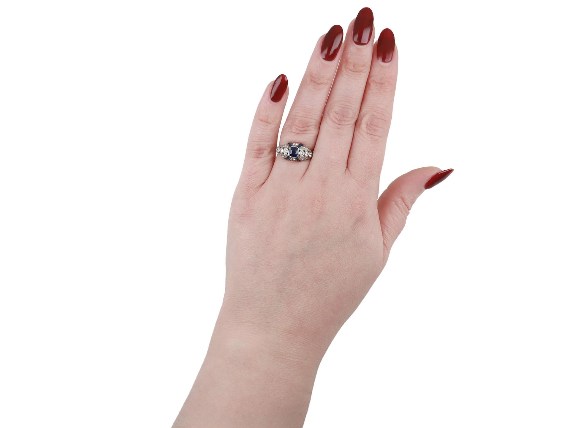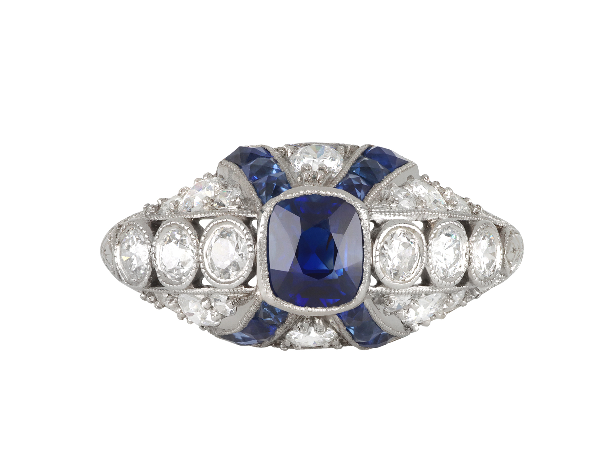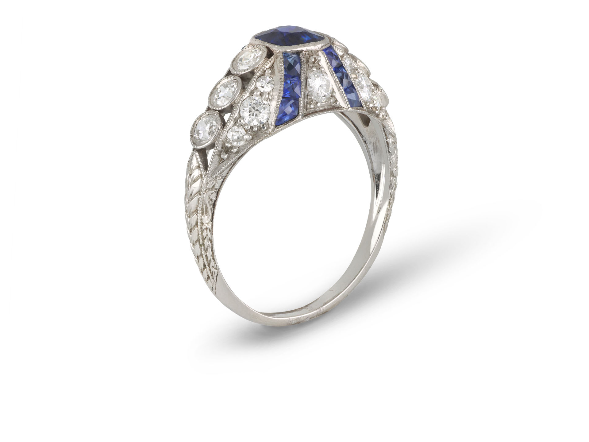 Art Deco sapphire and diamond ring. Centrally set with a cushion shaped old cut natural unenhanced sapphire in an open back rubover setting with a weight of 0.75 carats, issuing twelve tapered french cut natural unenhanced sapphires in open back channel settings with a combined weight of 1.00 carats, and further enhanced by twenty round old cut in open back grain and rubover settings with an approximate combined weight of 1.00 carats. The total approximate sapphire weight is 1.75 carats, all to an ornate bombé cluster design with millegrain and openwork decoration, the pierced fancy backholing proceeding to finely engraved foliate shoulders and terminating in a solid D-shape shank. Tested platinum, circa 1920.