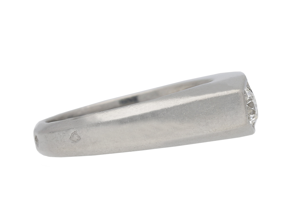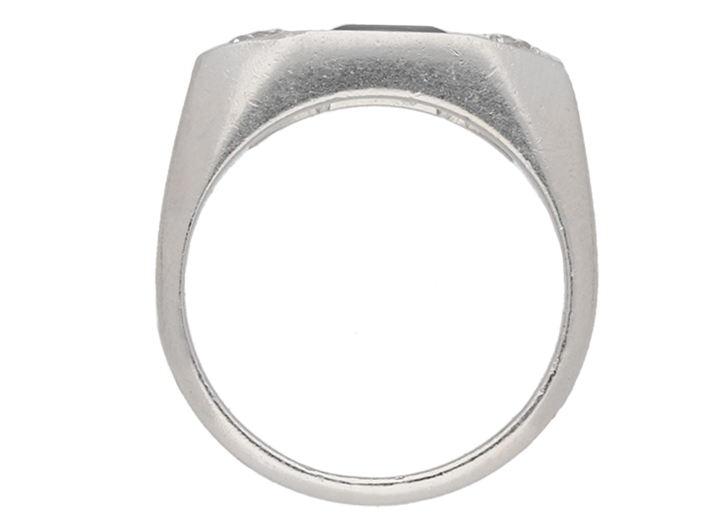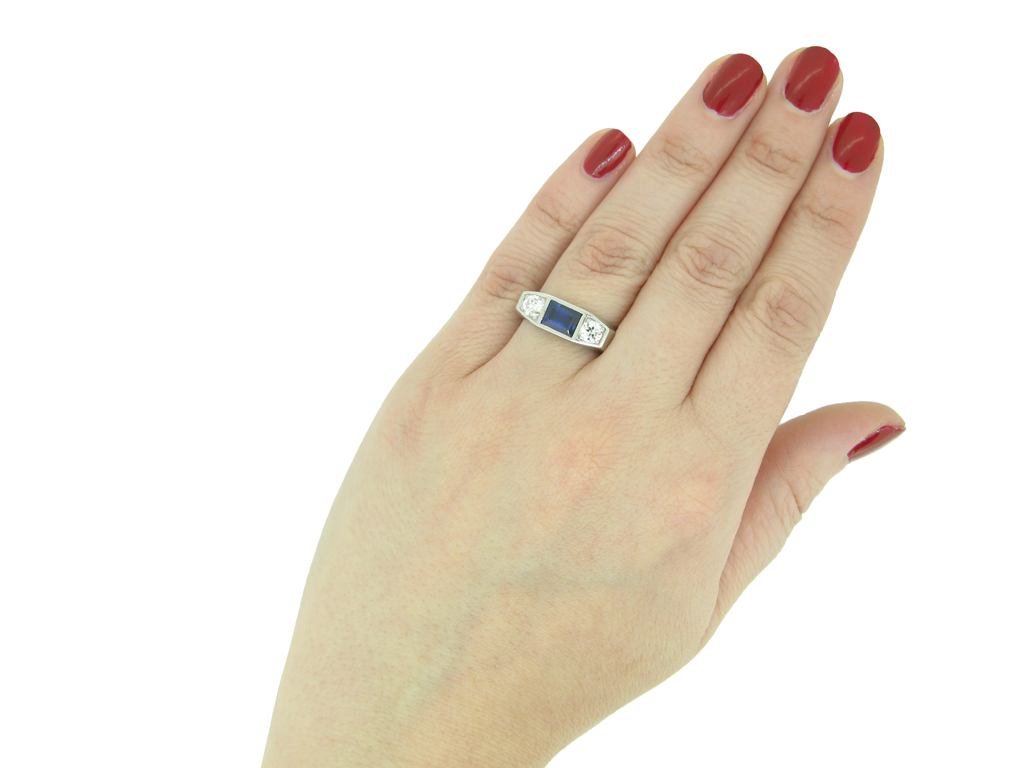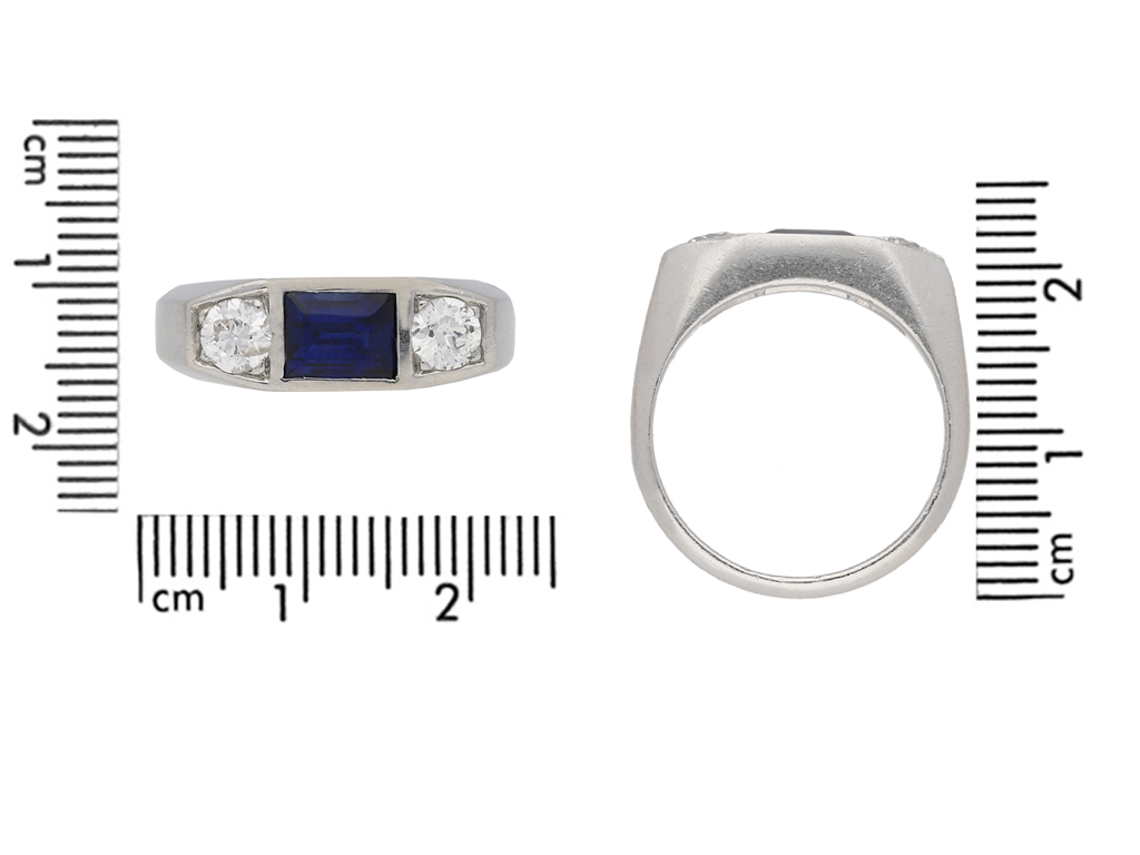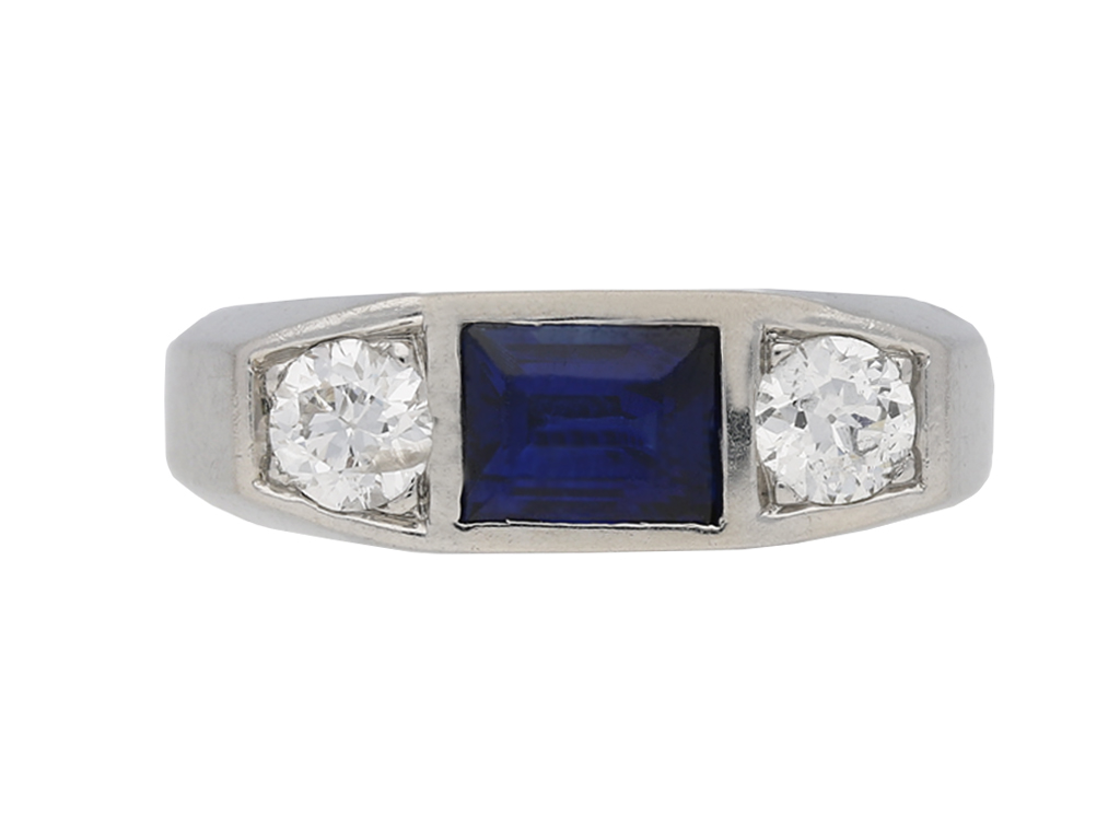 Art Deco sapphire and diamond three stone ring. Set to centre with a rectangular step cut natural unenhanced sapphire in an open back rubover setting with an approximate weight of 1.00 carats, further set with two round old cut diamonds in open back grain settings with an approximate combined weight of 0.70 carats, to a geometric design featuring polished edges and open backholing, the integrated shoulders leading to a solid D-shape shank. Marked platinum, maker's mark, numbered '25947', French, circa 1935, accompanied by Gemmological Certification Services report #79187-27.