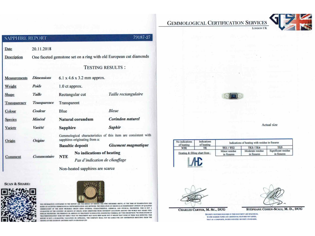 Gemstone Basaltic Unheated Sapphire, Step Cut, approximately 1ct 2 x Diamonds, Old Cut, approximately 0.7ct total