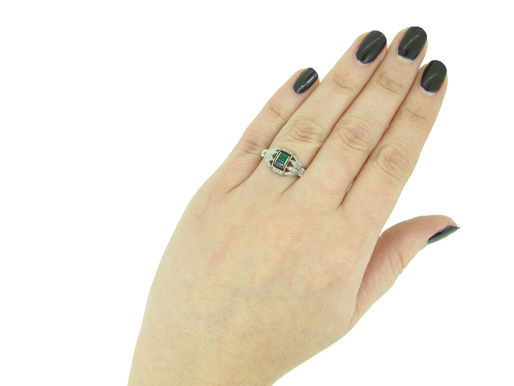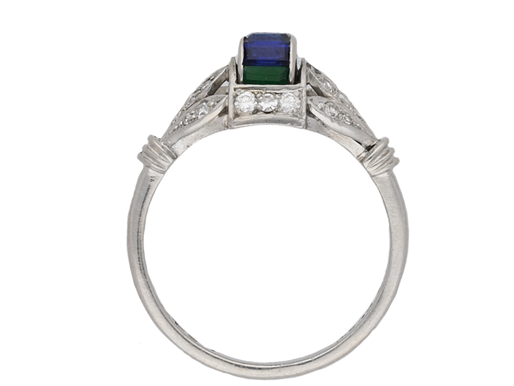 Art Deco sapphire, emerald and diamond barrel ring. Set to center with four rectangular baguette cut natural emeralds in open back channel settings with a combined approximate weight of 0.50 carats, further set with four rectangular baguette cut natural unenhanced sapphires in open back channel settings with a combined approximate weight of 0.50 carats, further enhanced with twenty-six round eight cut diamonds in open back grain settings with a combined approximate weight of 0.50 carats, to an openwork cluster ring featuring an articulated barrel form to centre, polished edges and open backholing, flanked by openwork shoulders in a foliate motif which flow through to a solid D-shape shank. Tested platinum, maker's mark W & H Ltd, circa 1930.