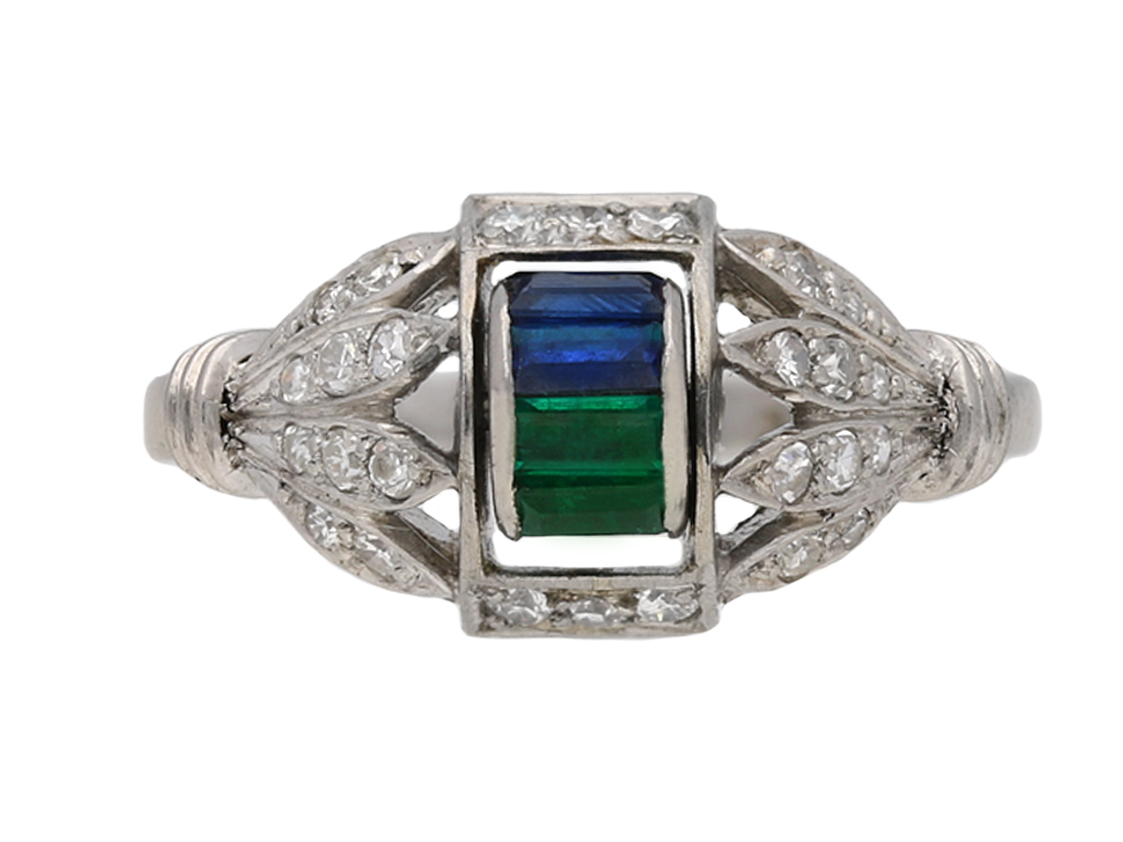 Art Deco sapphire, emerald and diamond barrel ring, circa 1930.