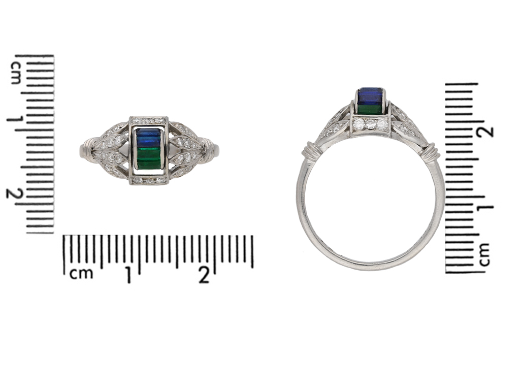 This ring has been assessed by our in-house gemmologists; The emeralds are most likely to be from the Colombian mines. The sapphires are most likely to be from the Burma mines.