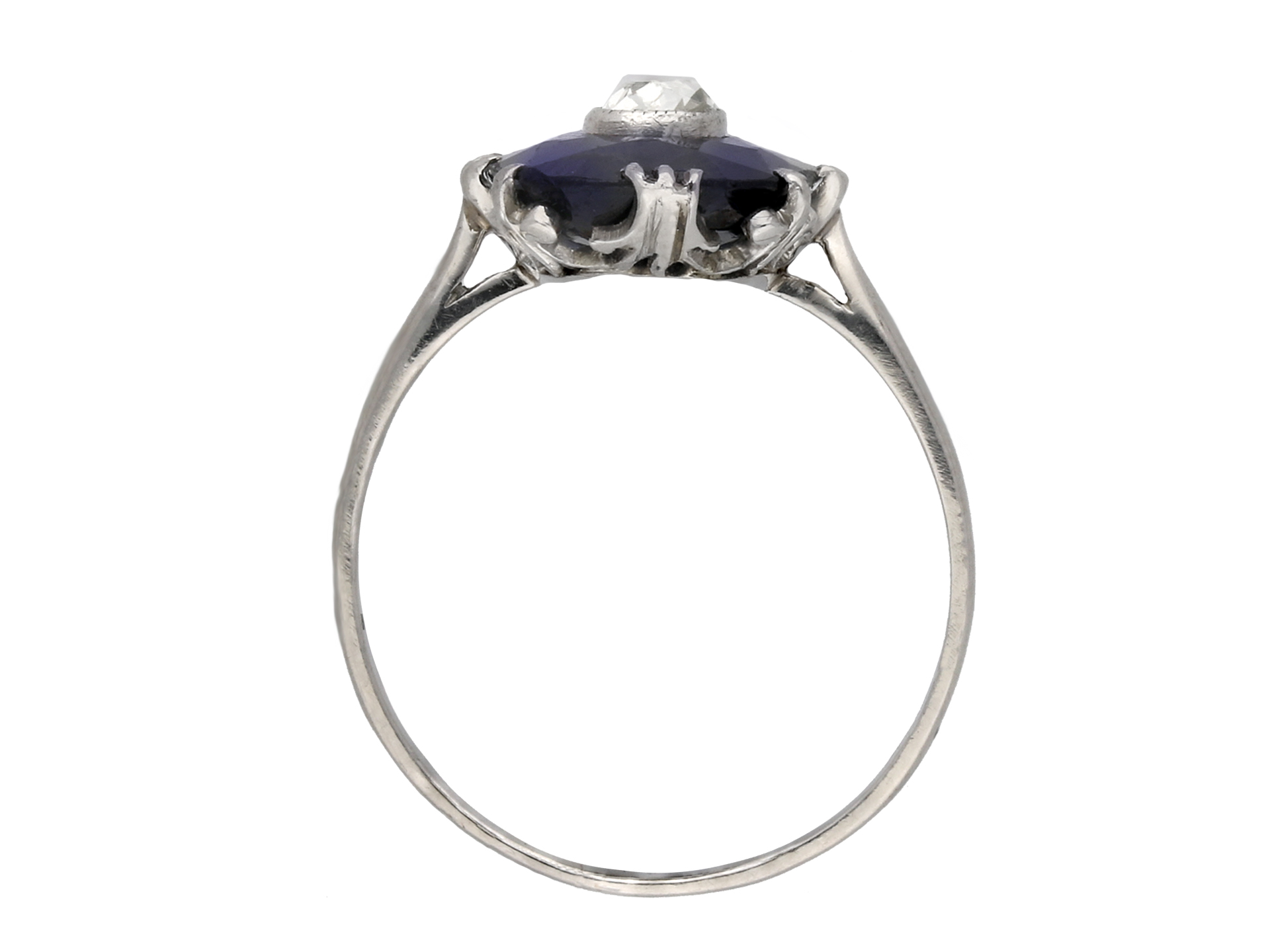 Art Deco sapphire ring with diamond set centre. Set to centre with a cushion shape old cut diamond in an open back rubover setting with an approximate weight of 0.35 carats, within an oval old cut natural unenhanced sapphire in an open back claw setting with an approximate weight of 3.00 carats, to an elegant oval form featuring curving triple claws, millegrain edging, a pierced gallery and open backholing, the slightly raised tapering shoulders flowing to a solid D-shape shank. Tested platinum, circa 1920.