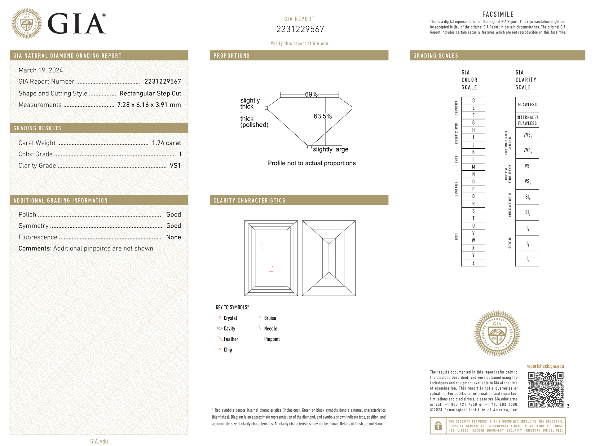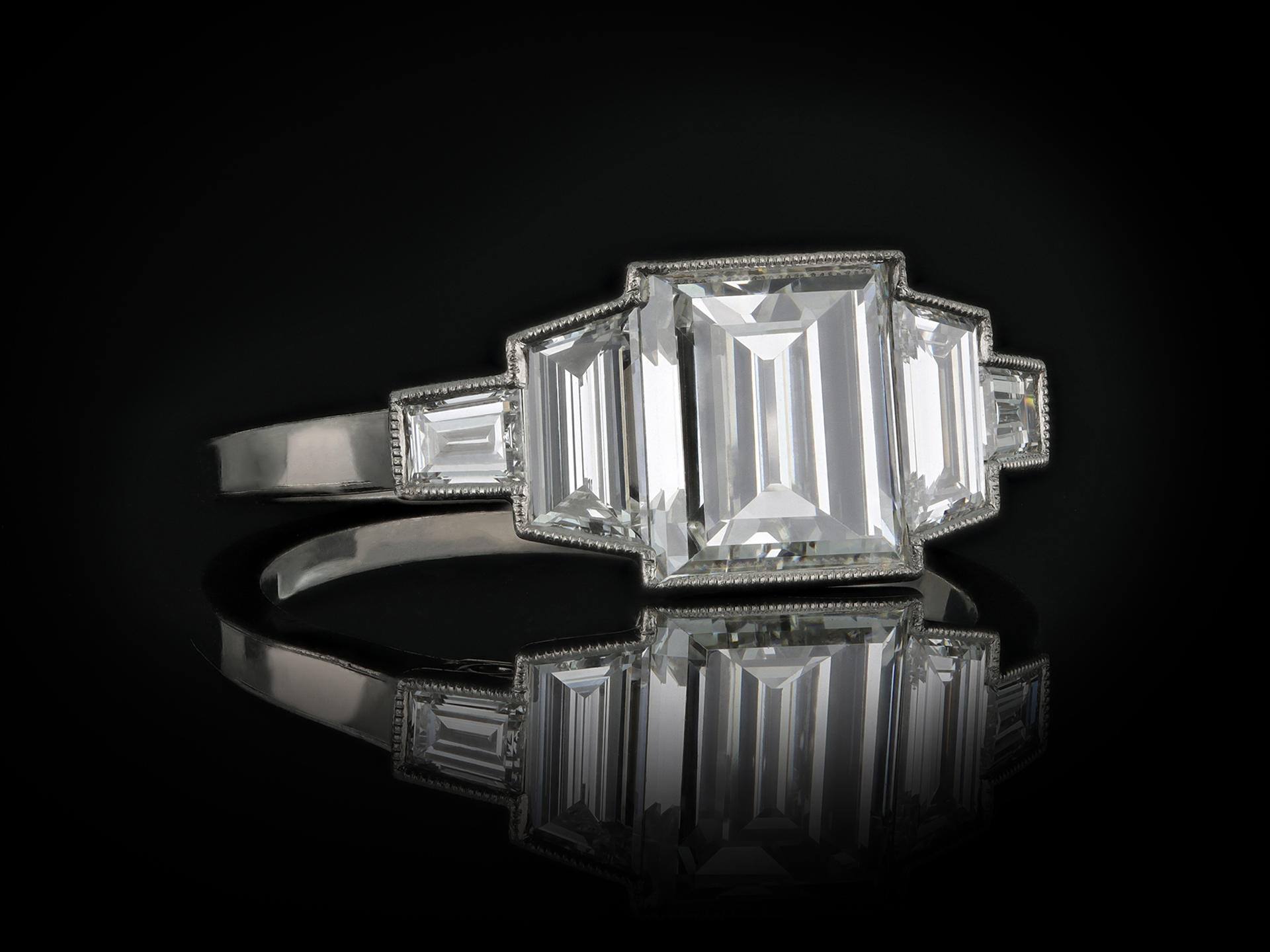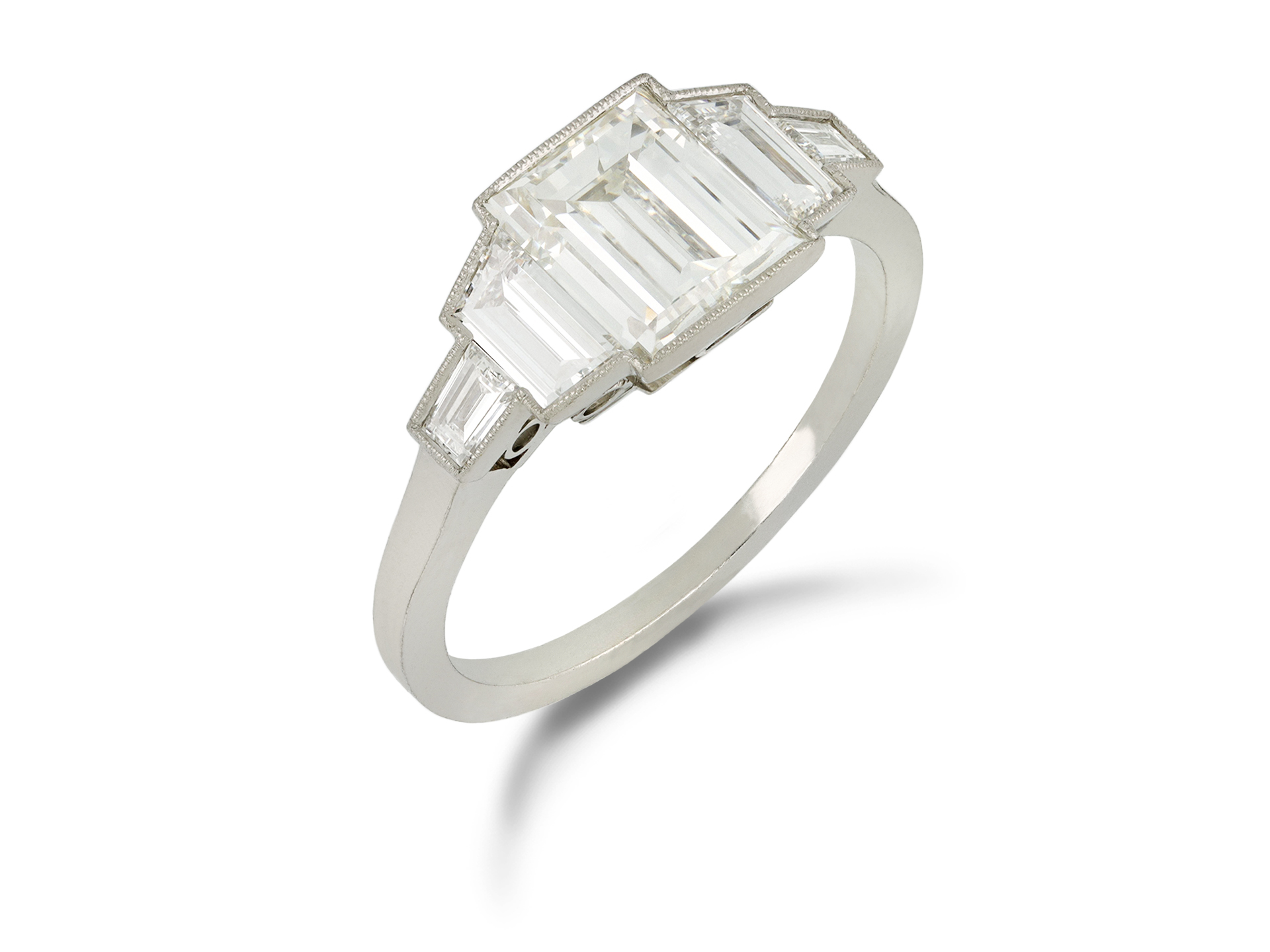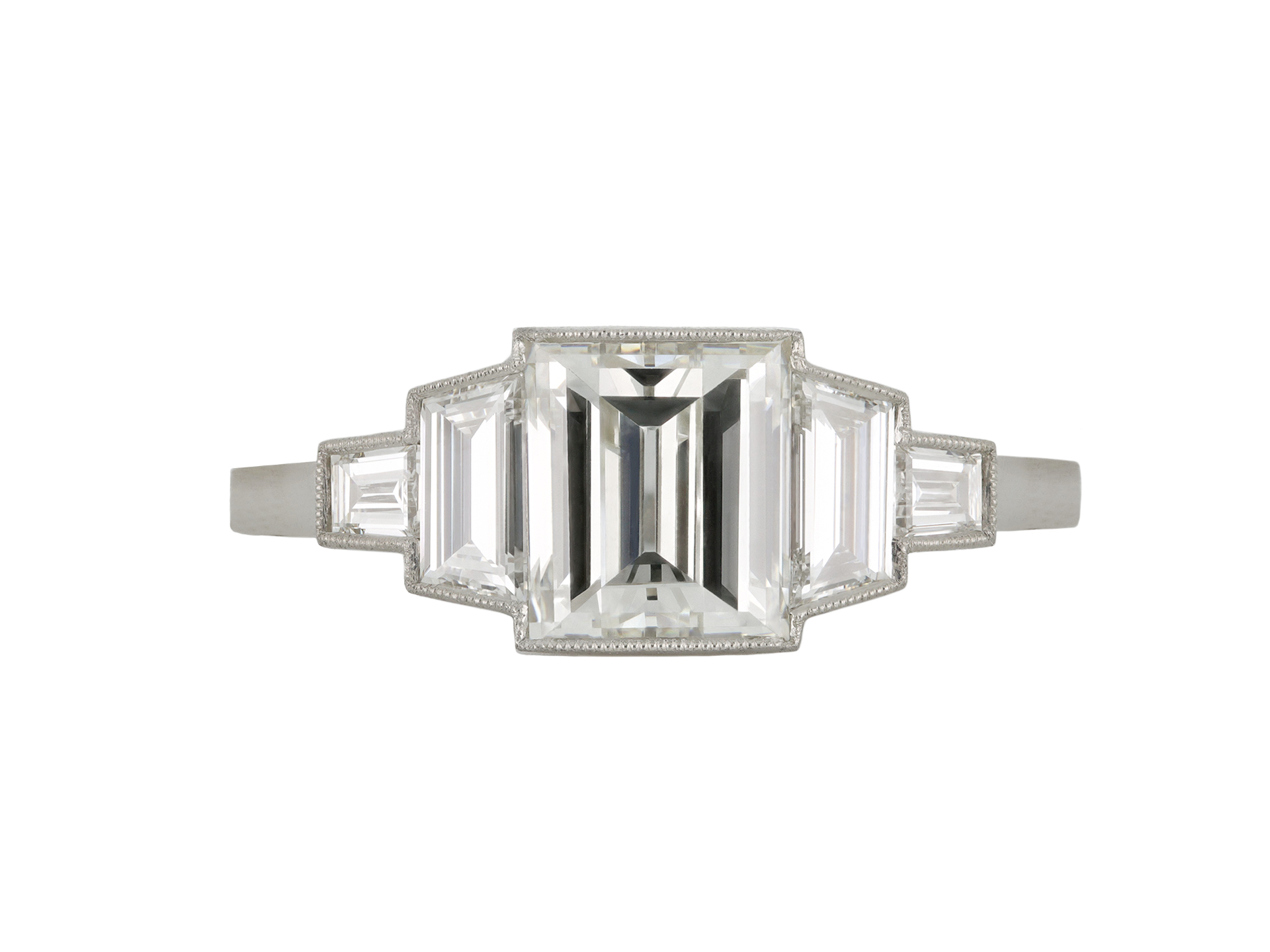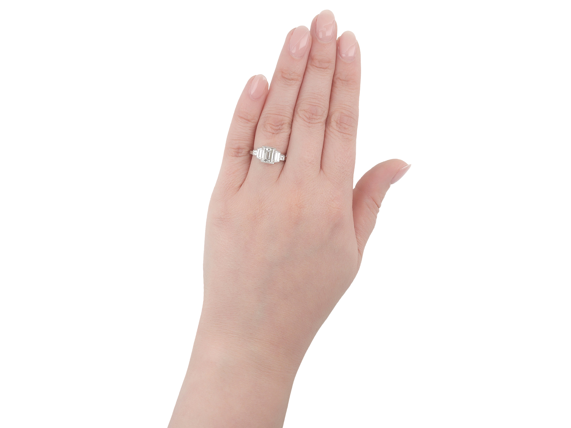 Art Deco step-cut diamond flanked solitaire ring. Centrally set with a rectangular step-cut diamond, I colour, VS1 clarity, with a weight of 1.74 carats in an open back rubover setting, flanked by two tapered baguette cut diamonds in open back rubover settings with a combined weight of 0.60 carats, adorned further by two baguette cut diamonds in open back rubover settings with a combined approximate weight of 0.25 carats. The total approximate diamond weight is 2.60 carats, to an impressive flanked solitaire design with polished edges, a structured open gallery with chenier detail, and geometric open backholing, leading to slightly raised shoulders and flowing through to a solid flat shank. Tested platinum, circa 1925, accompanied by Gemological Institute of America (GIA) report #2231229567.