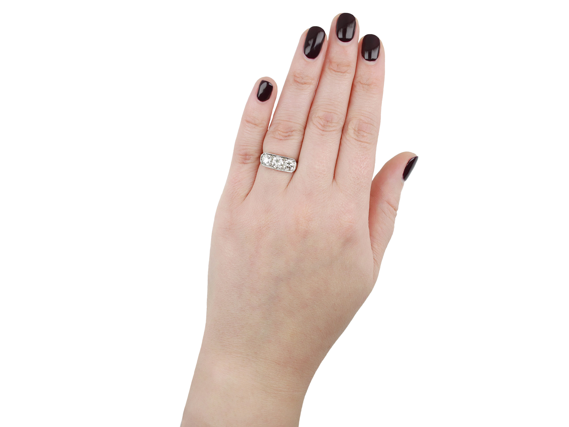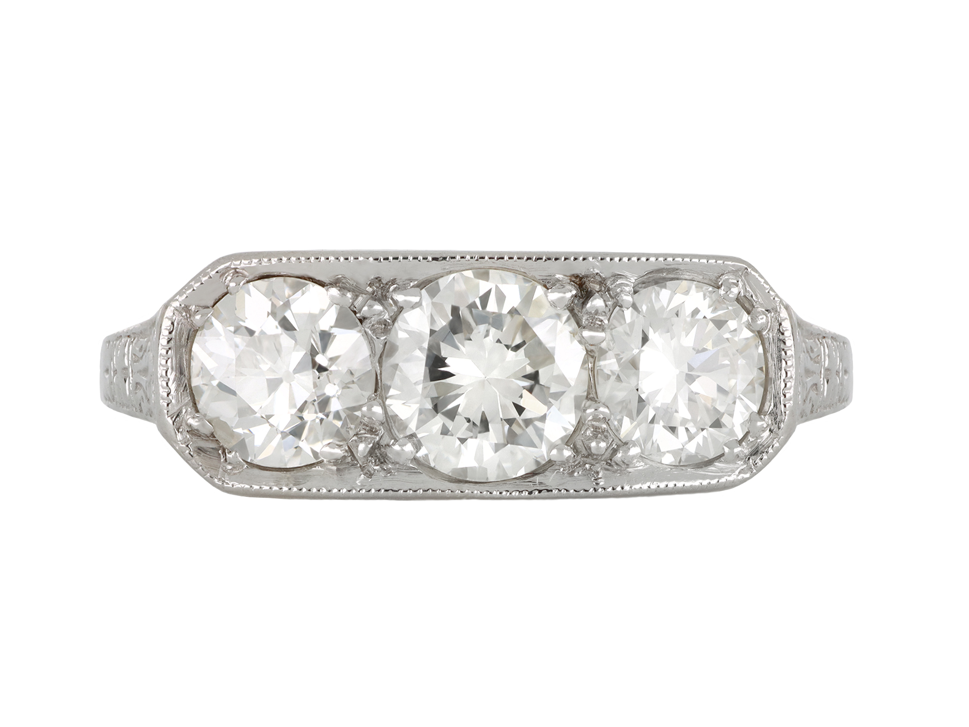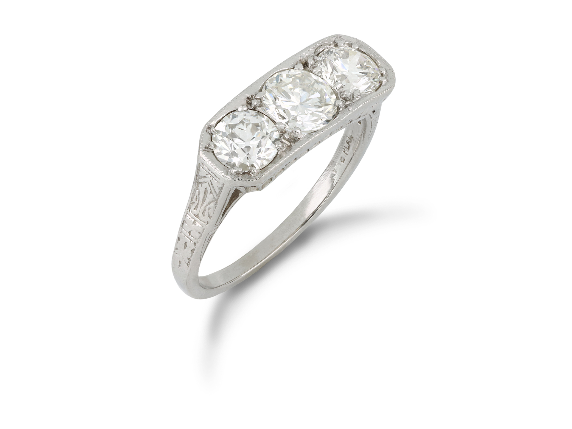 Art Deco three stone diamond ring. Set horizontally with one round old cut diamond in an open back grain setting with an approximate weight of 0.65 carats, flanked by two round old cut diamonds in open back grain settings with a combined weight of 1.00 carats. The total approximate diamond weight is 1.65 carats, to an elegant three stone design featuring millegrain edges, a finely pierced geometric gallery and open backholing, the trumpeting shoulders with intricate engraved patterning, tapering to a solid D-shape shank. Marked platinum, circa 1930.