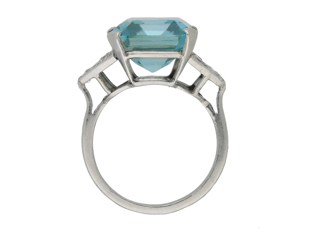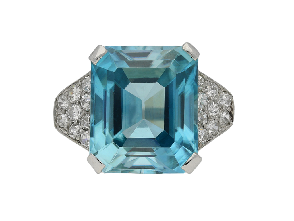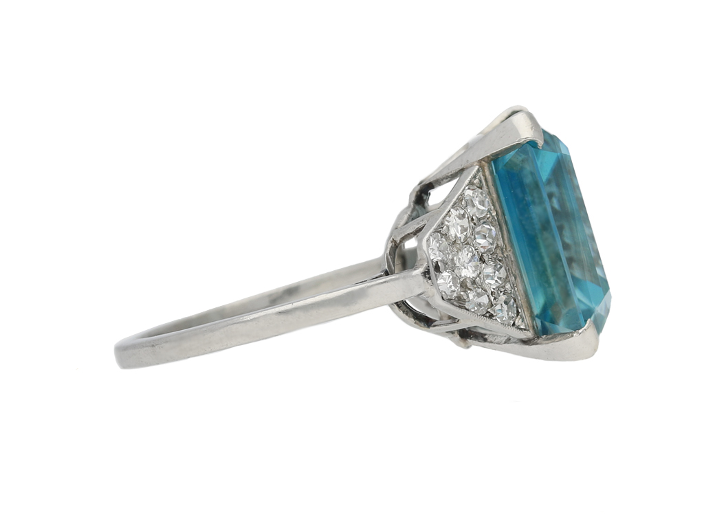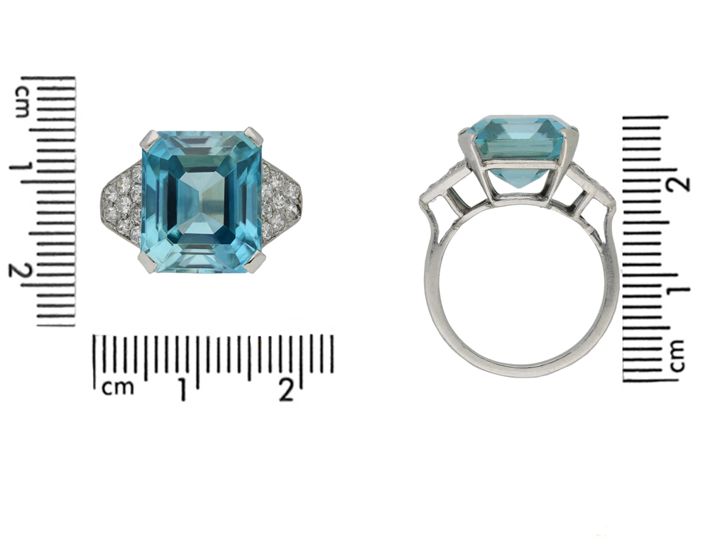 Art Deco zircon and diamond ring. Set with one central rectangular emerald-cut zircon in an open back claw setting with an approximate weight of 15.00 carats, flanked by raised tapered shoulders set with eighteen round eight cut diamonds in open back grain settings with an approximate total weight of 0.54 carats, to a geometric design with an openwork gallery, pierced backholing and flowing through to a D-shape shank. Tested platinum, circa 1930.