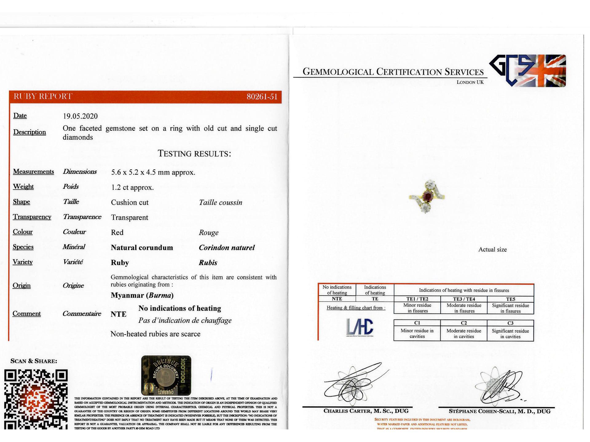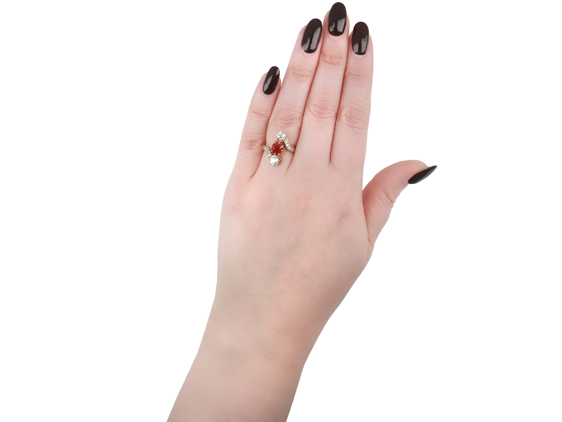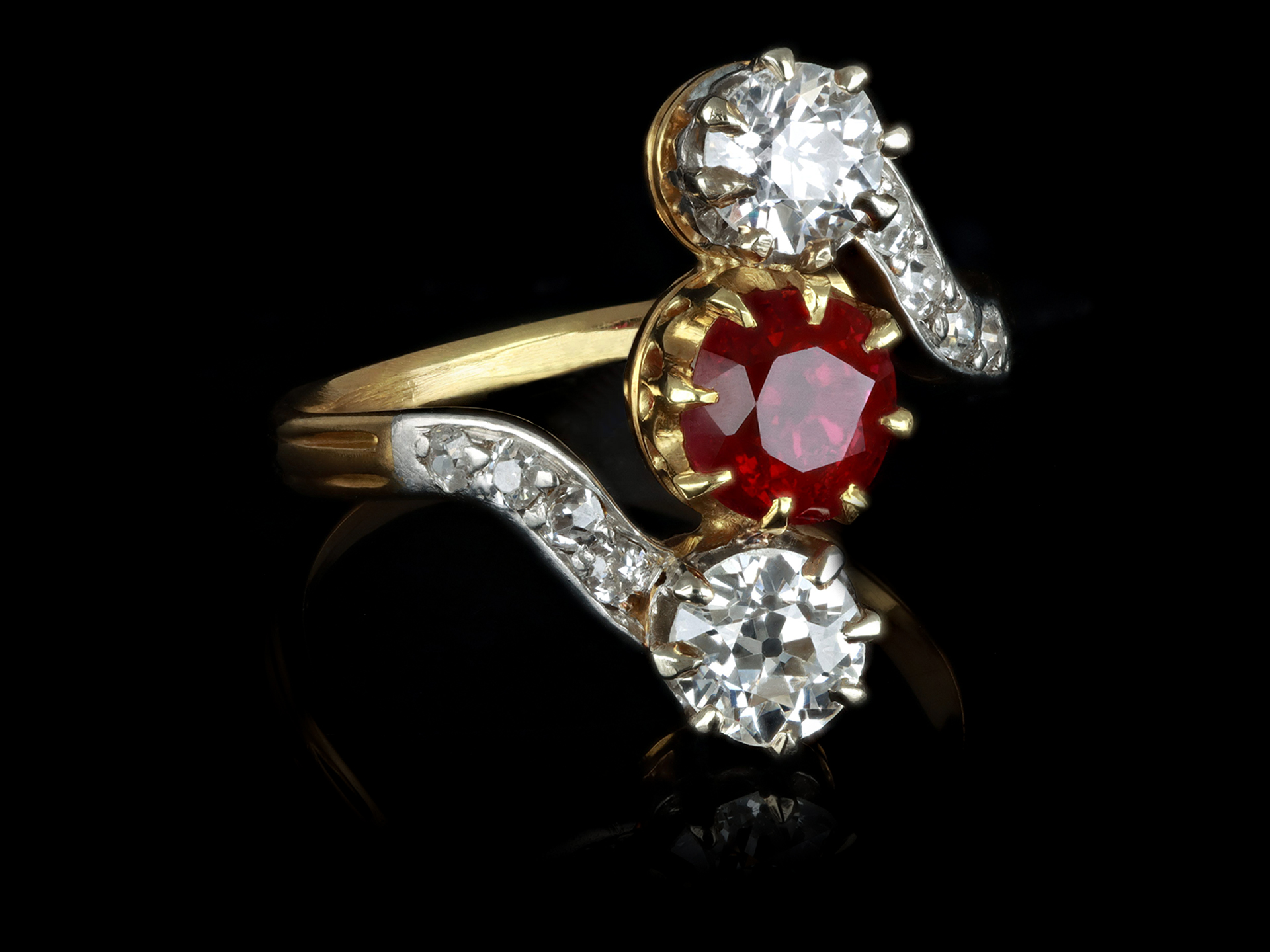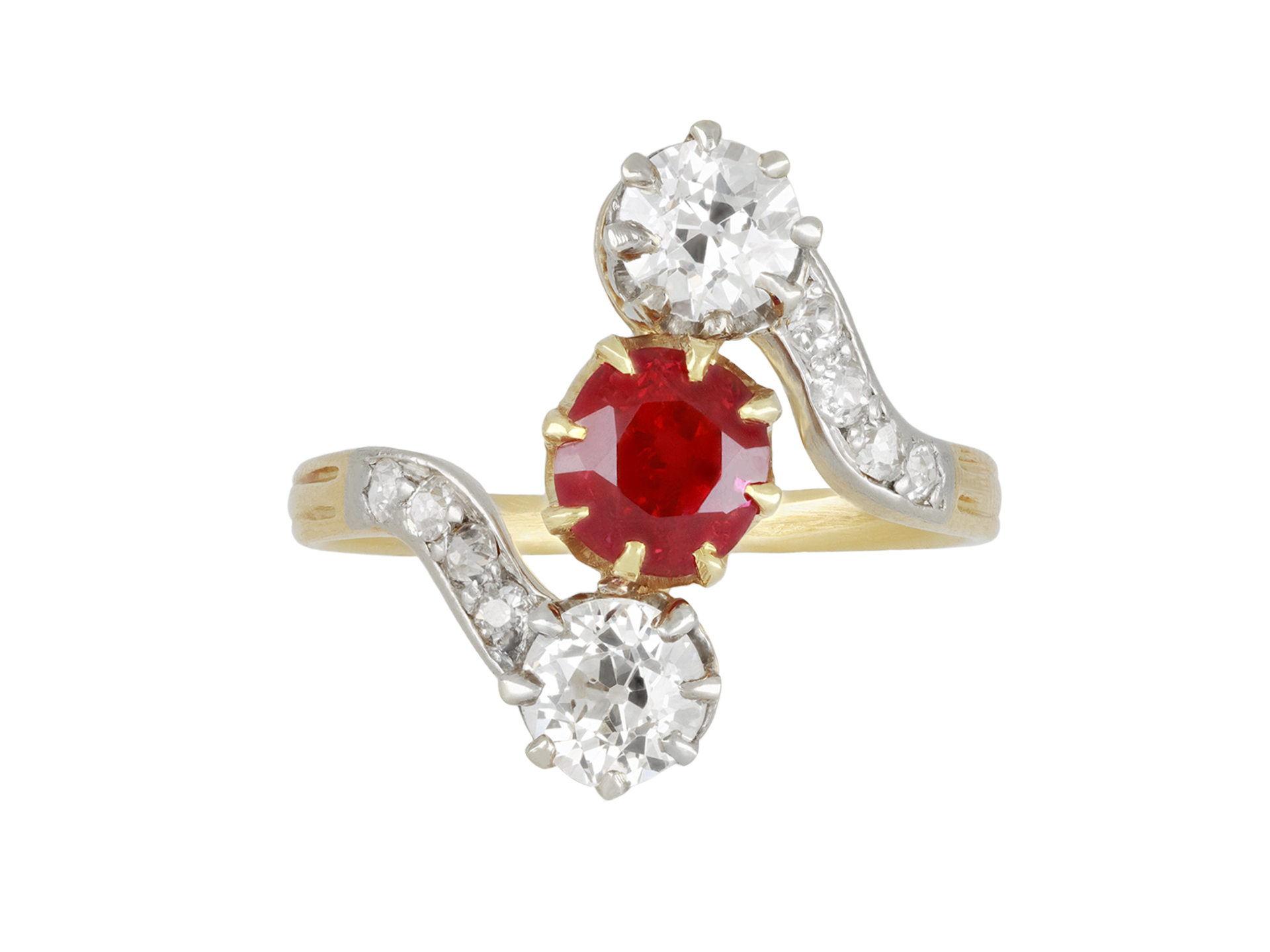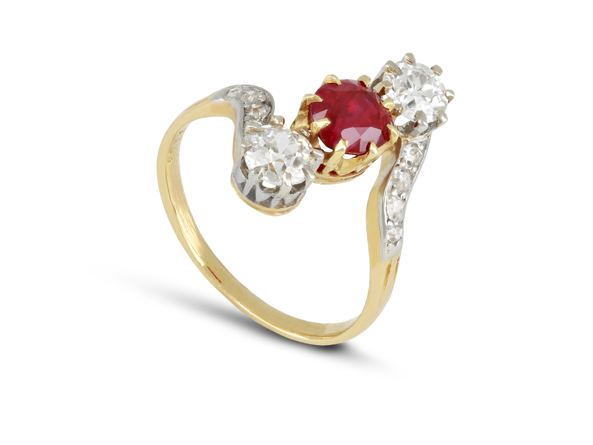 Art Nouveau Burmese ruby and diamond ring. Set to centre with a cushion shape old cut natural unenhanced Burmese ruby in an open back claw setting, with an approximate weight of 1.20 carats, further set with two round old cut diamonds in open back claw settings with an approximate combined weight of 1.00 carats, further adorned with eight round old cut diamonds in open back grain settings with a combined weight of 0.25 carats. The total approximate diamond weight is 1.25 carats, to an elegant three stone crossover design featuring curving claws, an intricately pierced gallery and open backholing, leading to ridged shoulders and flowing through to a solid shank. Tested yellow gold and platinum, numbered '2468', circa 1900, accompanied by Gemmological Certification Services report #80261-51.