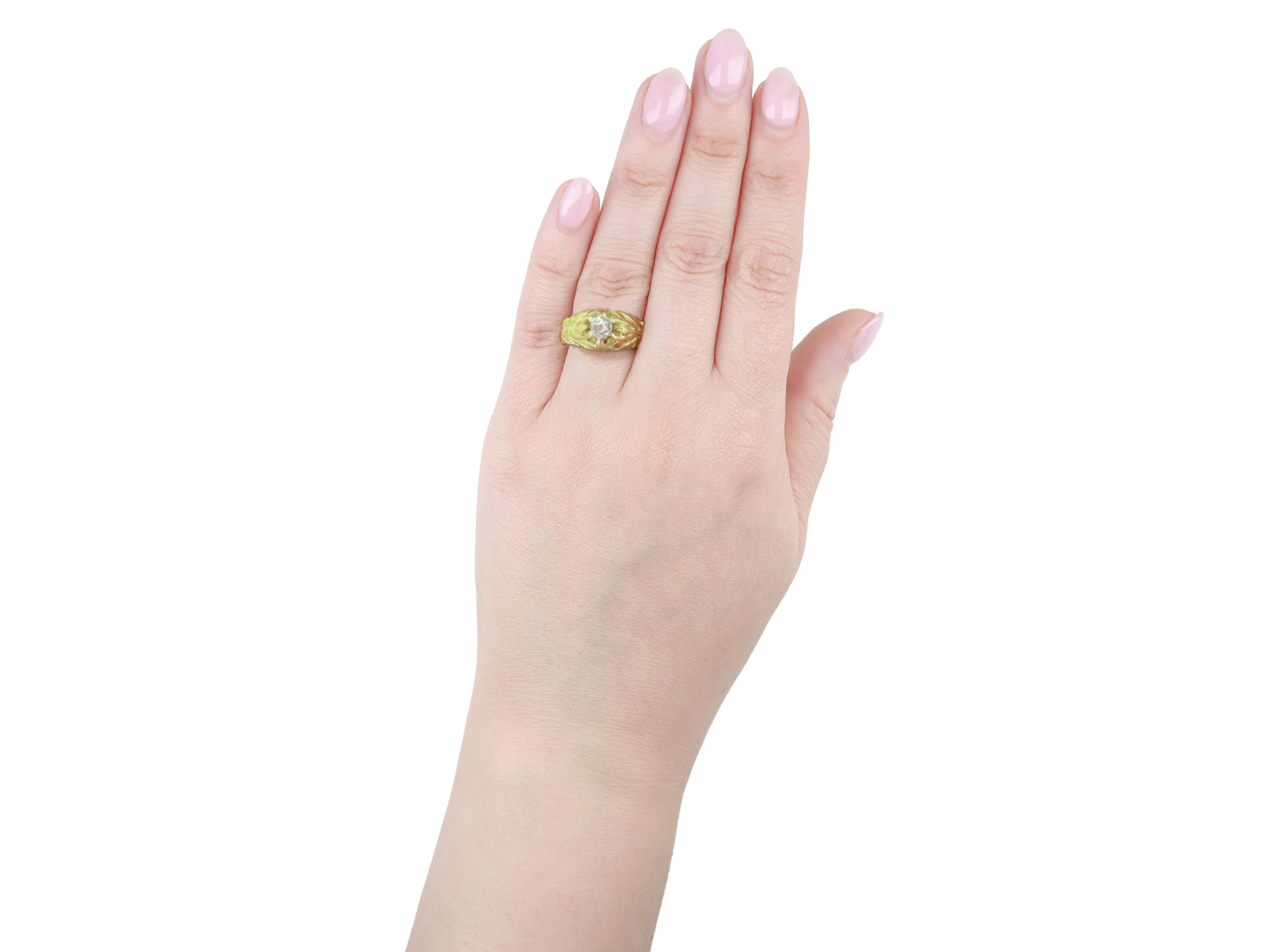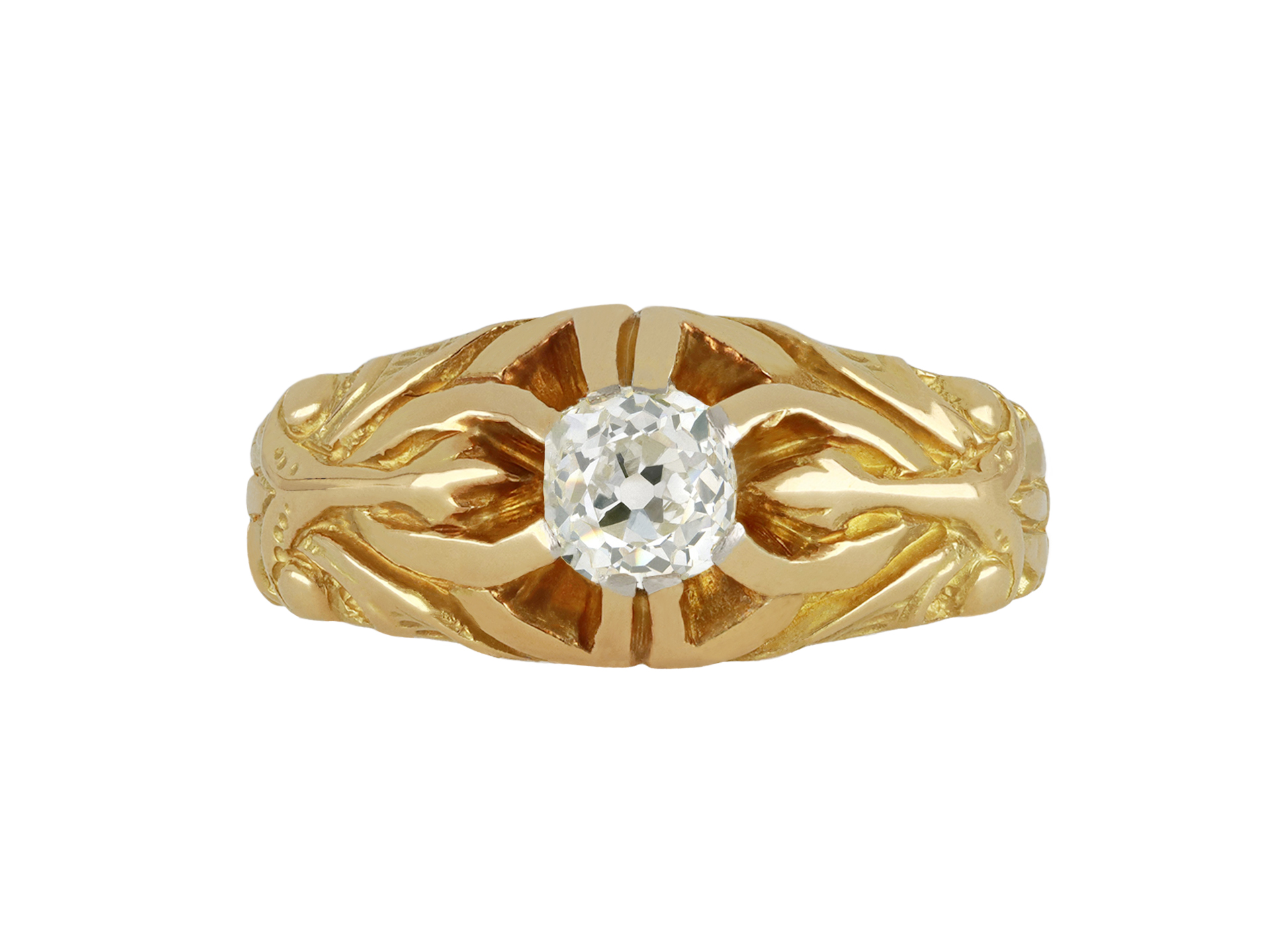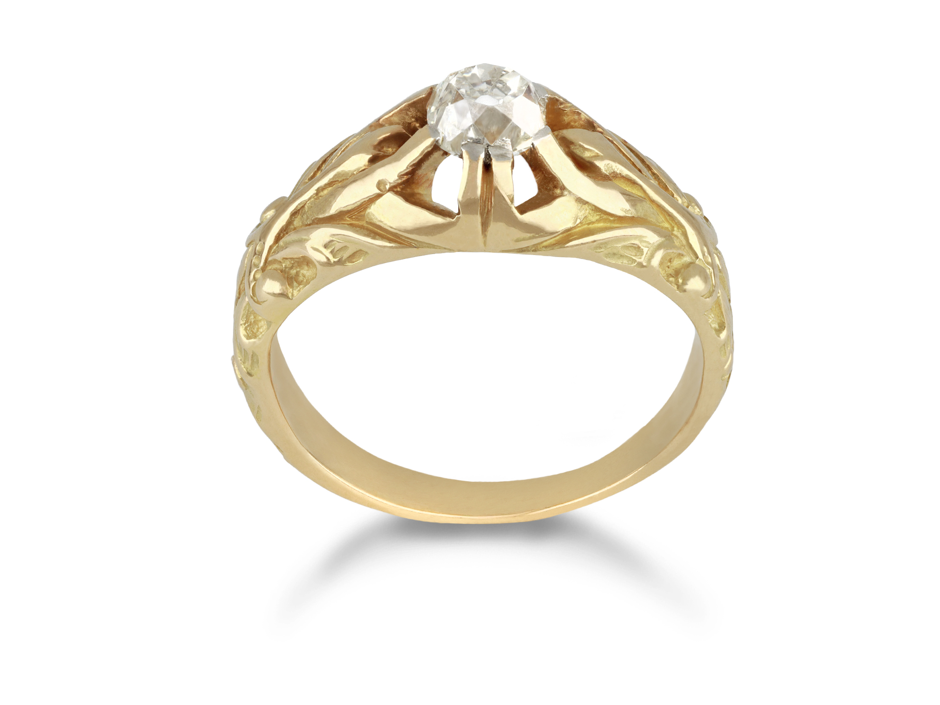 Art Nouveau diamond ring. Set to centre with a cushion shape old mine diamond in an open back claw setting with an approximate weight of 0.78 carats, to an intricately carved design with stylised flora motifs, raised curving claws and circular backholing, the trumpeting shoulders tapering to a solid shank. Tested 18 carat yellow gold, circa 1900.