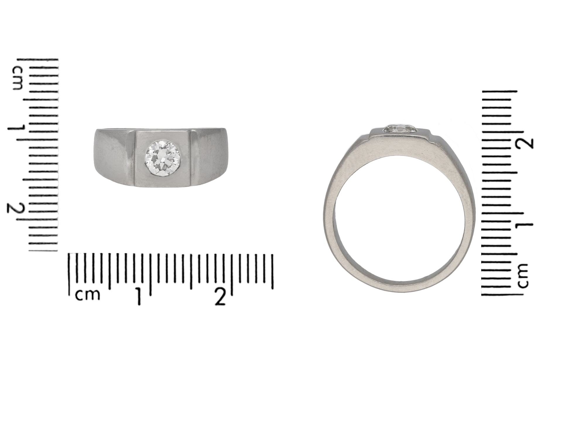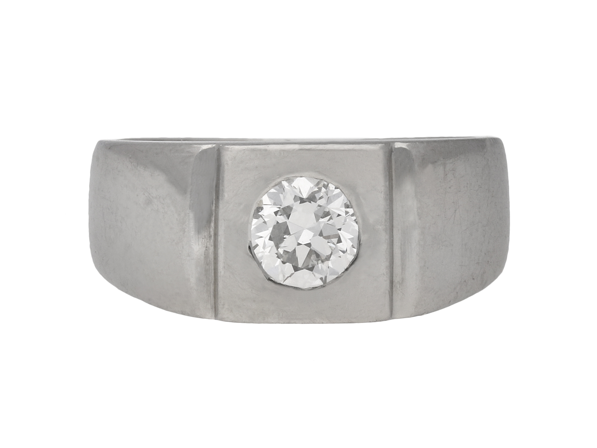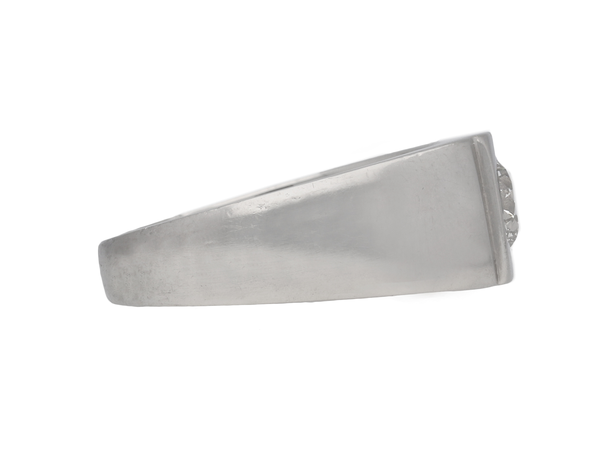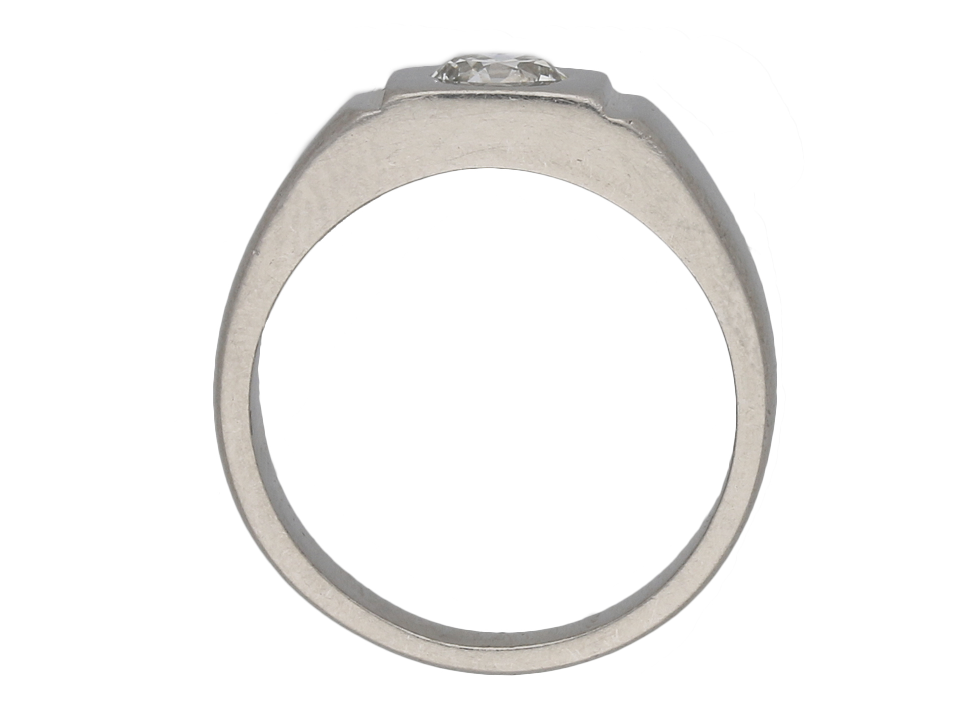 Art deco diamond ring. Set to center with a round old cut diamond in an open back rubover setting with an approximate weight of 0.40 carats, to a stylised solitaire design featuring rectangular bezel, polished edges and rectangular open backholing, flanked by trumpting shoulders leading to a solid tapering flat shank. Marked platinum, French control marks, circa 1920.