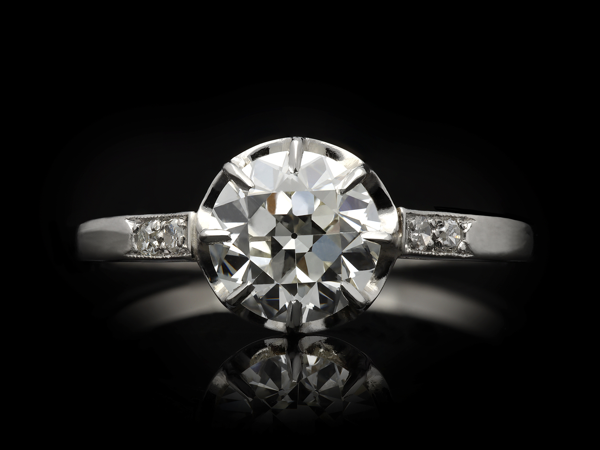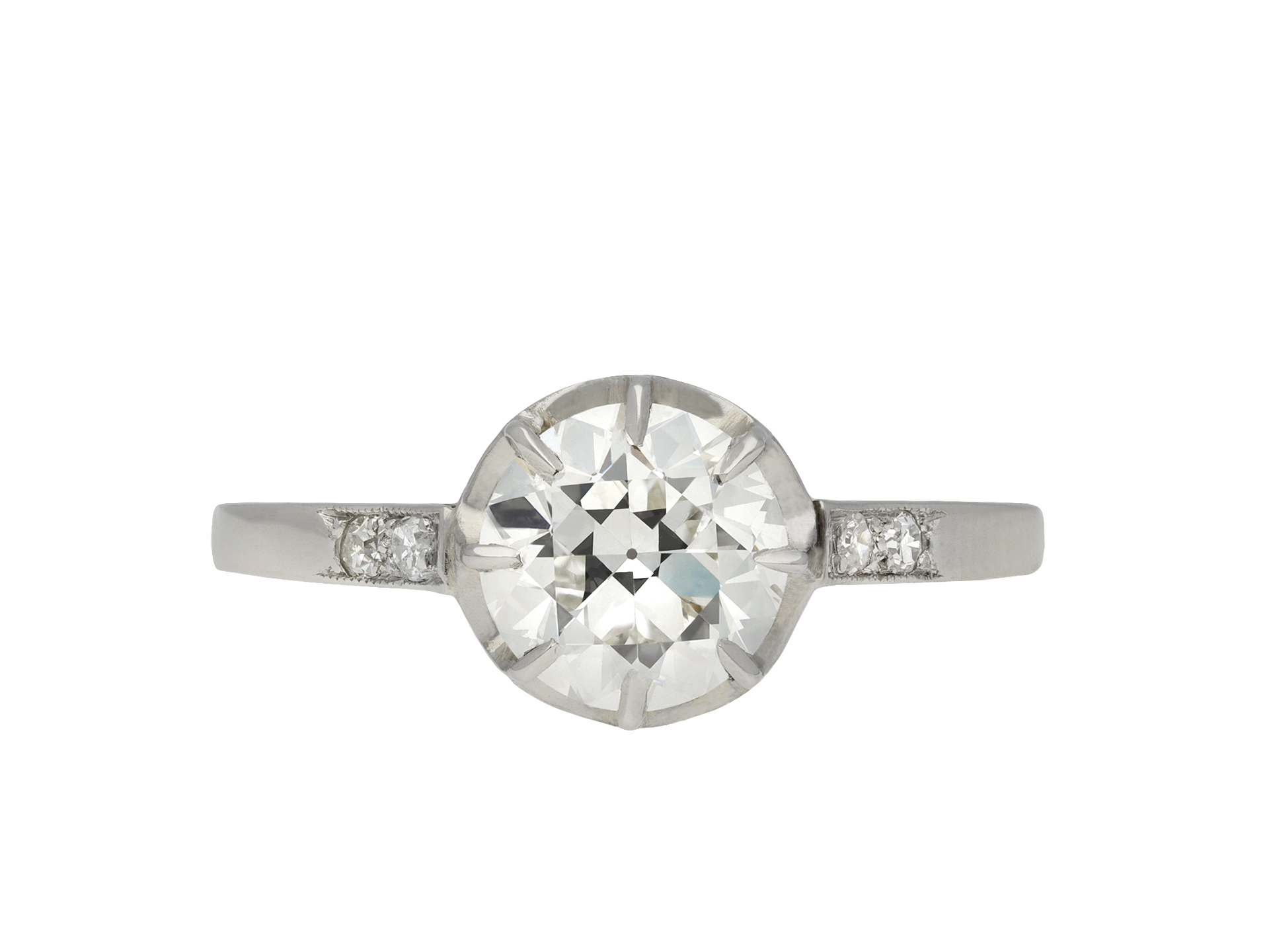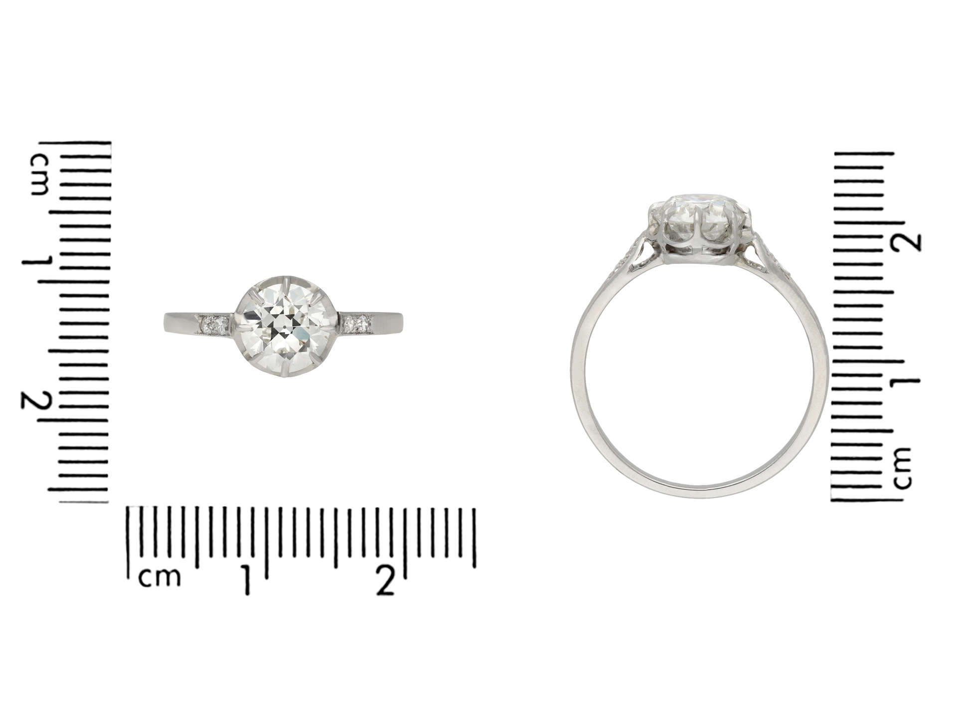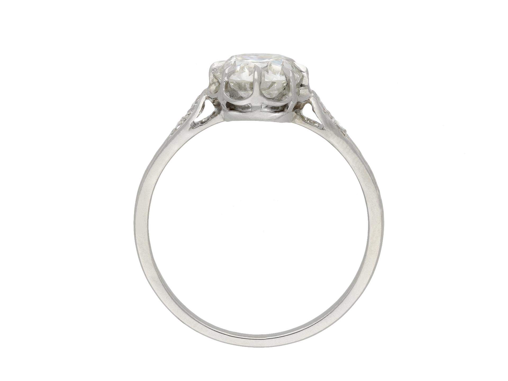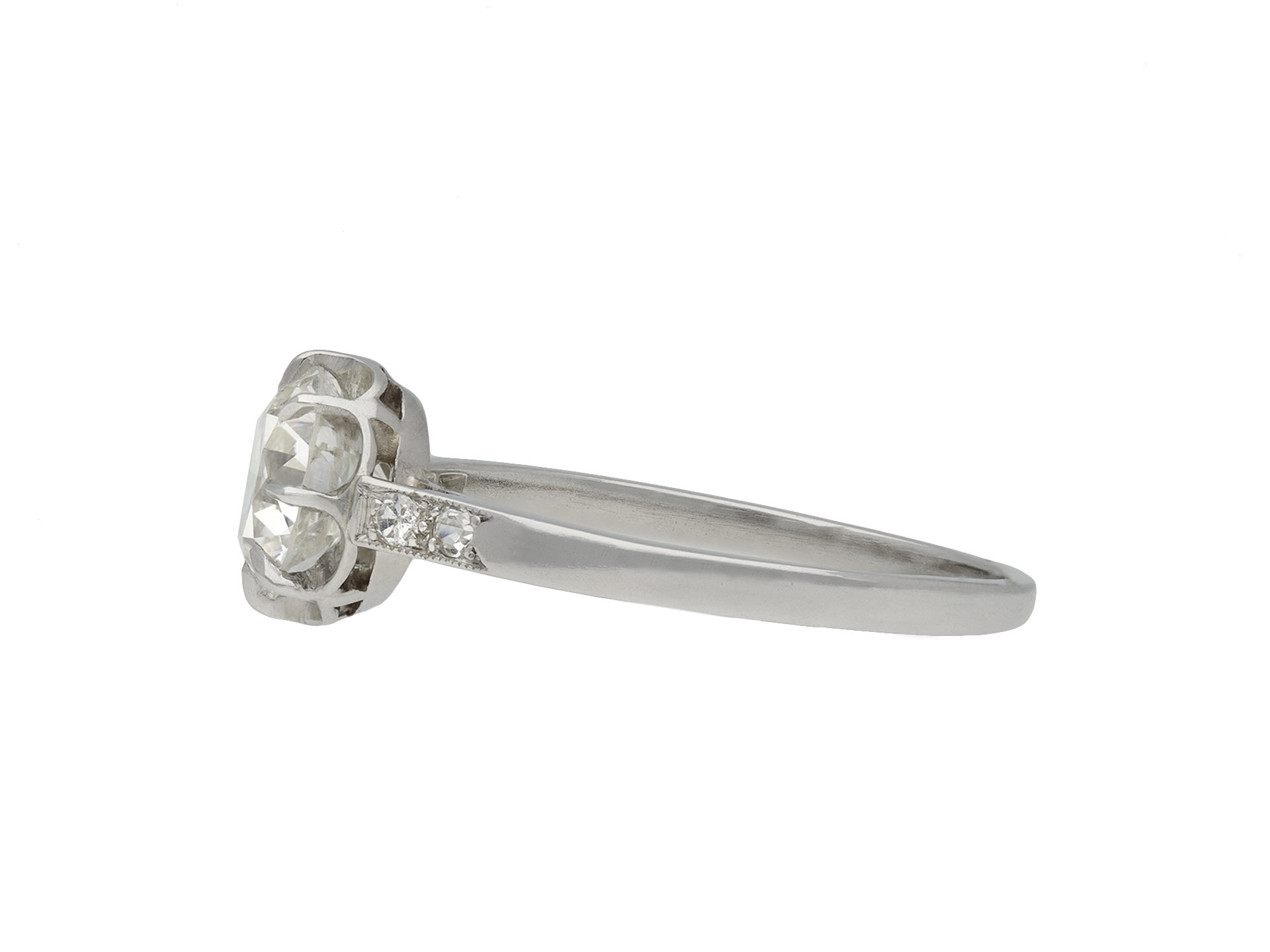 Belle Époque diamond flanked solitaire ring. Set to centre with a round old cut diamond in an open back claw setting with an approximate weight of 1.35 carats, flanked by four round eight cut diamonds in open back grain settings with a combined weight of 0.08 carats. The total approximate diamond weight is 1.43 carats, to an illusion set flanked solitaire design, featuring curving flaws, an intricately pierced gallery and open backholing leading to raised shoulders with millegrain borders which continue through to a smooth solid shank. Marked platinum, French, circa 1910.