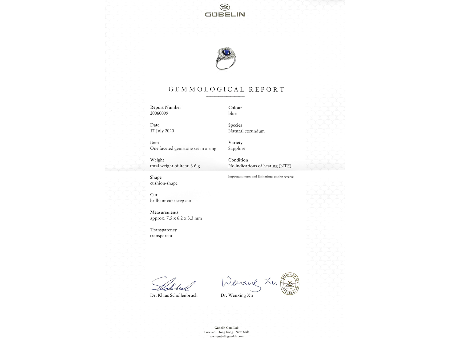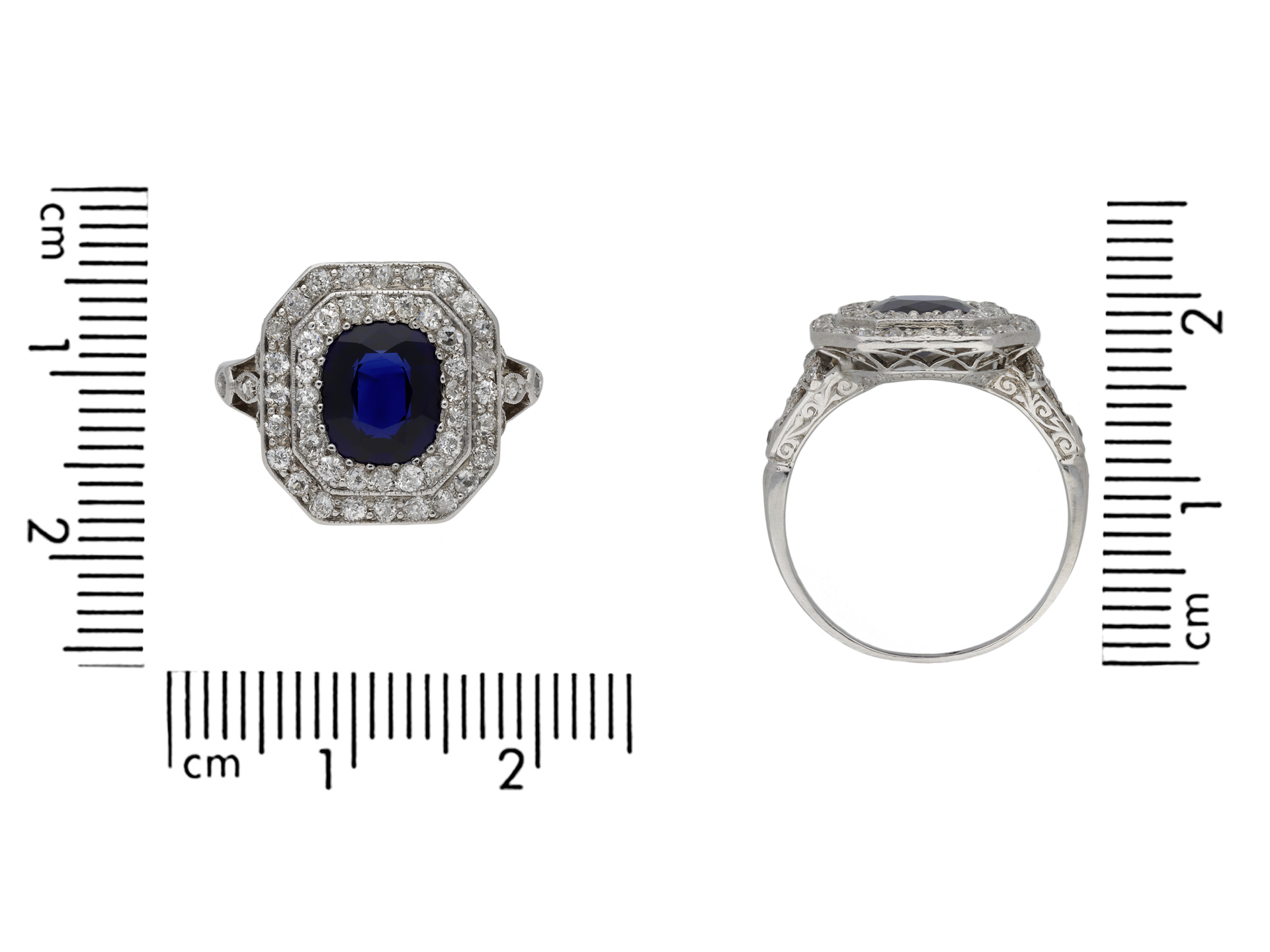Belle Époque sapphire and diamond cluster ring. Set to centre with a single cushion shape old cut natural unenhanced sapphire in an open back grain setting with an approximate weight of 1.50 carats, encircled by a double row and further set to the shoulders with fifty four round old cut diamonds in open back grain and rubover settings with an approximate combined weight of 1.00 carats, to an elegant cluster design featuring millegrain edging, an ornately pierced gallery with intricate scrolled engraving and open shaped backholing, leading to shoulders with pierced floral motifs and flowing through to a flat solid tapered shank. Tested platinum, circa 1905, accompanied by Gubelin Gemmological report #20060099.