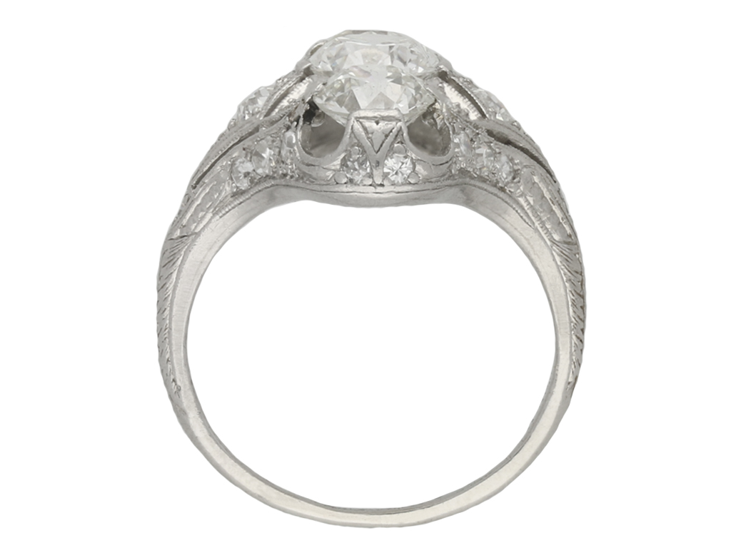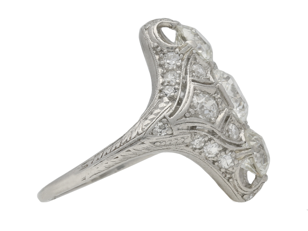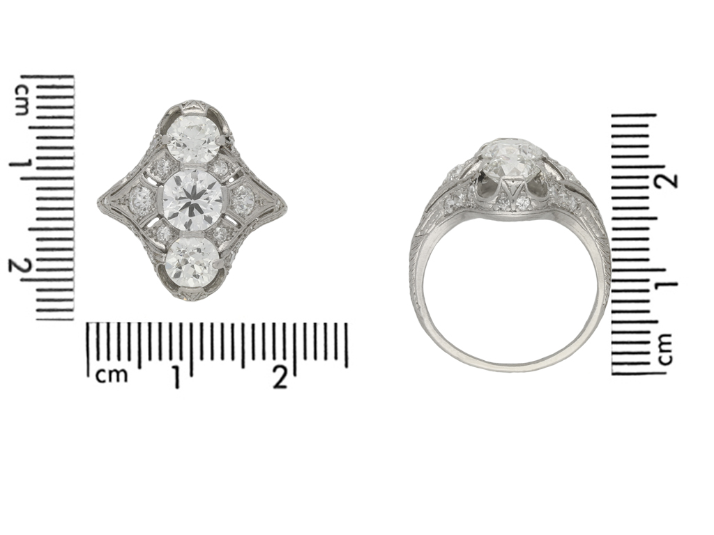 Belle Époque three stone diamond cluster ring. Vertically set with three round old cut diamonds in open back claw settings with an approximate combined weight of 2.30 carats, surrounded by twenty round old cut diamonds in open back grain settings with a combined weight of 0.70 carats. The total approximate diamond weight is 3.00 carats, to an ornate cluster design featuring intricate openwork bordered by millegrain edging, a decoratively engraved gallery and open backholing, leading shoulders engraved with a foliate design and flowing through to a tapered D-shape shank. Tested platinum, circa 1905.
