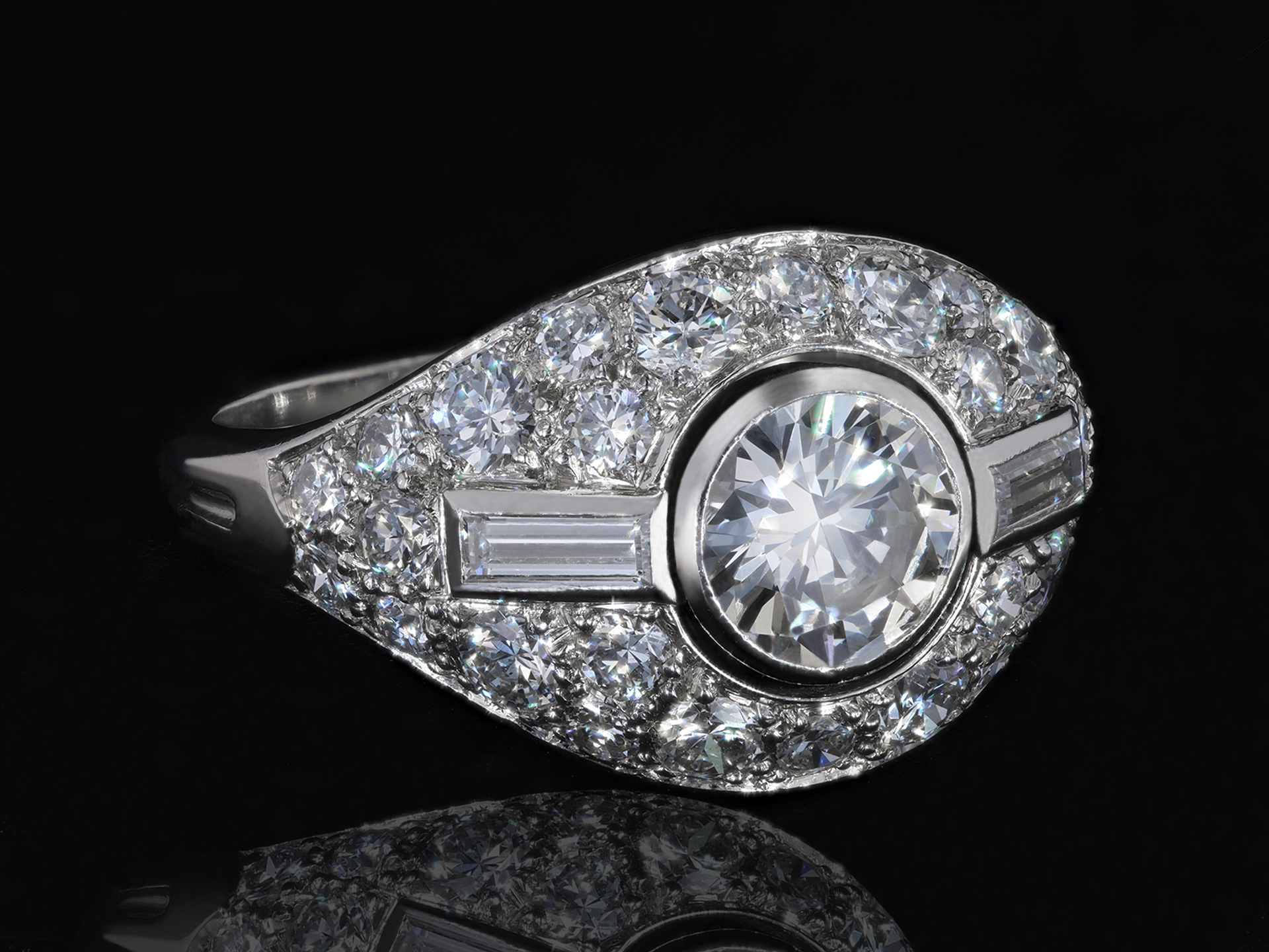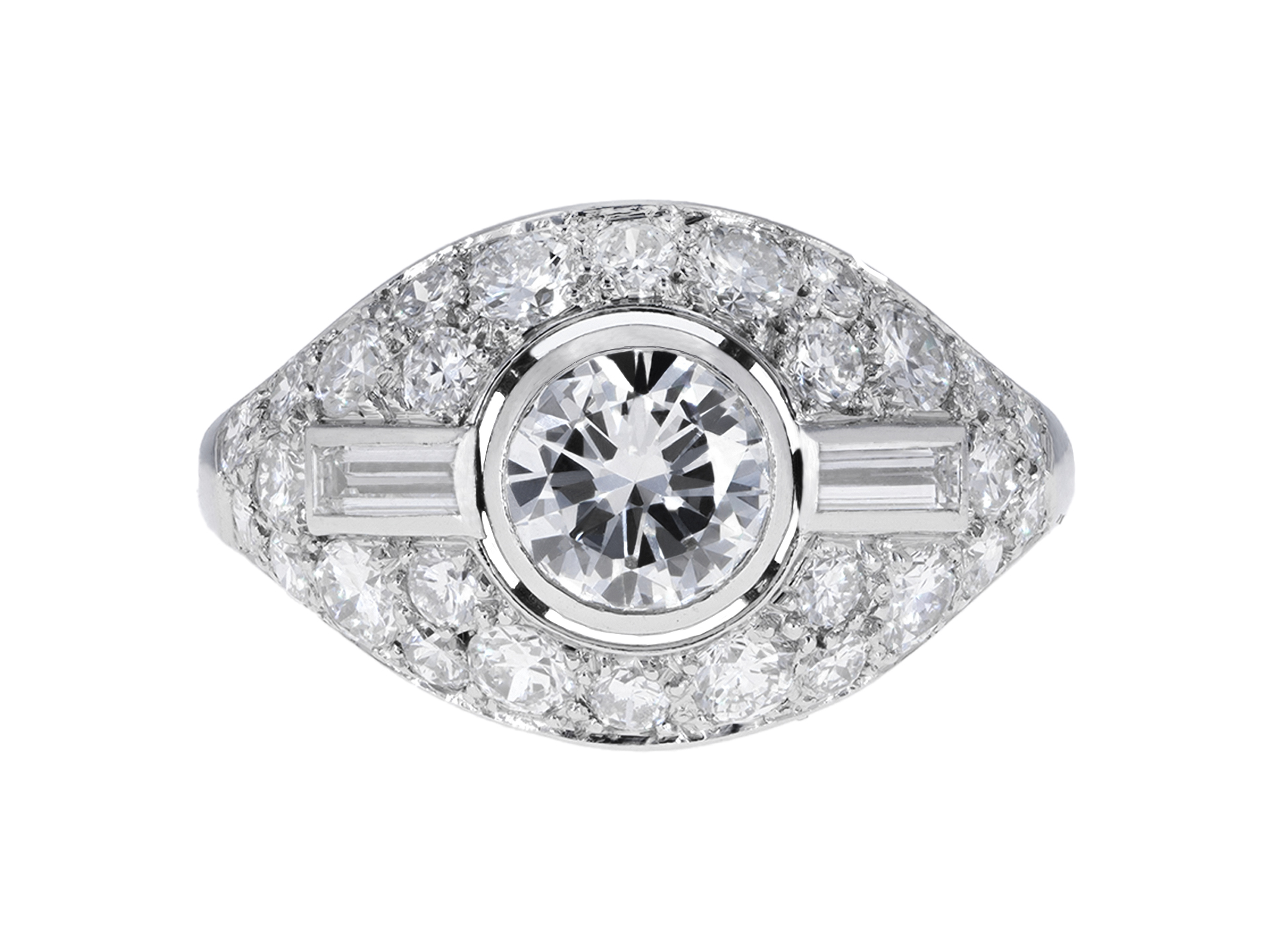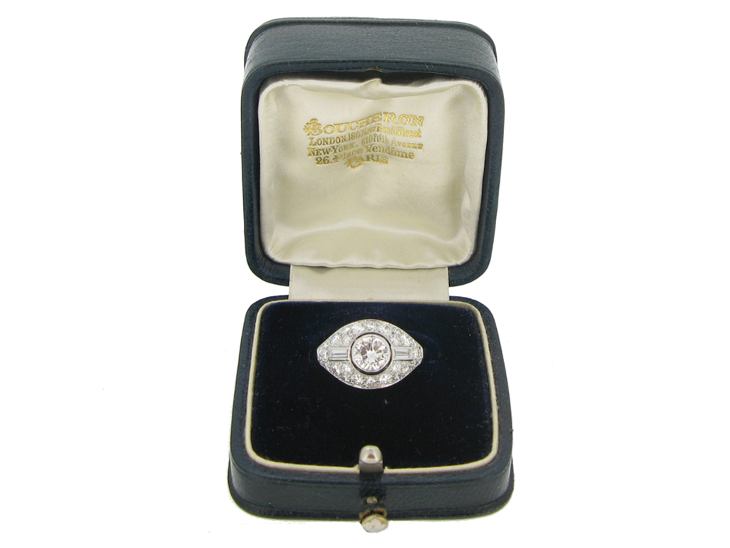 Boucheron Paris diamond cluster ring. Set to centre with a round old cut diamond in an open back rubover setting with an approximate weight of 0.80 carats, flanked by two horizontally set rectangular baguette cut diamonds in open back rubover settings with a combined weight of 0.30 carats, surrounded by a cluster of round old cut diamonds of varying sizes in open back grain settings, twenty eight in total with a combined weight of 1.00 carat. The total approximate diamond weight is 2.10 carats, to an elegant bombe openwork cluster with a pierced conforming gallery and intricate fancy open backholing, flanked by trumpeted ridged shoulders flowing through to a solid tapered D-shape shank. Marked platinum, signed 'BOUCHERON PARIS', French, circa 1950s, accompanied by a Boucheron box.