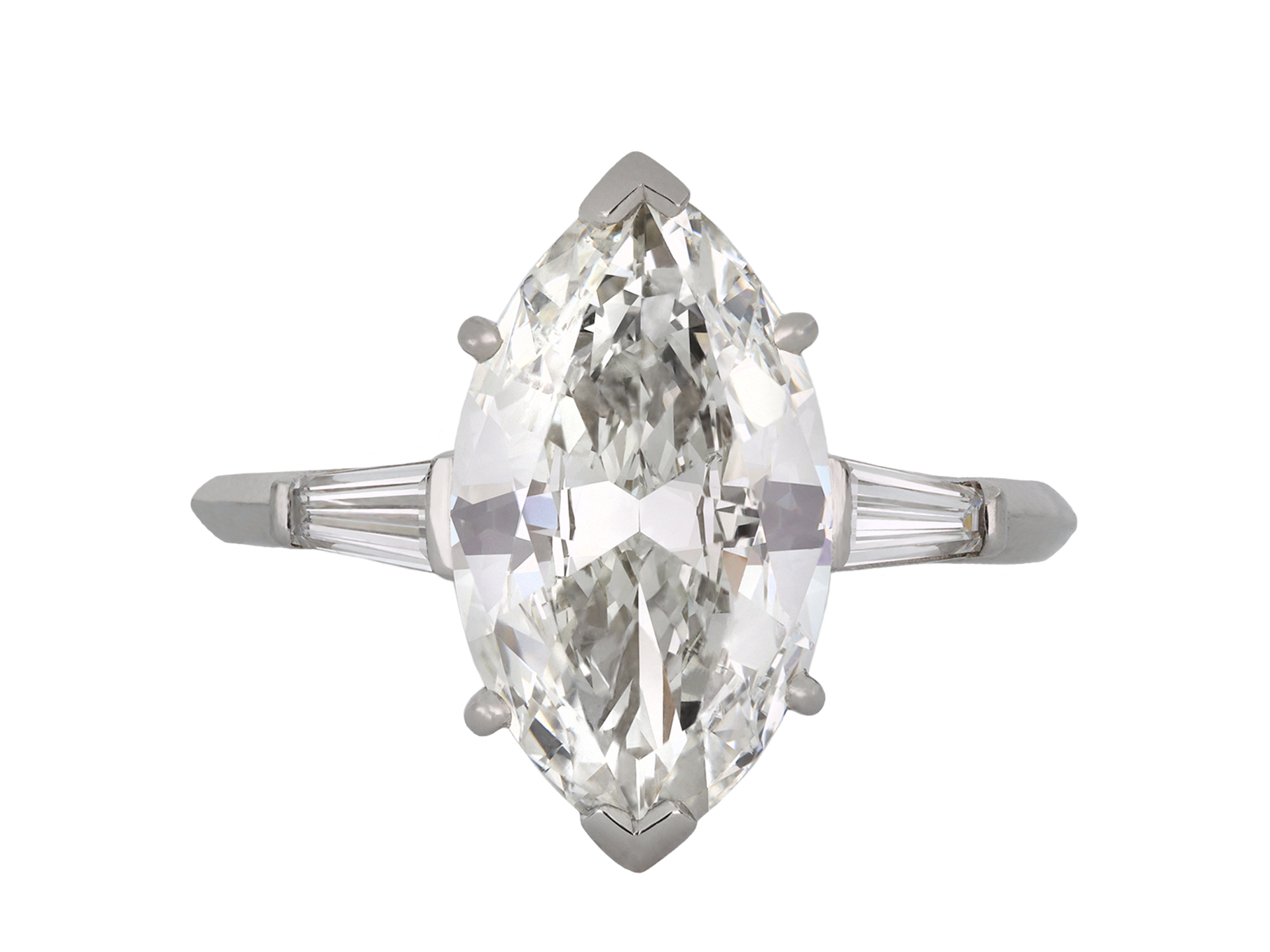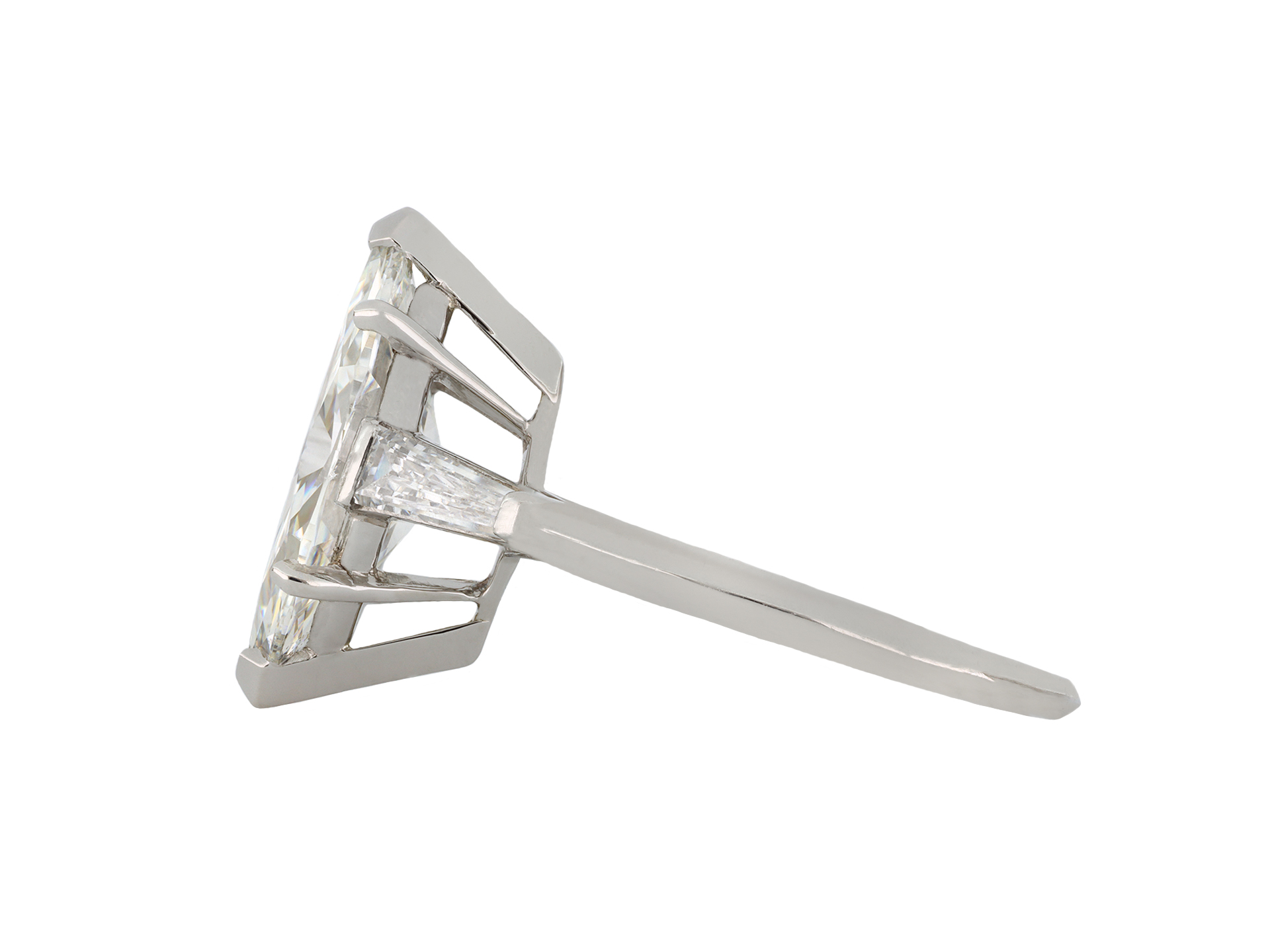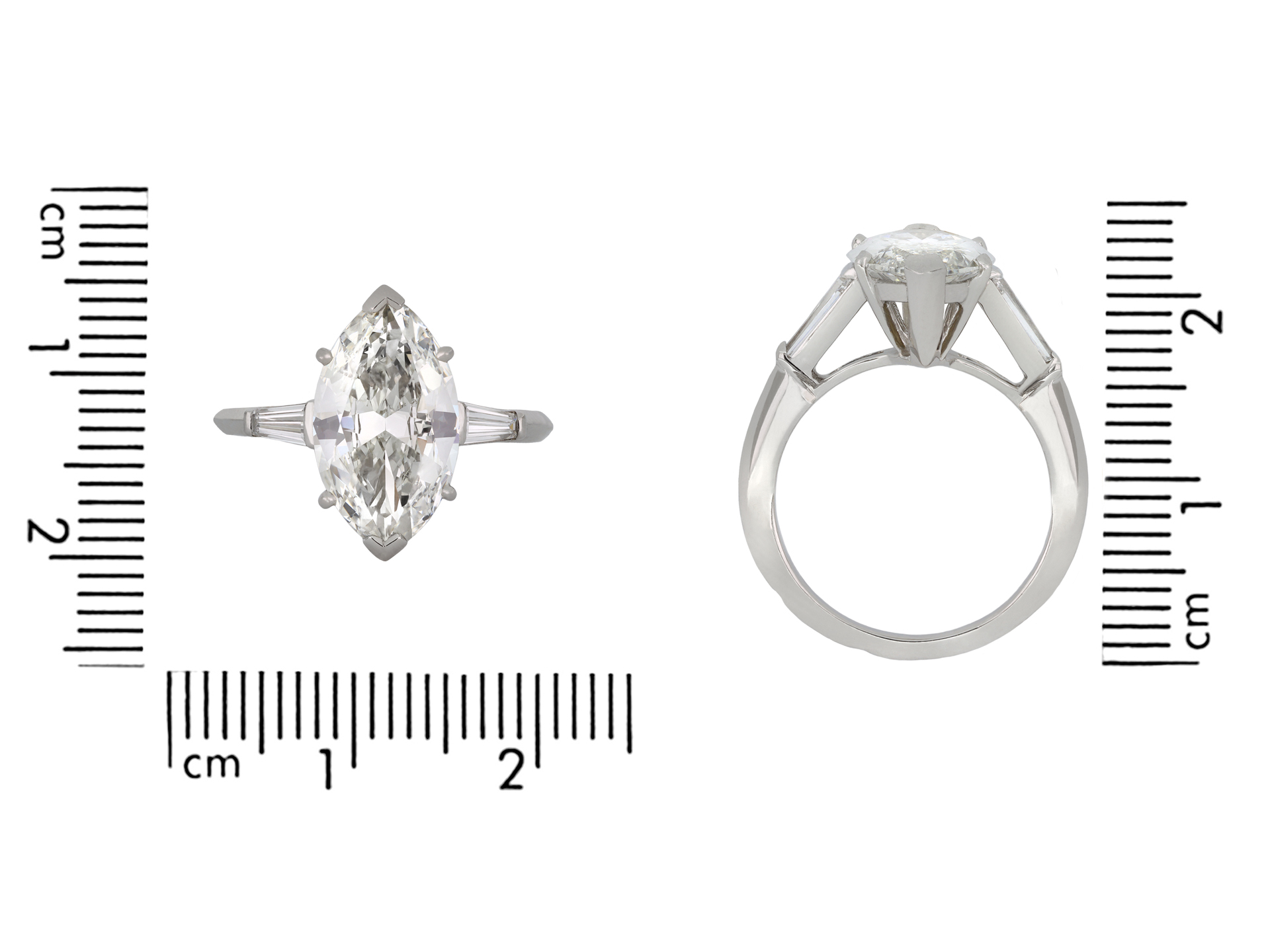 Boucheron marquise shape diamond ring. Set to centre with a marquise shape old cut diamond, I colour, SI1 clarity, with an approximate weight of 3.04 carats in an open back claw setting, flanked by two tapered baguette cut diamonds in open back half rubover settings with a combined weight of 0.50 carats. The total approximate diamond weight is 3.54 carats, to a flanked solitaire design featuring curving claws, a structured linear gallery and open backholing, leading to raised shoulders and flowing through to a solid chamfered edge shank. Tested platinum, marked 'BOUCHERON', maker's mark 'AJV' for 'Atelier de Joaillerie Vendôme' French, circa 1950, accompanied by Gemological Institute of America (GIA) report #7235202931