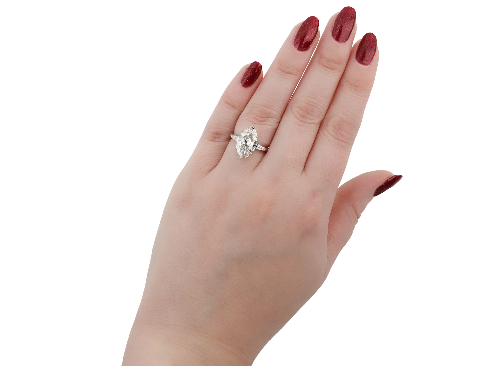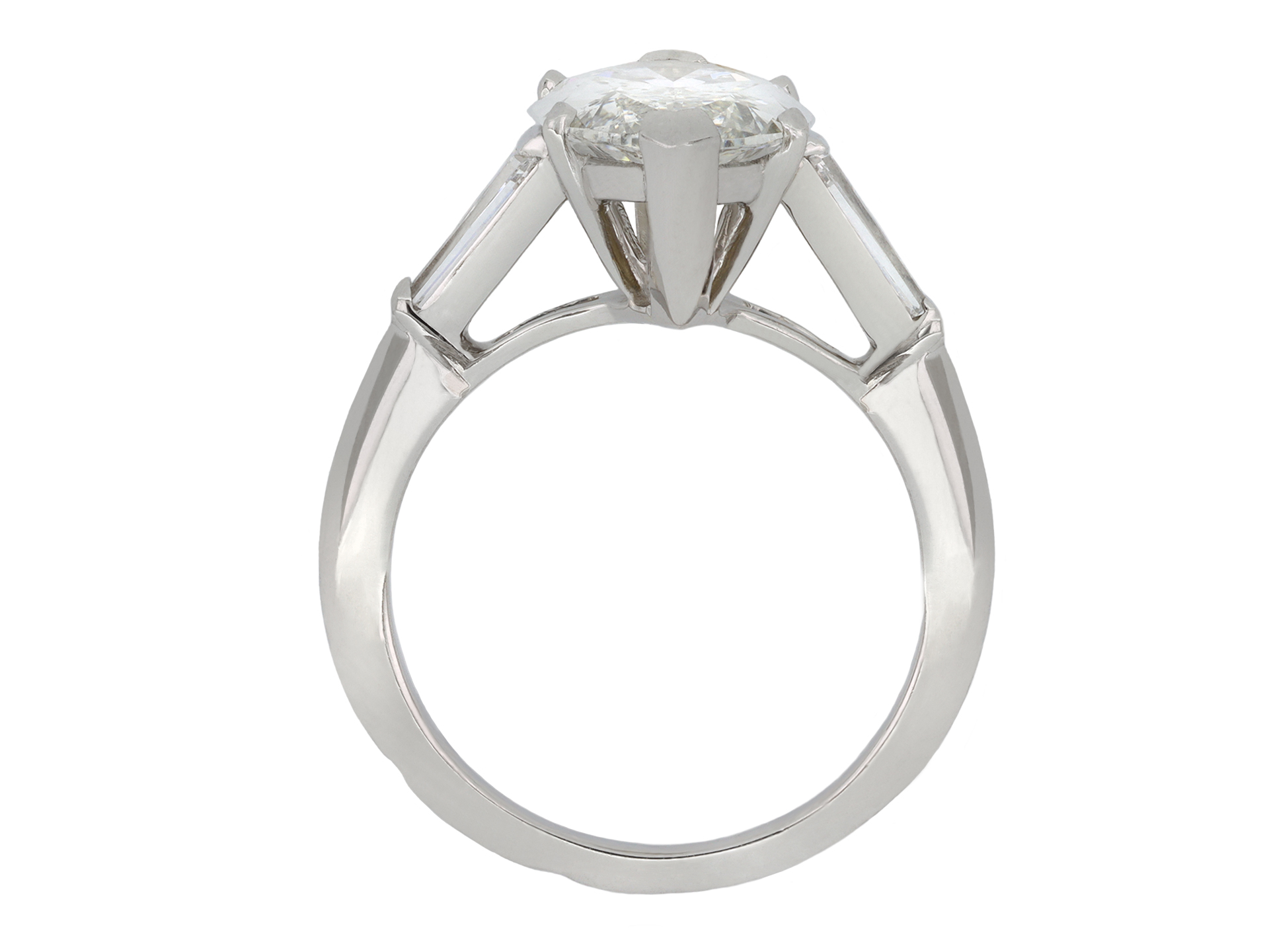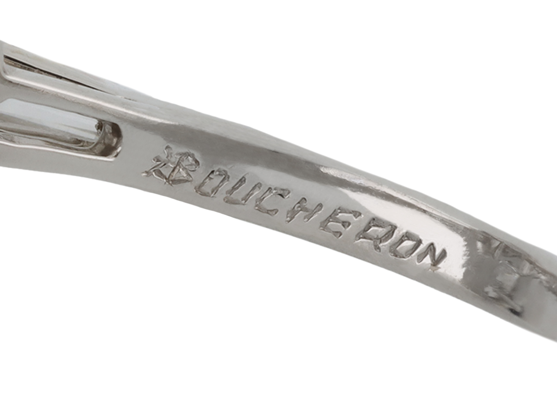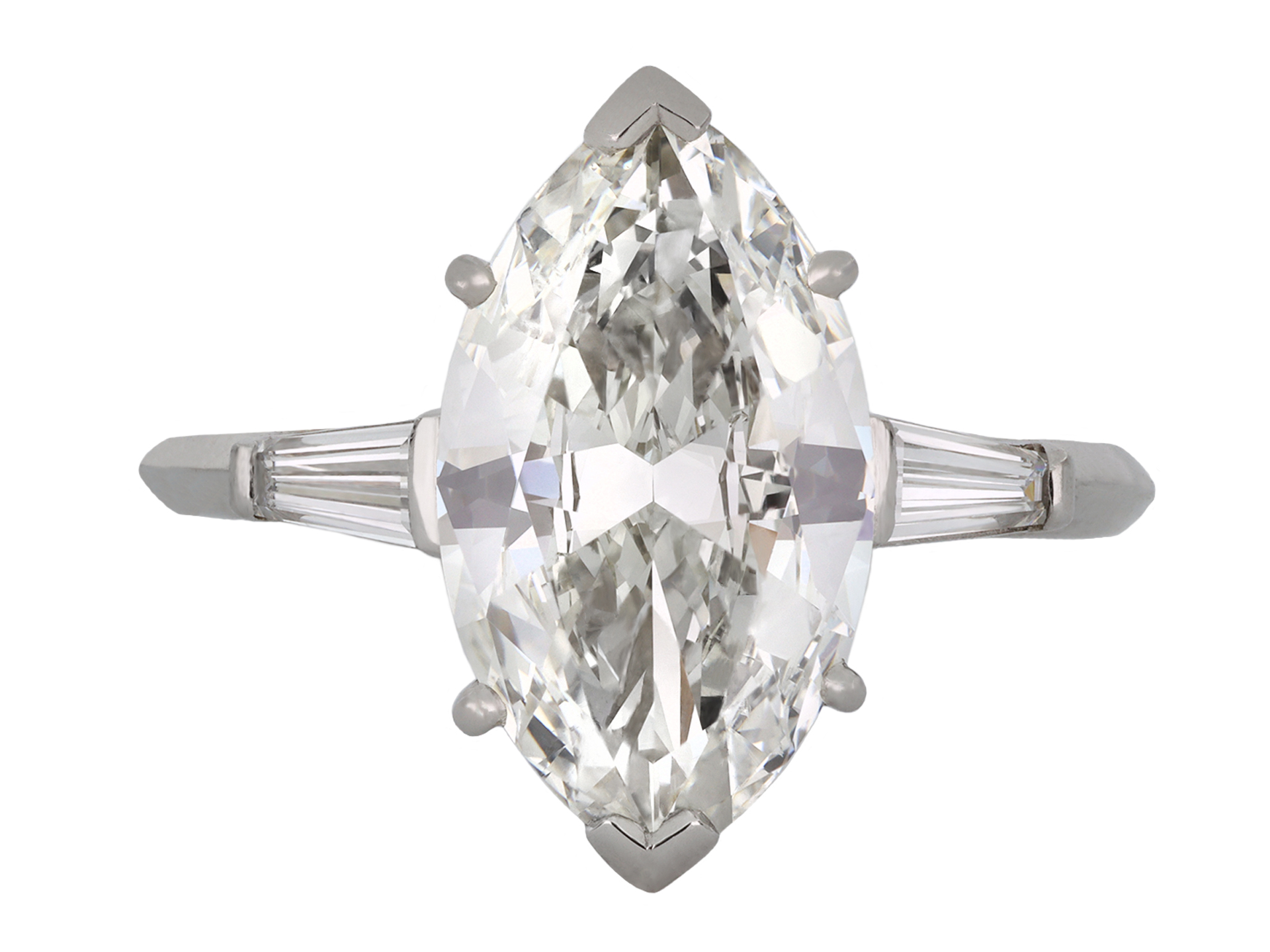 Boucheron marquise shape diamond ring. Set to centre with a marquise shape old cut diamond, I colour, SI1 clarity, with an approximate weight of 3.04 carats in an open back claw setting, flanked by two tapered baguette cut diamonds in open back half rubover settings with a combined weight of 0.50 carats. The total approximate diamond weight is 3.54 carats, to a flanked solitaire design featuring curving claws, a structured linear gallery and open backholing, leading to raised shoulders and flowing through to a solid chamfered edge shank. Tested platinum, marked 'BOUCHERON', maker's mark 'AJV' for 'Atelier de Joaillerie Vendôme' French, circa 1950, accompanied by Gemological Institute of America (GIA) report #7235202931