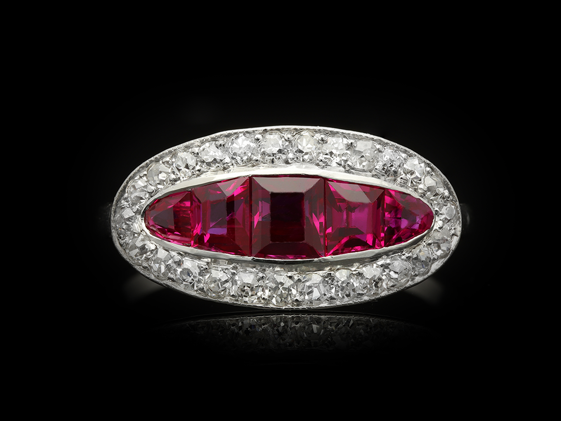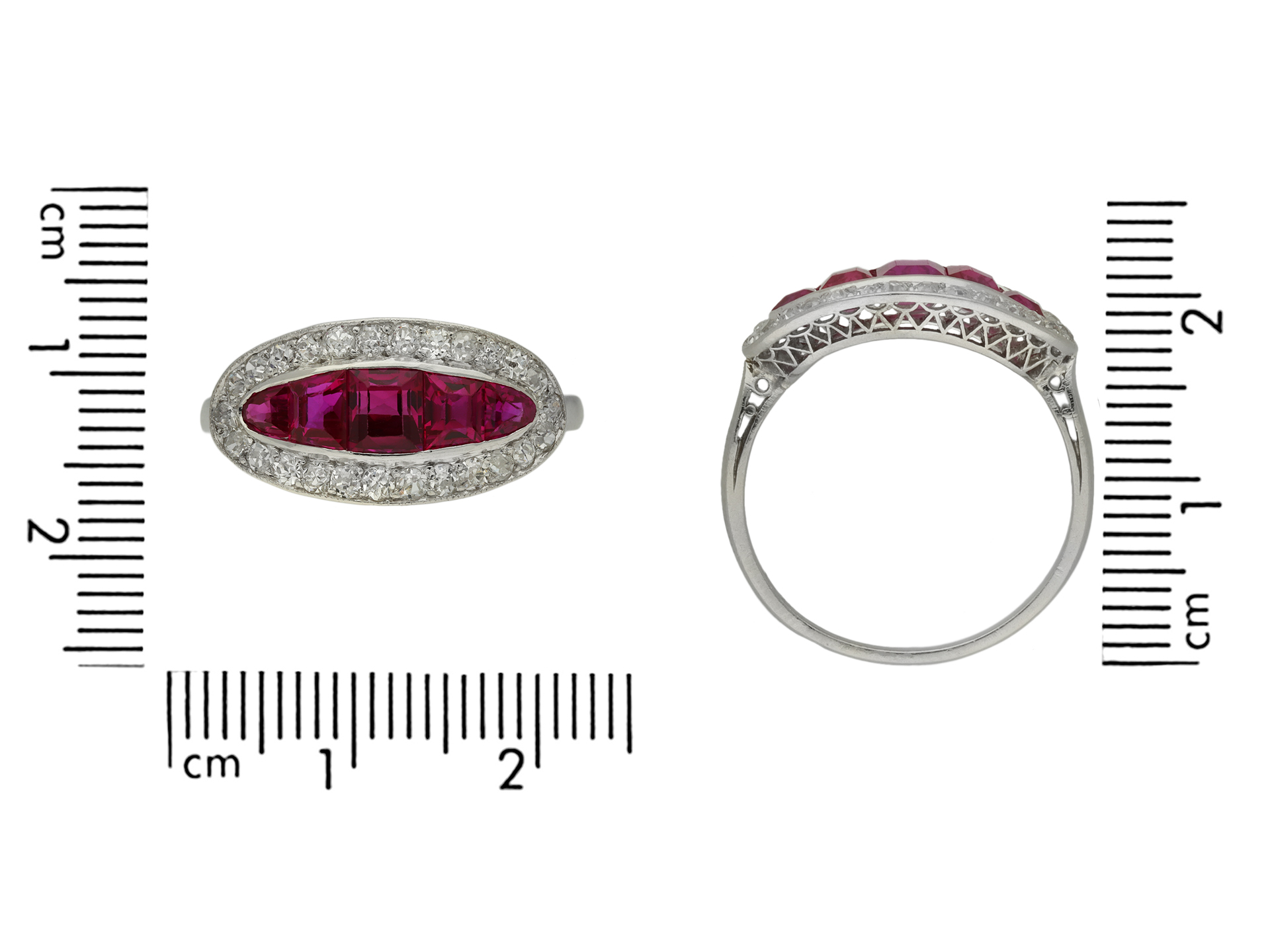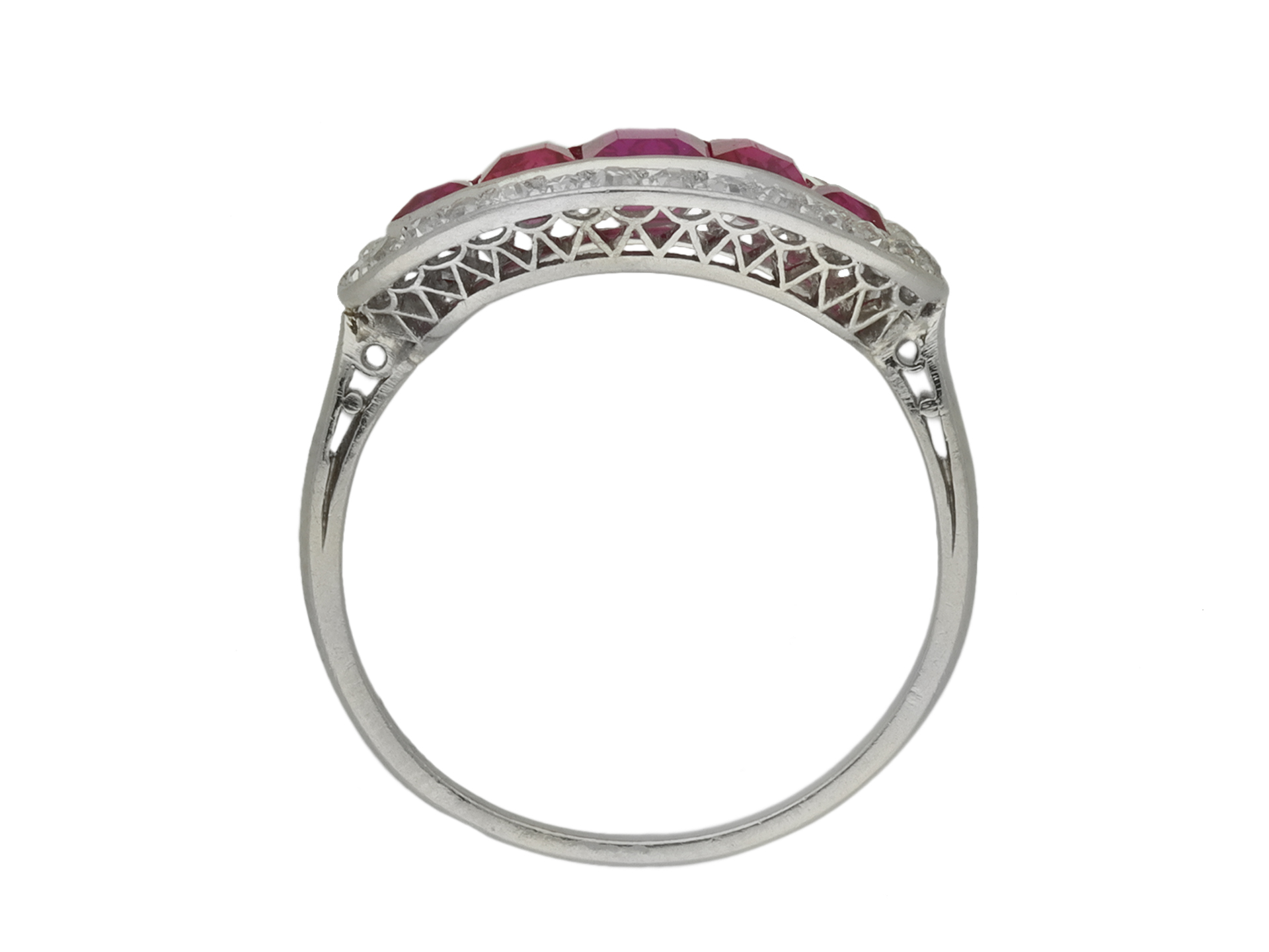 Burmese ruby and diamond saddle ring. Horizontally set with five tapered step cut natural unenhanced Burmese rubies in open back rubover settings with an approximate combined weight of 1.20 carats, encircled by a single row of twenty six round old cut diamonds in open back grain settings with an approximate combined weight of 0.75 carats, to an elegant saddle design featuring millegrain and polished edging, an intricately pierced geometric gallery and fancy open backholing, leading to raised shoulders with chenier detail and flowing through to a tapered D-shaped shank. Marked white gold and platinum, makers mark for 'Bré & Mialet', French, circa 1910.