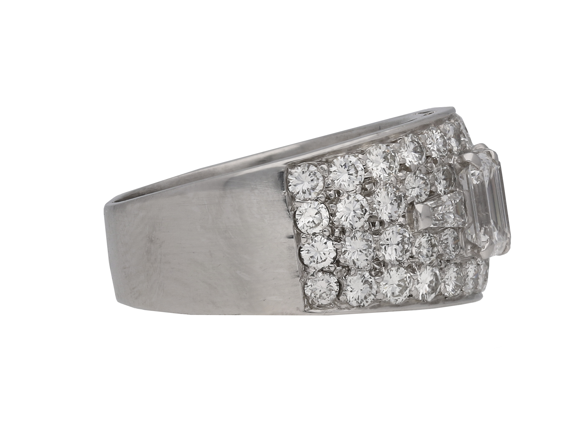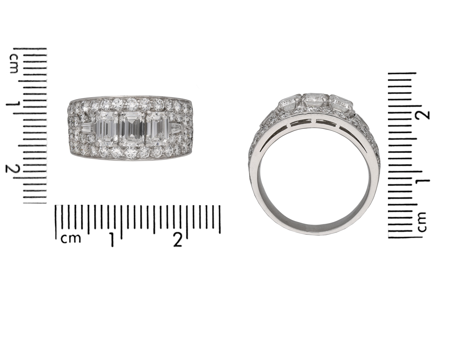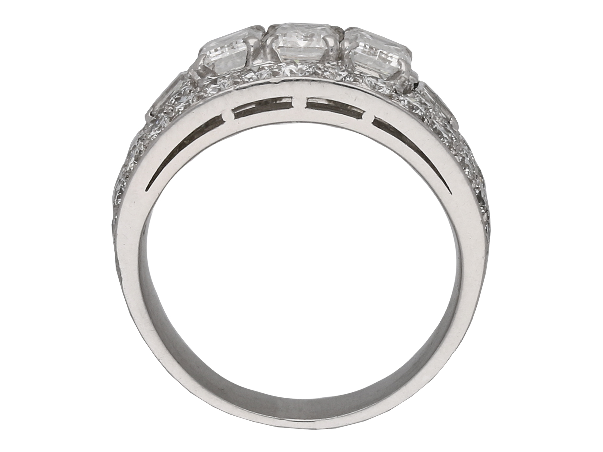 Bulgari diamond cluster 'Trombino' ring. Set horizontally to centre with three octagonal emerald-cut diamonds in open back claw settings with an approximate combined weight of 1.30 carats, tapered baguette cut diamonds in open back half rubover settings with a combined weight of 0.14 carats, further decorated with fifty four round brilliant cut diamonds in open back grain settings with a combined weight of 1.35 carats. The total approximate diamond weight is 2.79 carats to an embellished cluster design featuring polished borders, an intricately pierced linear gallery and angular open backholing, leading to smooth shoulders and tapering through to a solid flat shank. Tested platinum, signed 'BVLGARI', circa 1960.