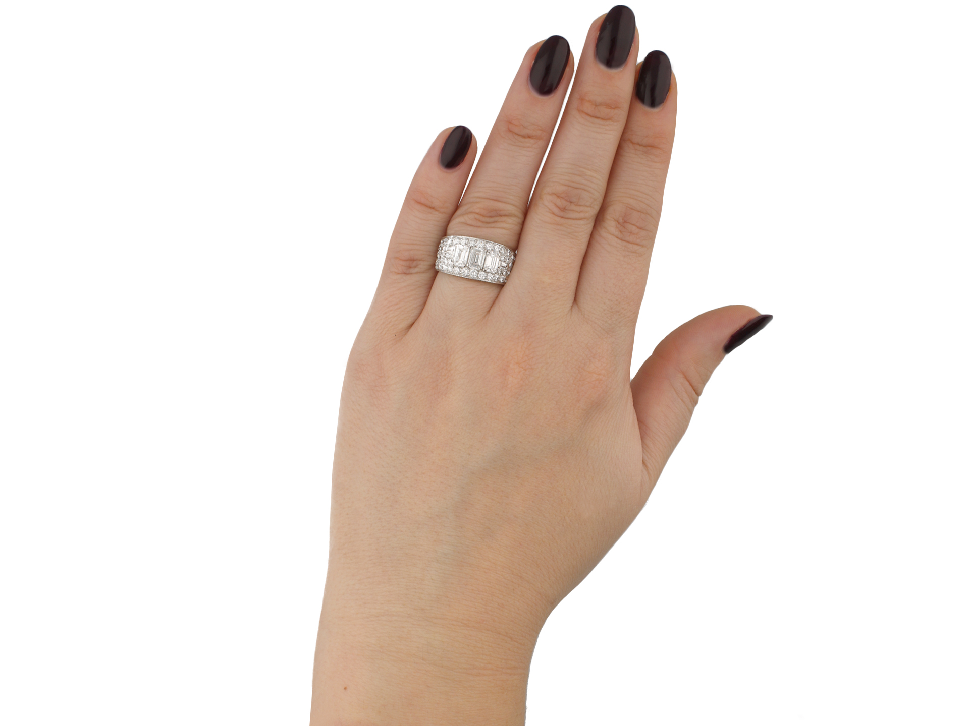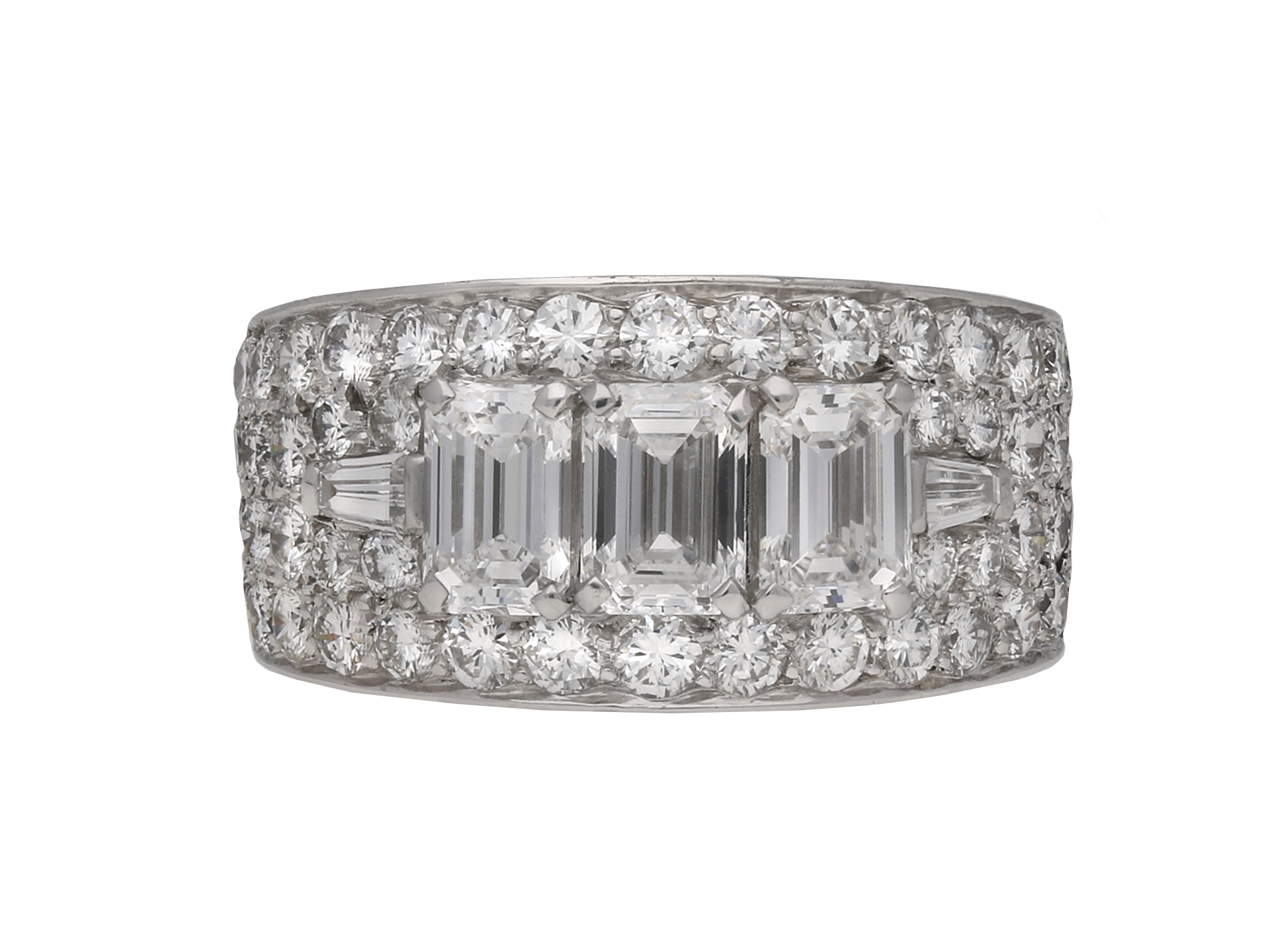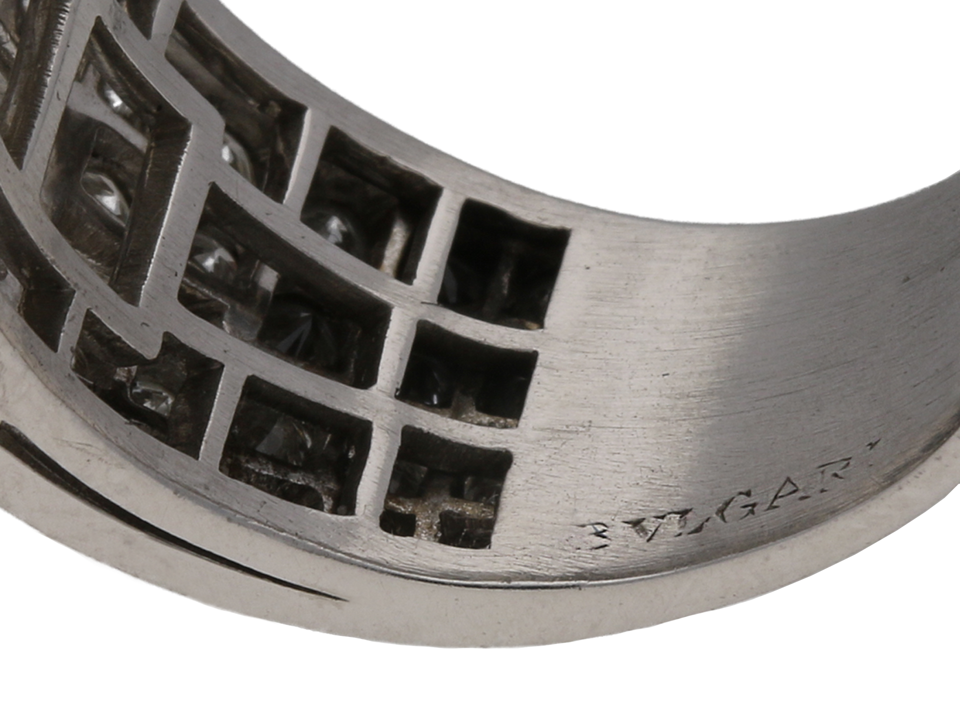Bulgari diamond cluster 'Trombino' ring. Set horizontally to centre with three octagonal emerald-cut diamonds in open back claw settings with an approximate combined weight of 1.30 carats, tapered baguette cut diamonds in open back half rubover settings with a combined weight of 0.14 carats, further decorated with fifty four round brilliant cut diamonds in open back grain settings with a combined weight of 1.35 carats. The total approximate diamond weight is 2.79 carats to an embellished cluster design featuring polished borders, an intricately pierced linear gallery and angular open backholing, leading to smooth shoulders and tapering through to a solid flat shank. Tested platinum, signed 'BVLGARI', circa 1960.