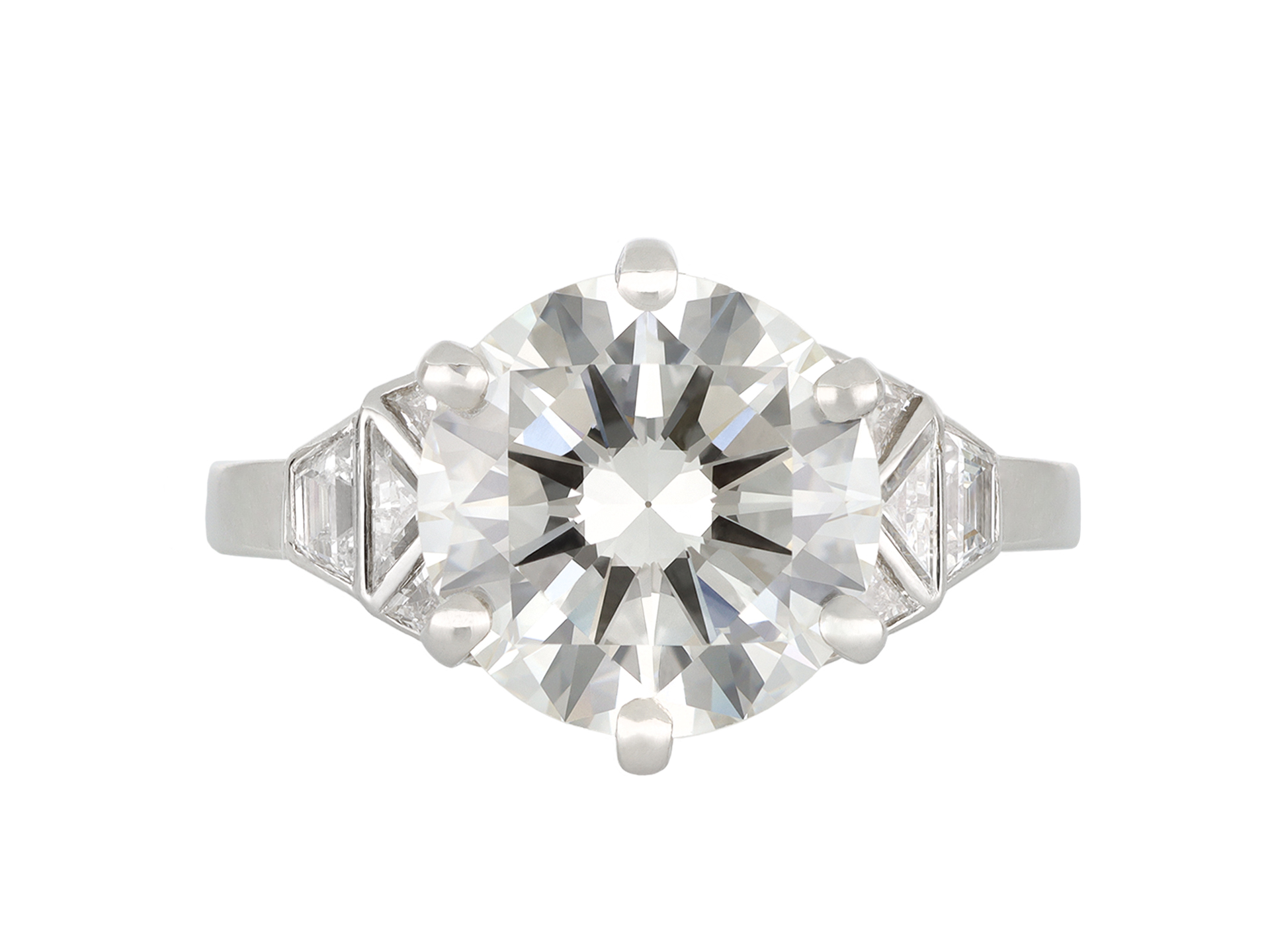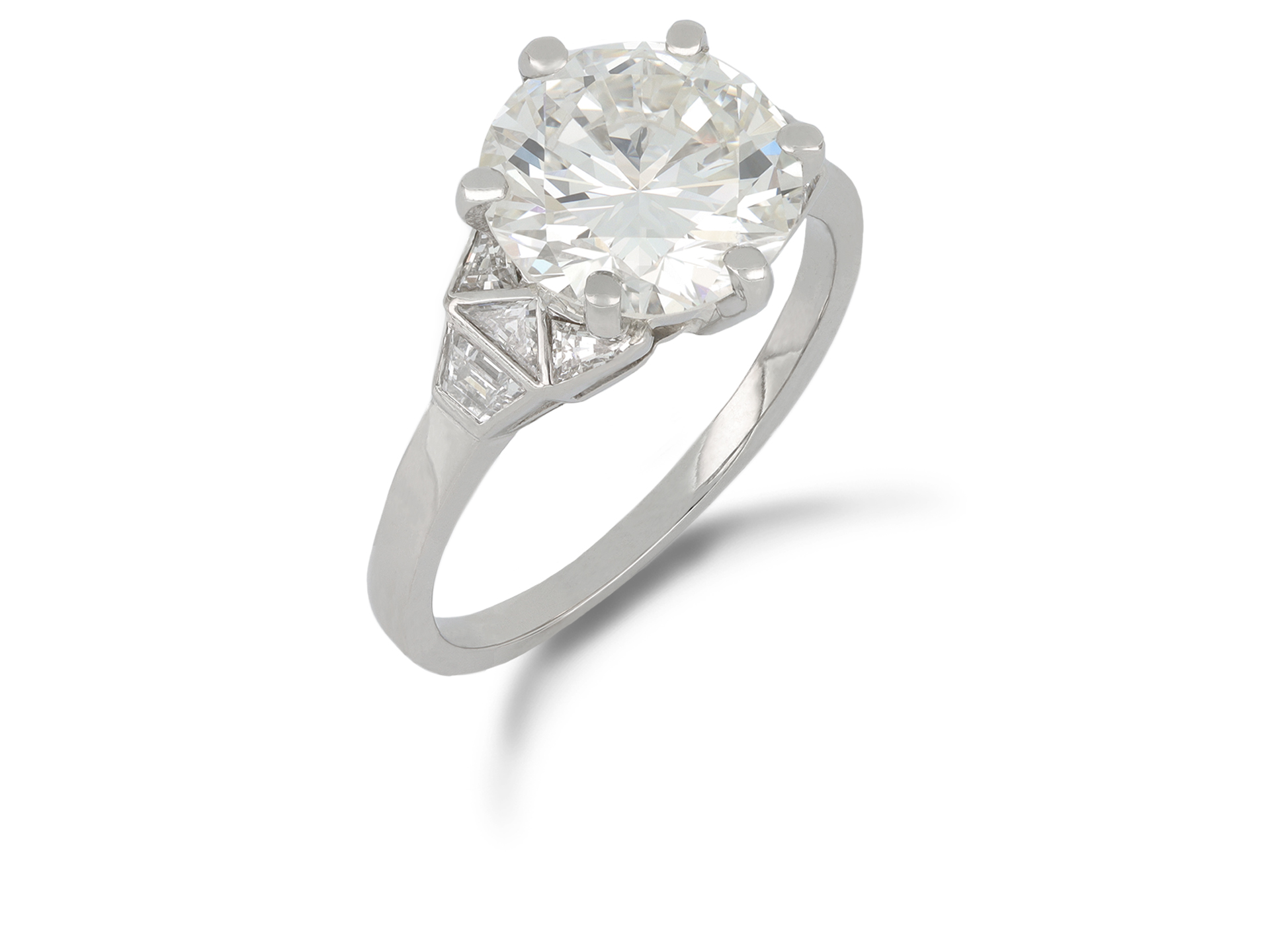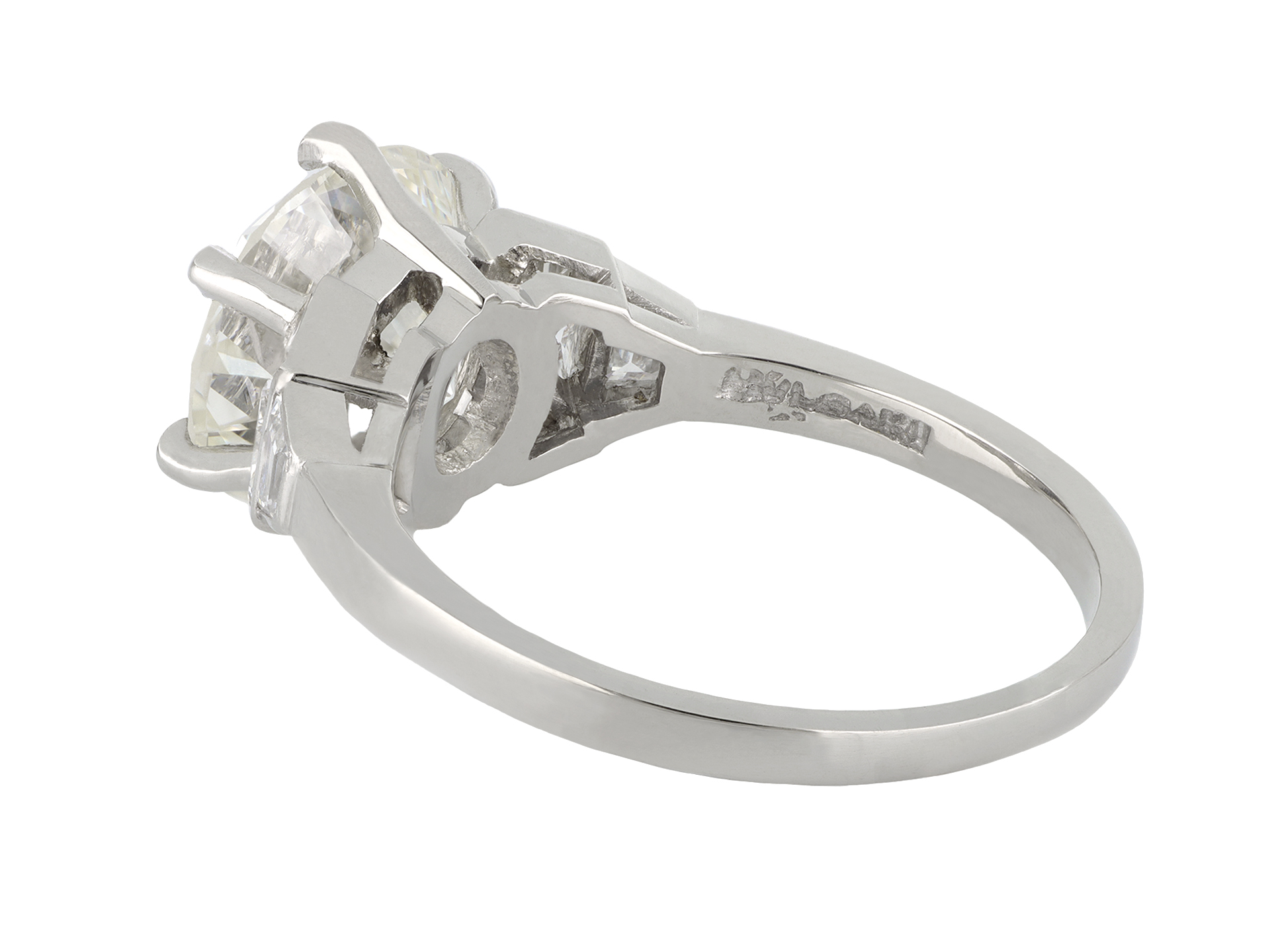 Bulgari diamond flanked solitaire ring. Centrally set with a round transitional cut diamond, J colour, VVS2 clarity with a weight of 2.50 carats in an open back claw setting, flanked by six triangular brilliant cut diamonds in open back rubover settings with an approximate combined weight of 0.35 carats, further set with two tapered baguette cut diamonds in open back rubover settings with a combined weight of 0.15 carats. The total approximate diamond weight is 3.00 carats, to an elegant design with curving claws, an intricately pierced gallery and fancy open backholing leading to smooth shoulders which flow through to a solid shank. Tested platinum, signed 'Bulgari', circa 1950, accompanied by Gemological Institute of America (GIA) report #5234334376.