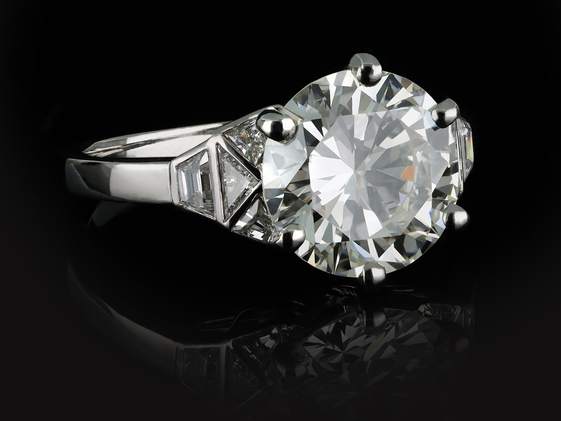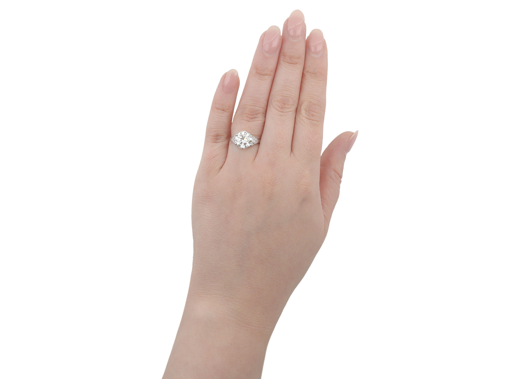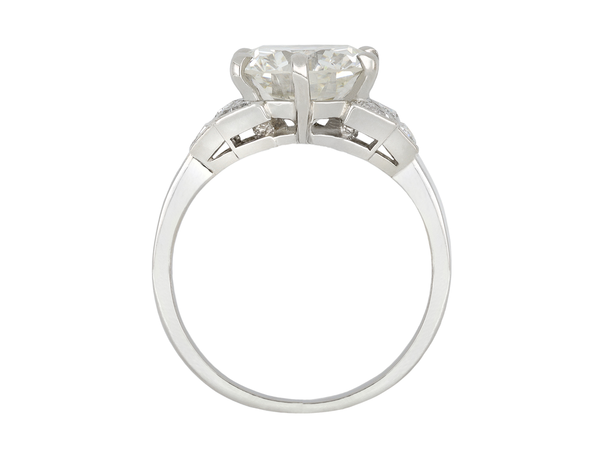 Bulgari diamond flanked solitaire ring. Centrally set with a round transitional cut diamond, J colour, VVS2 clarity with a weight of 2.50 carats in an open back claw setting, flanked by six triangular brilliant cut diamonds in open back rubover settings with an approximate combined weight of 0.35 carats, further set with two tapered baguette cut diamonds in open back rubover settings with a combined weight of 0.15 carats. The total approximate diamond weight is 3.00 carats, to an elegant design with curving claws, an intricately pierced gallery and fancy open backholing leading to smooth shoulders which flow through to a solid shank. Tested platinum, signed 'Bulgari', circa 1950, accompanied by Gemological Institute of America (GIA) report #5234334376.