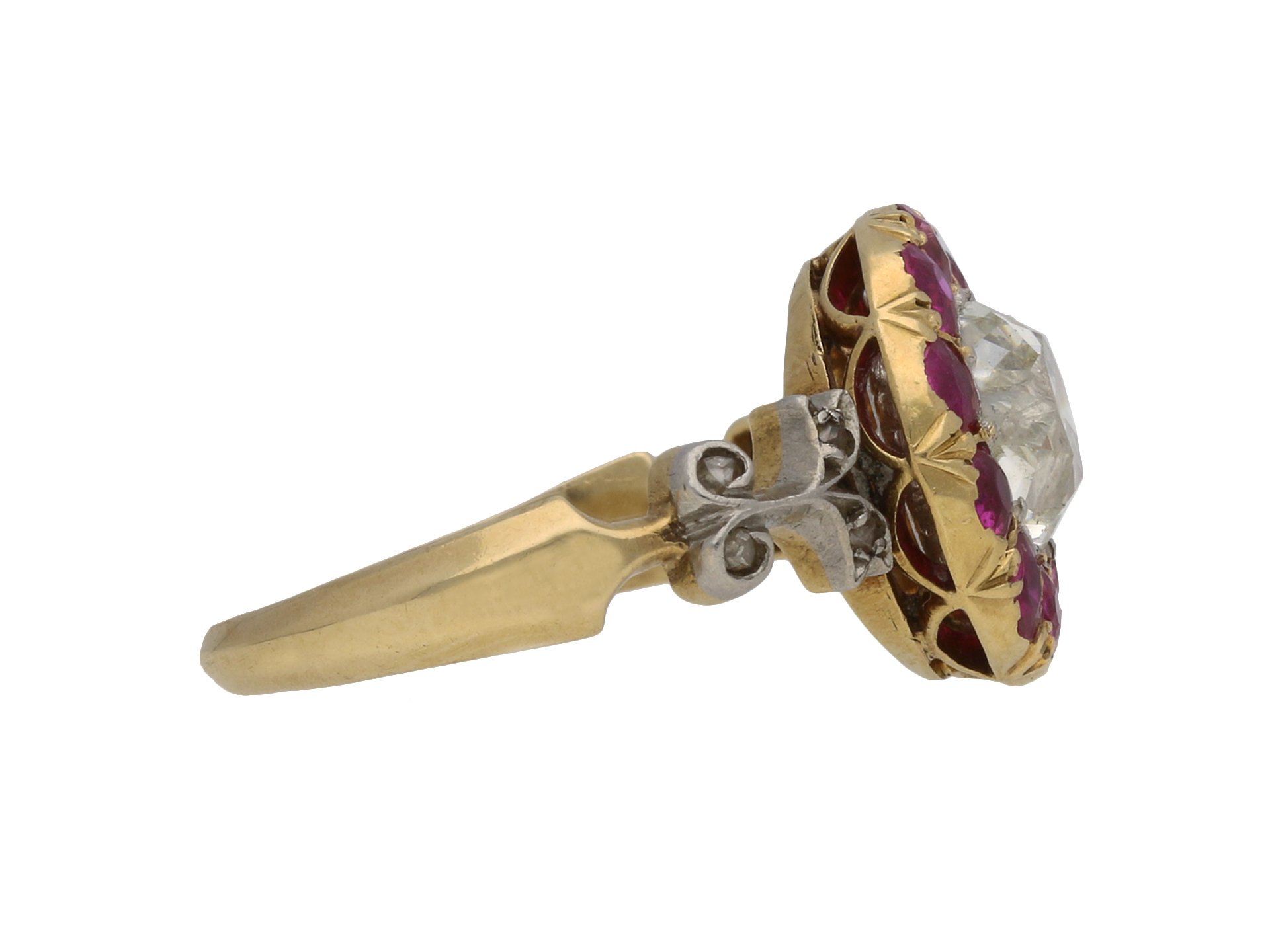Belle Époque diamond and Burmese ruby coronet cluster ring by Maurice Beck. Set to centre with a cushion shape old mine diamond in an open back grain setting with an approximate weight of 1.60 carats, encircled by ten round old cut natural no heat Burmese rubies in open back grain settings with a combined approximate weight of 0.80 carats, further adorned with eight rose cut diamonds in open back grain settings with a combined weight of 0.02 carats. The total approximate diamond weight is 1.62 carats, to an elegant coronet cluster design featuring an engraved border, an intricately pierced scalloped gallery and fancy shape open backholing, flanked by stylised foliate form shoulders flowing through to a chamfered solid tapering shank. Marked 18 carat yellow gold, settings tested platinum, maker's mark for Maurice Beck, French, circa 1910.