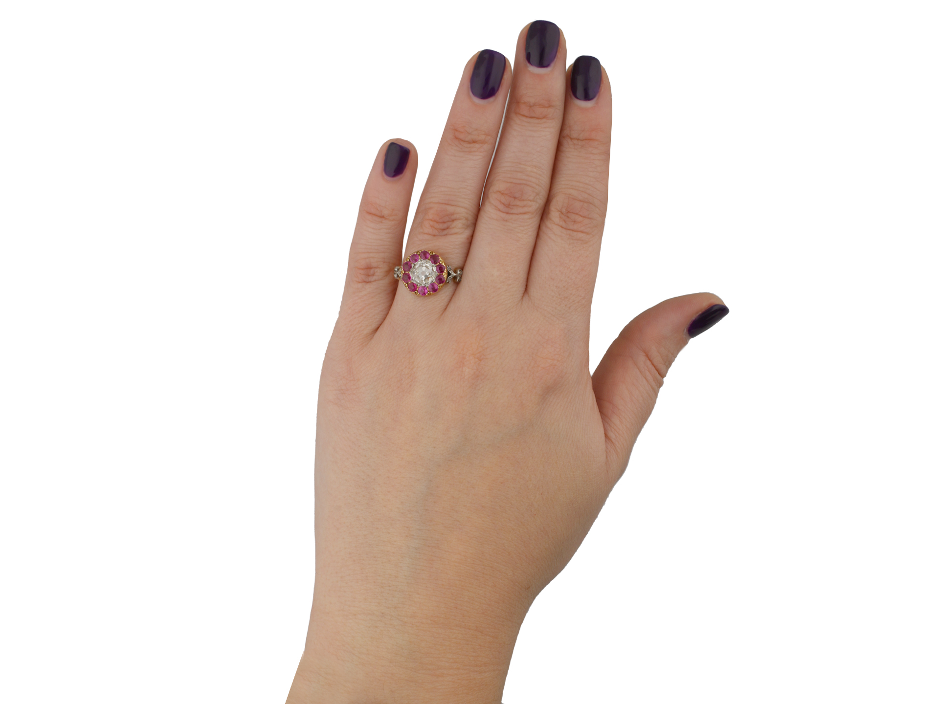 This is an exceptional ring of unusual composition, with the diamond featured centrally and surrounded by beautifully matching rubies of Burmese origin, which would have been an incredibly difficult feat to source!