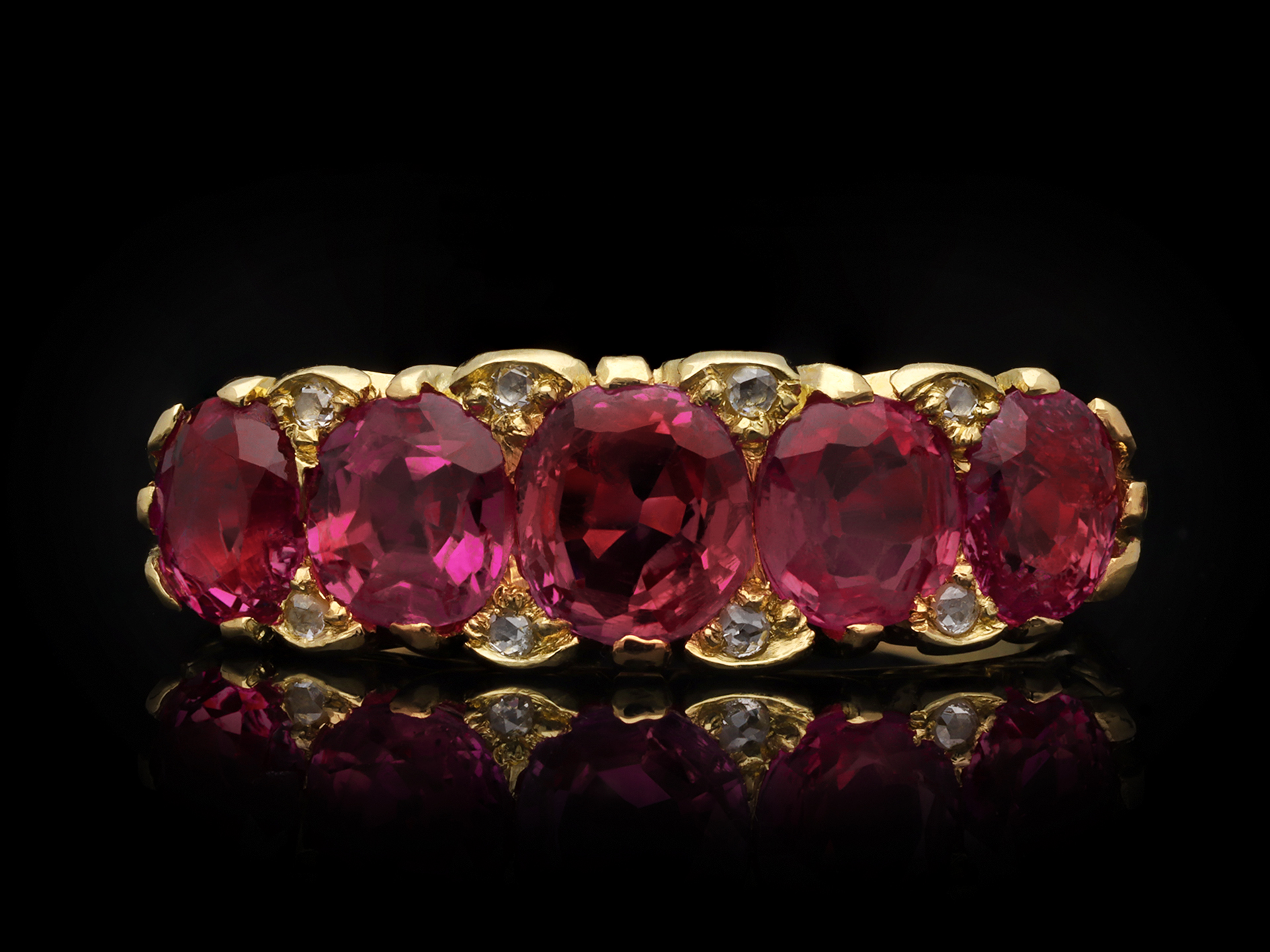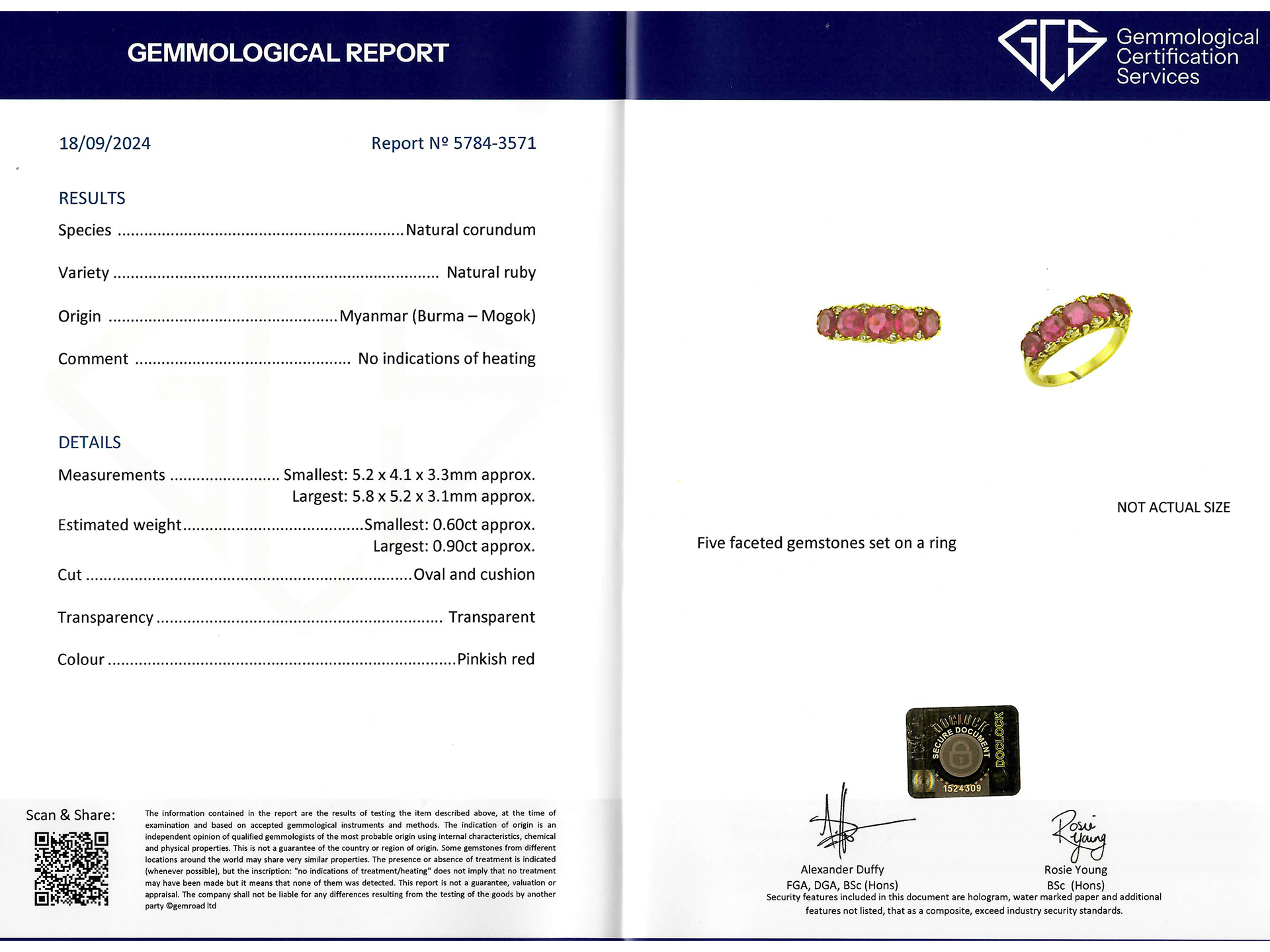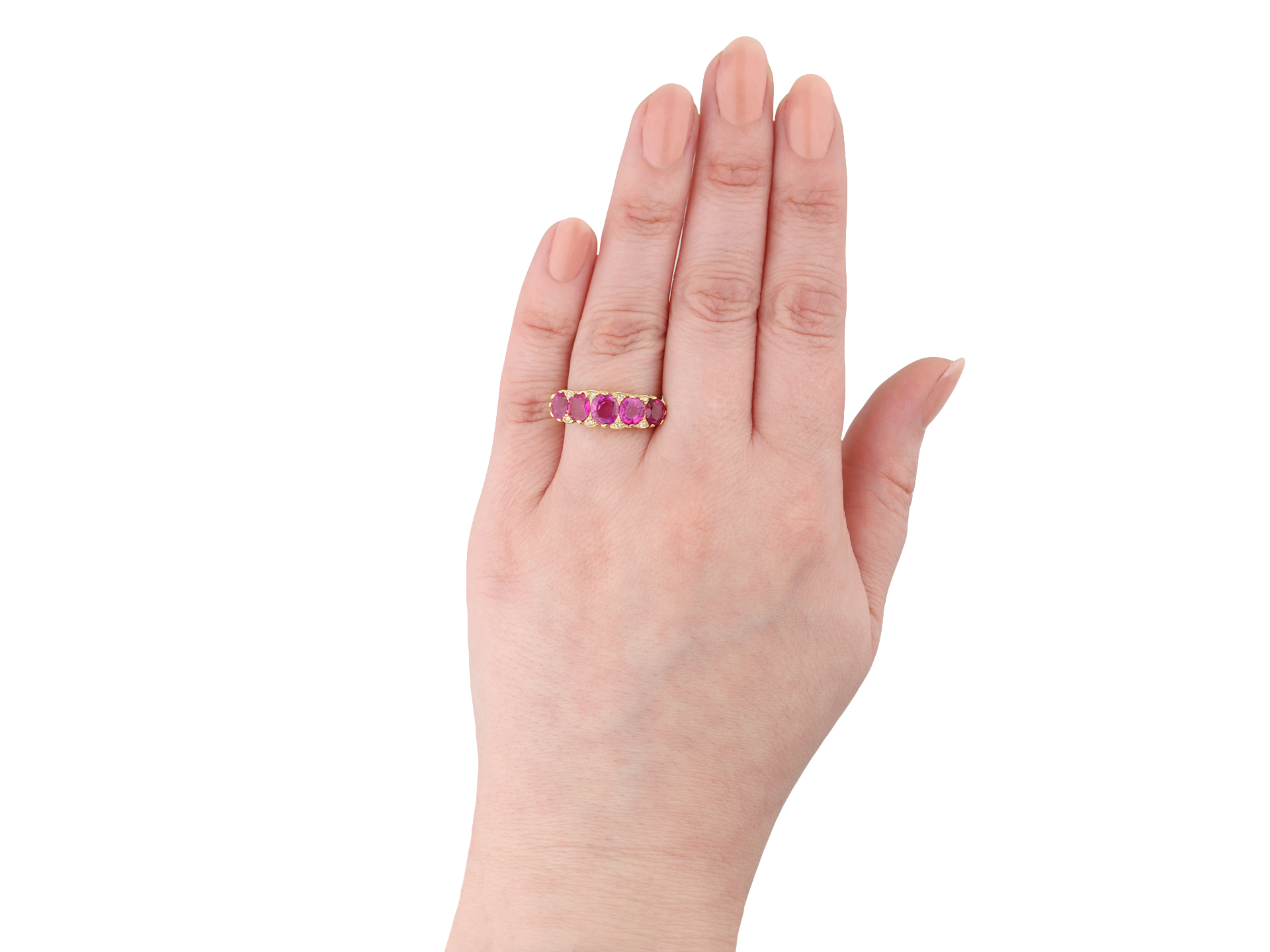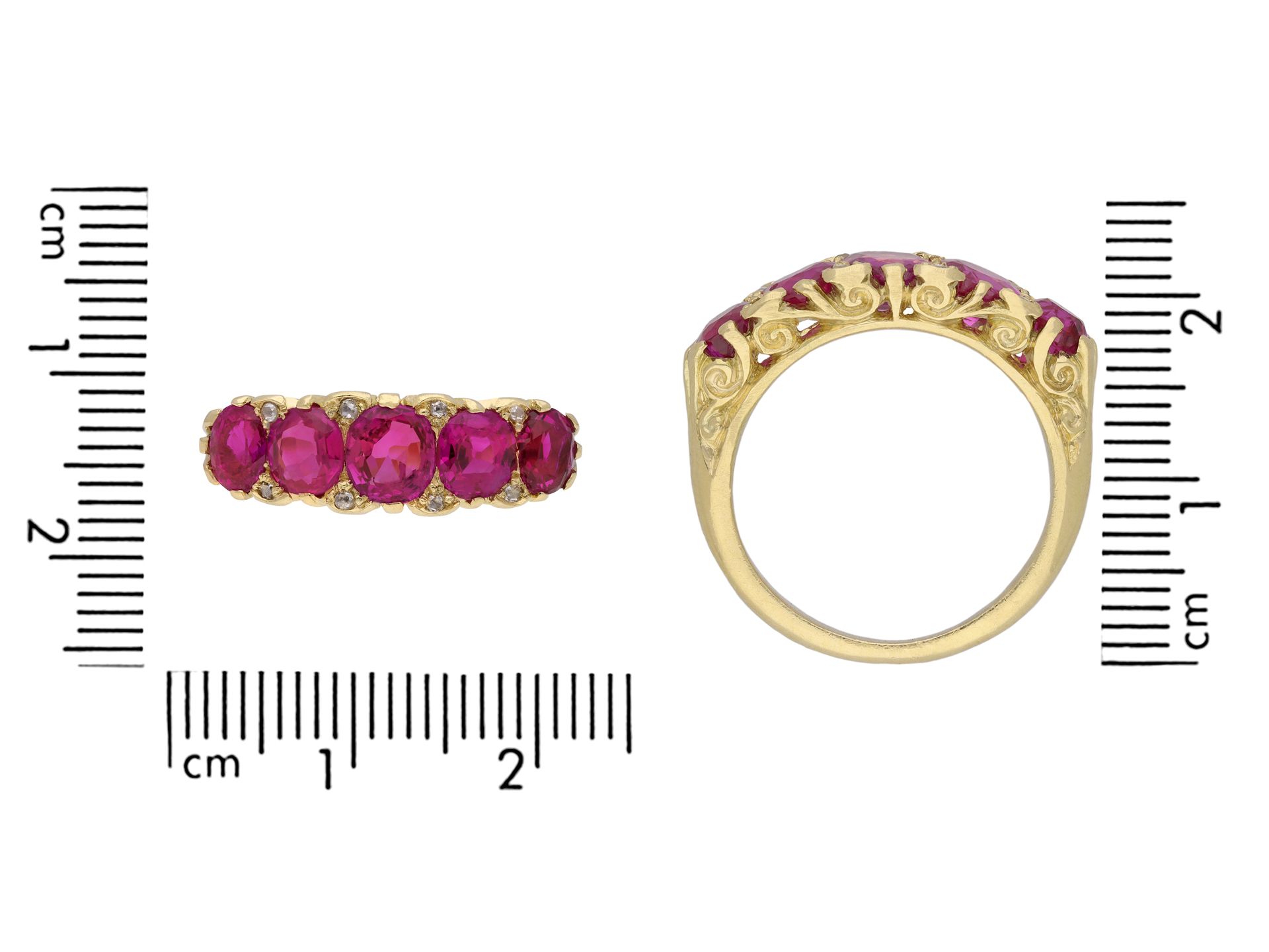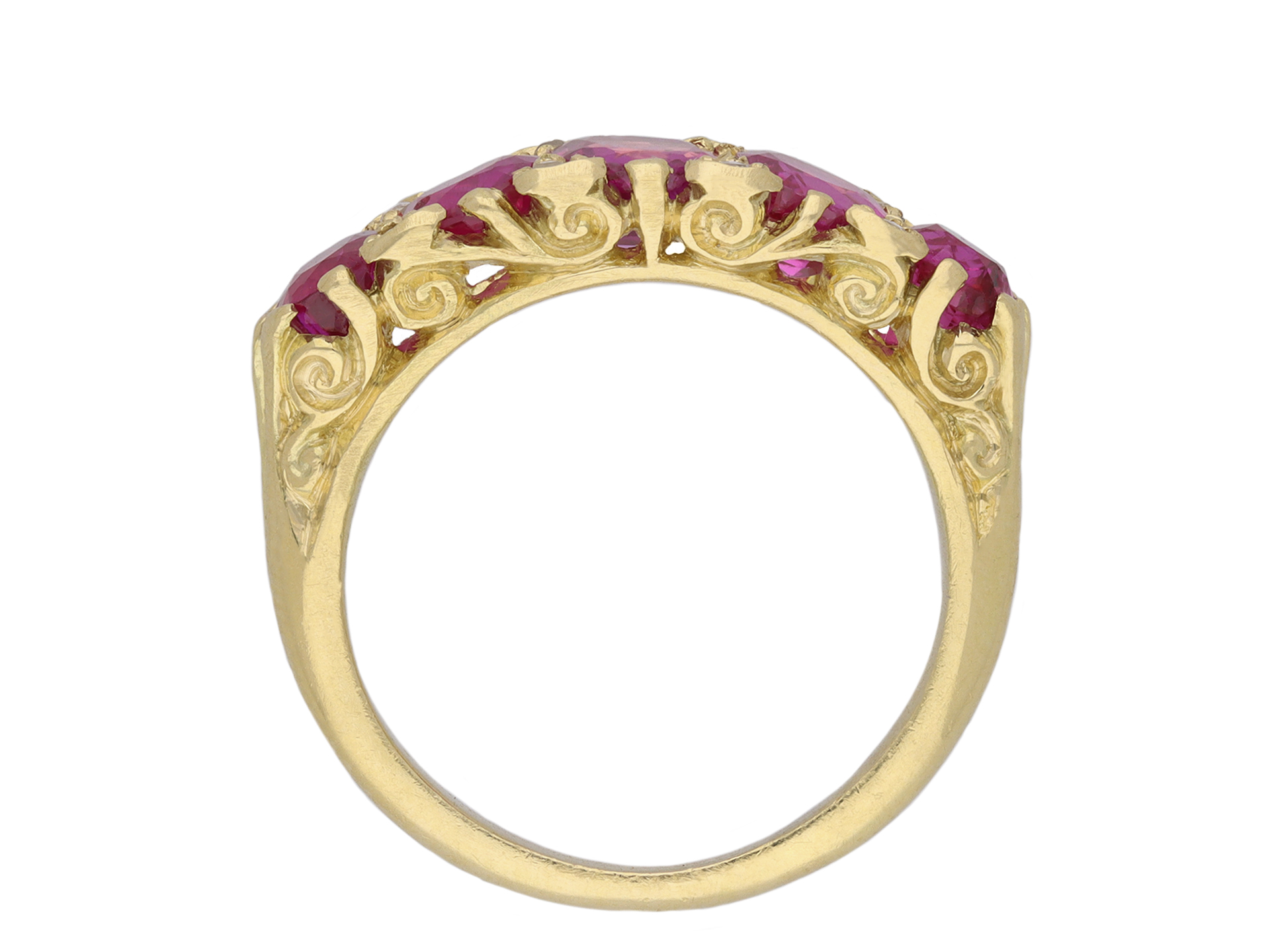 Burmese ruby five stone ring. Horizontally set with a graduated row of five cushion shape old cut natural no heat rubies in open back claw settings with an approximate combined weight of 3.40 carats, further set with eight round rose cut diamonds in closed back rubover settings with an approximate combined weight of 0.08 carats, to an elegant half hoop design, with an intricately carved gallery with scrolling motifs and open backholing, flanked by trumpeting shoulders with ornate detail and leading through to a solid tapering D-shape shank. Tested 18 carat yellow gold, circa 1890, accompanied by Gemmological Certificate Services (GCS) 5784-3571.