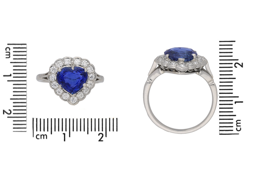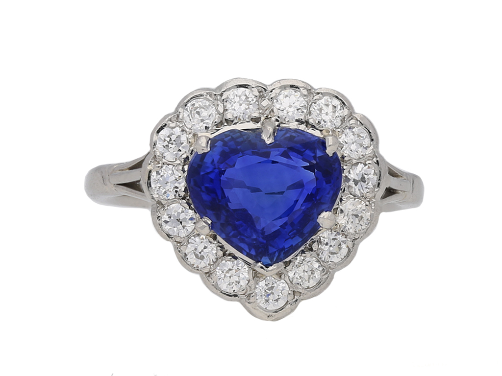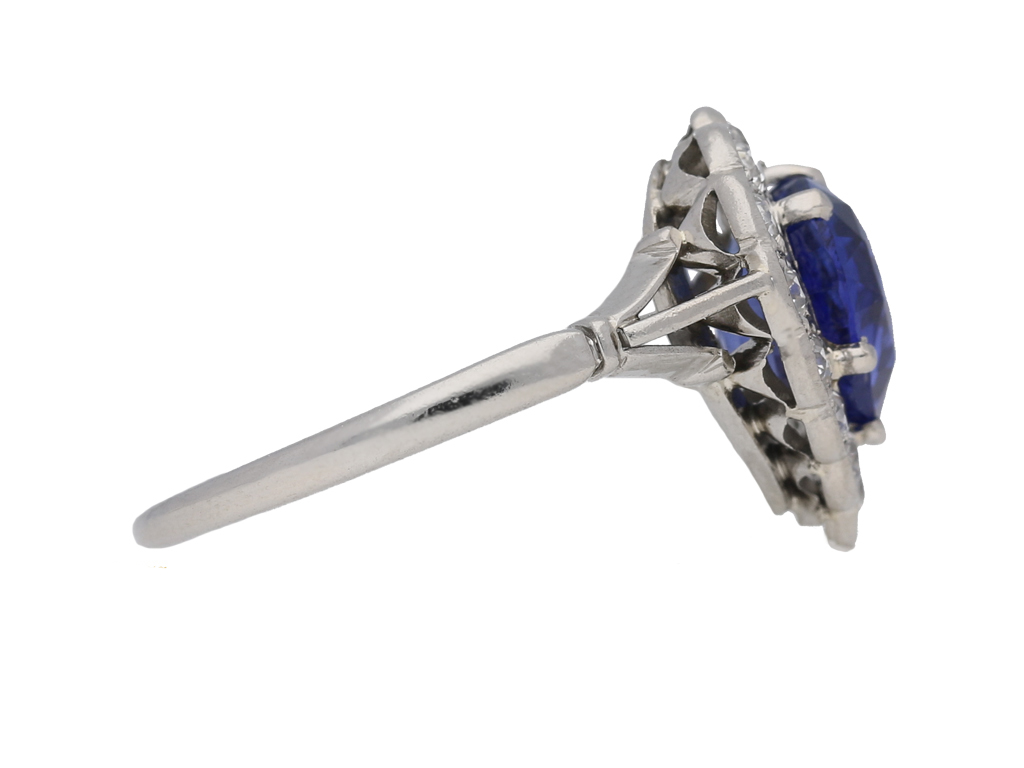 Burmese sapphire and diamond cluster ring. Set to centre with a drop shape double brilliant cut natural unenhanced Burmese sapphire in an open back claw setting with an approximate weight of 2.40 carats, bordered by a row of fifteen round old cut diamonds in open back grain and rubover settings with an approximate combined weight of 1.00 carats, to an elegant coronet cluster design featuring curving claws, an intricately pierced scalloped gallery and fancy open backholing, flanked by tri-split shoulders flowing through to a solid tapering D-shape shank. Tested platinum, circa 1920, accompanied by Gemmological Certification Services report #80269-60.