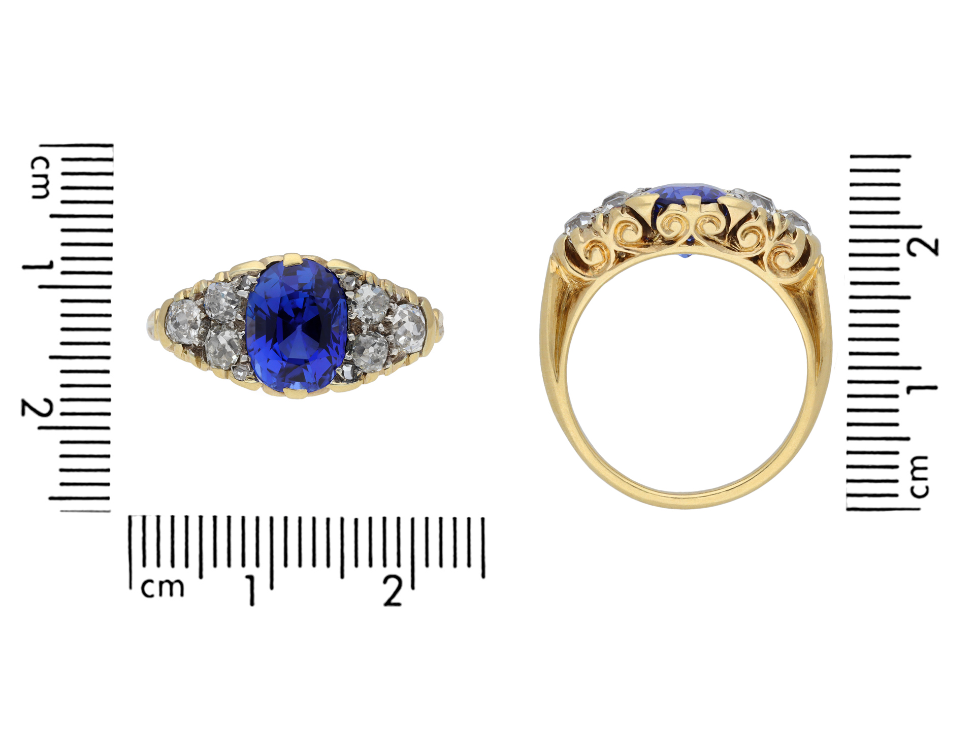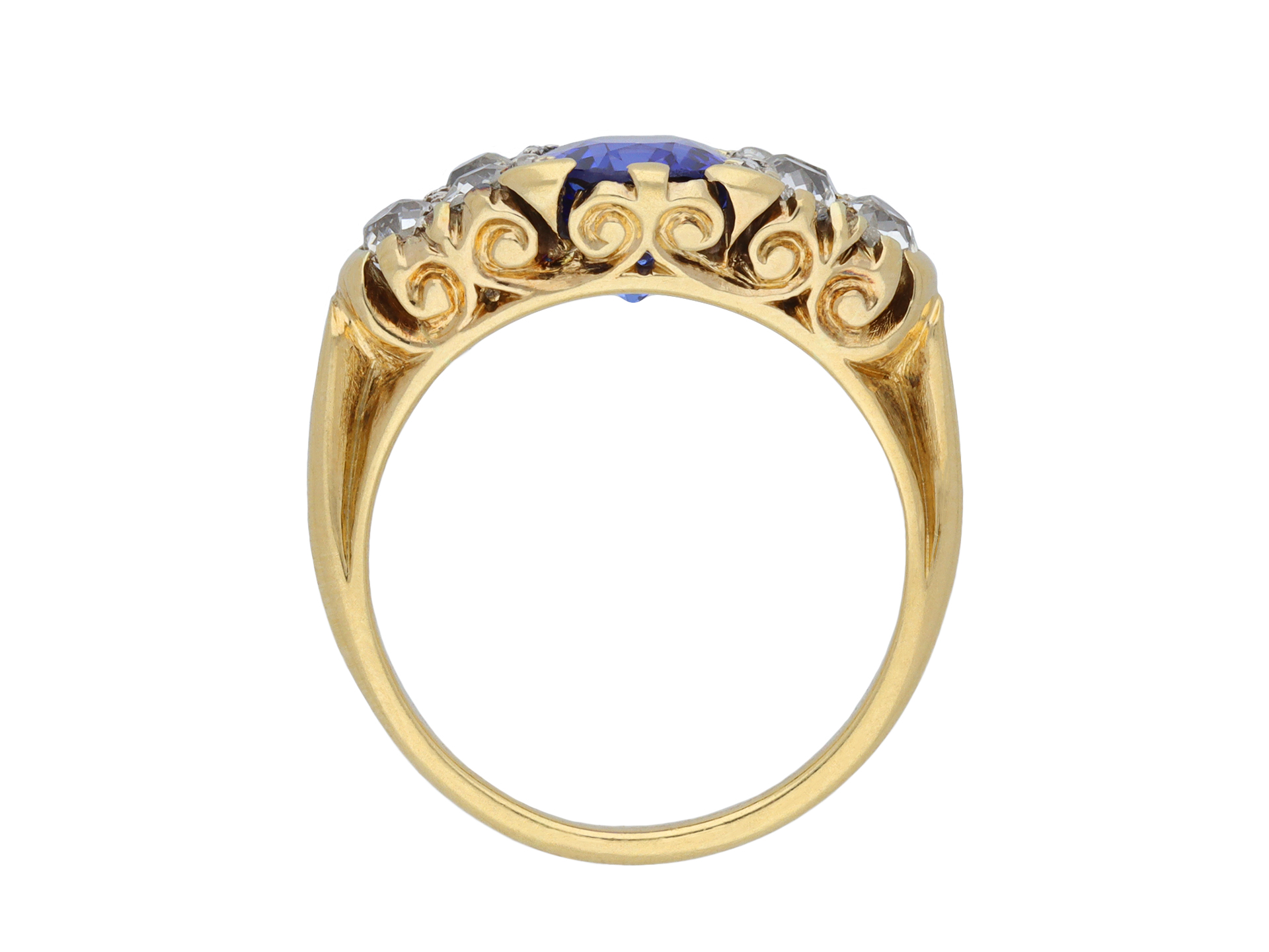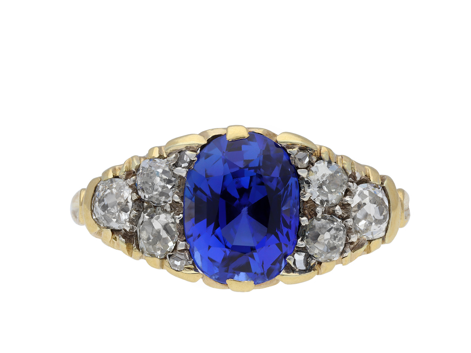 Burmese sapphire and diamond seven stone ring. Centrally set with one cushion shape old cut natural unenhanced Burmese sapphire in an open back claw and grain setting with an approximate weight of 2.80 carats, flanked by six cushion shape old mine diamonds in open back claw and grain settings with a combined approximate weight of 0.70 carats, to an impressive seven stone design featuring curving claws, an ornate carved gallery featuring scrolling motifs and fancy open backholing, the trumpeting shoulders with ridge detail flowing through to a solid D-shape shank. Tested yellow gold and silver, circa 1890, accompanied by Gemmological Certification Services report #5782-999.