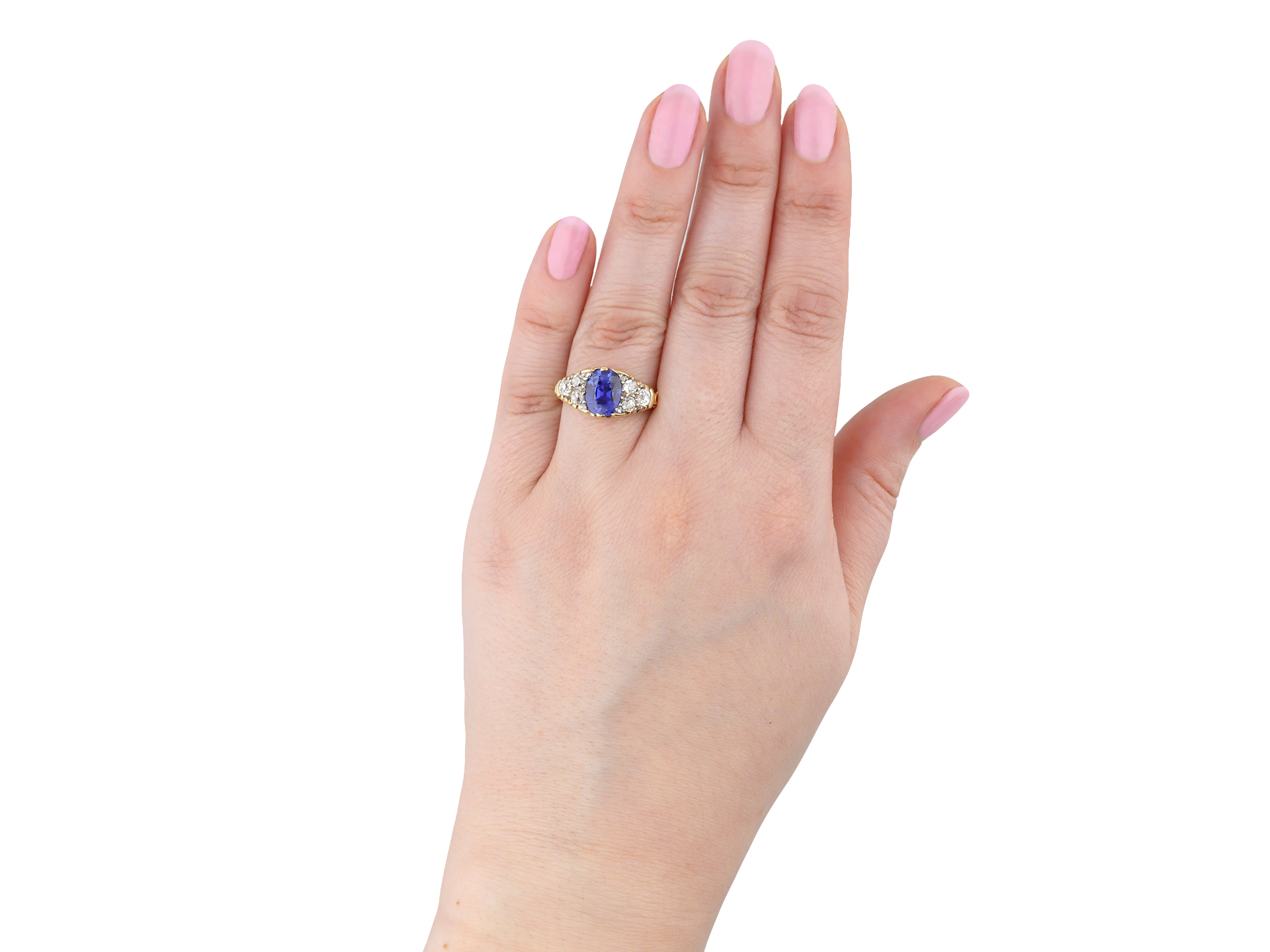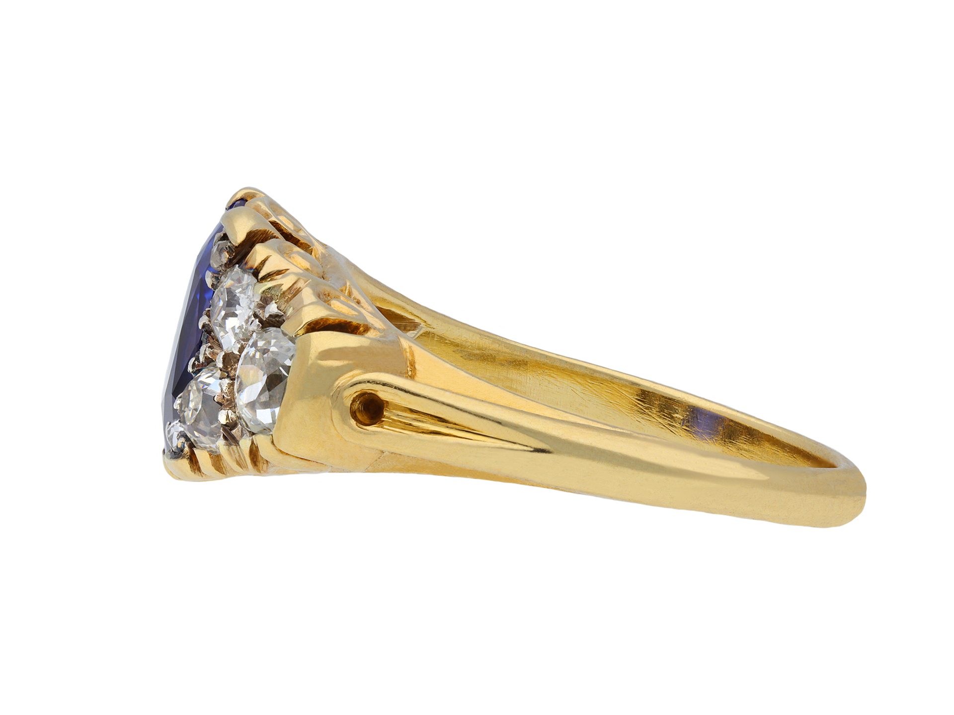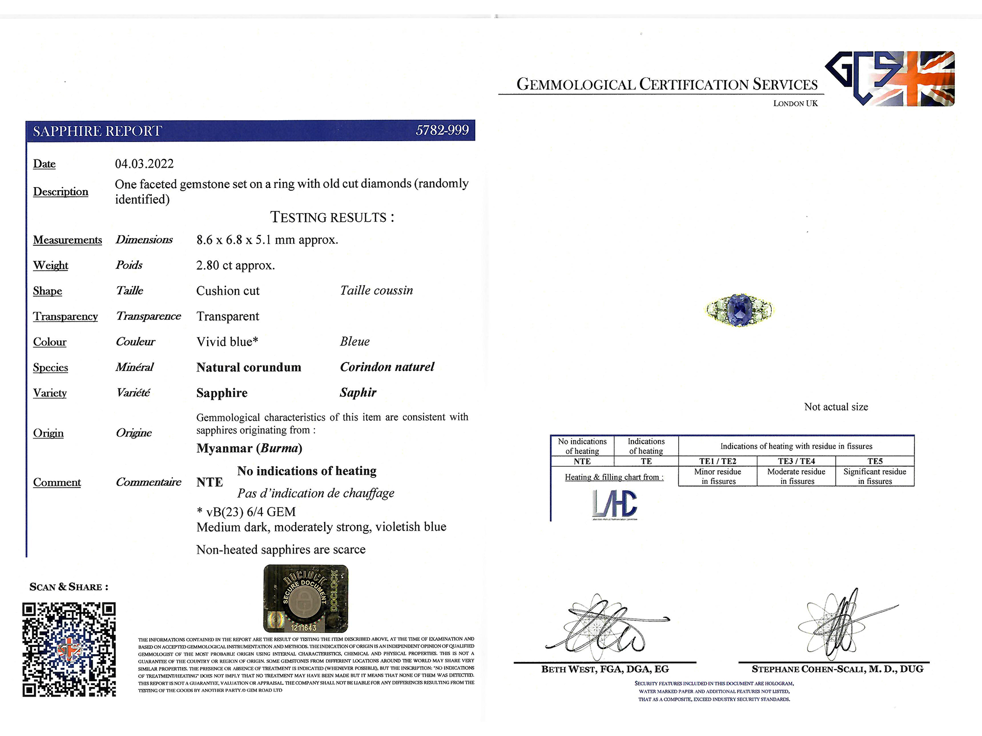 Burmese sapphire and diamond seven stone ring. Centrally set with one cushion shape old cut natural unenhanced Burmese sapphire in an open back claw and grain setting with an approximate weight of 2.80 carats, flanked by six cushion shape old mine diamonds in open back claw and grain settings with a combined approximate weight of 0.70 carats, to an impressive seven stone design featuring curving claws, an ornate carved gallery featuring scrolling motifs and fancy open backholing, the trumpeting shoulders with ridge detail flowing through to a solid D-shape shank. Tested yellow gold and silver, circa 1890, accompanied by Gemmological Certification Services report #5782-999.