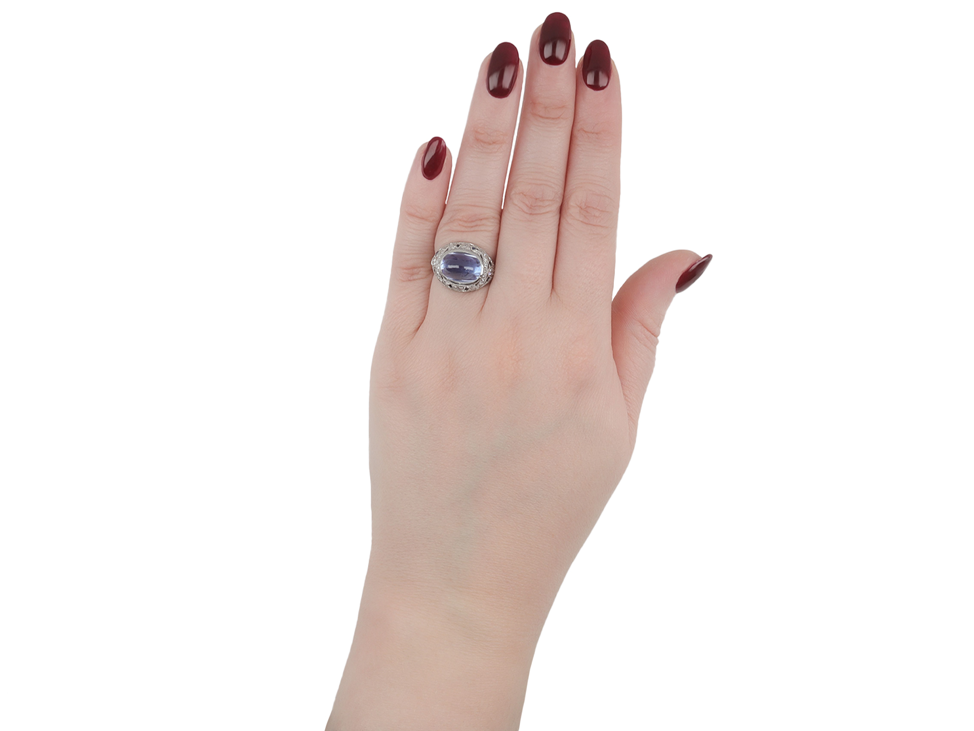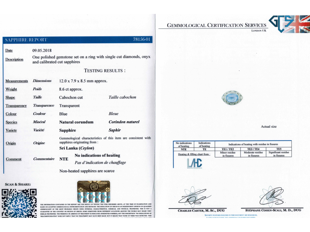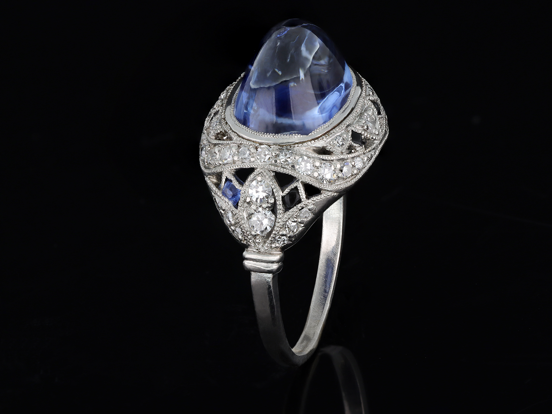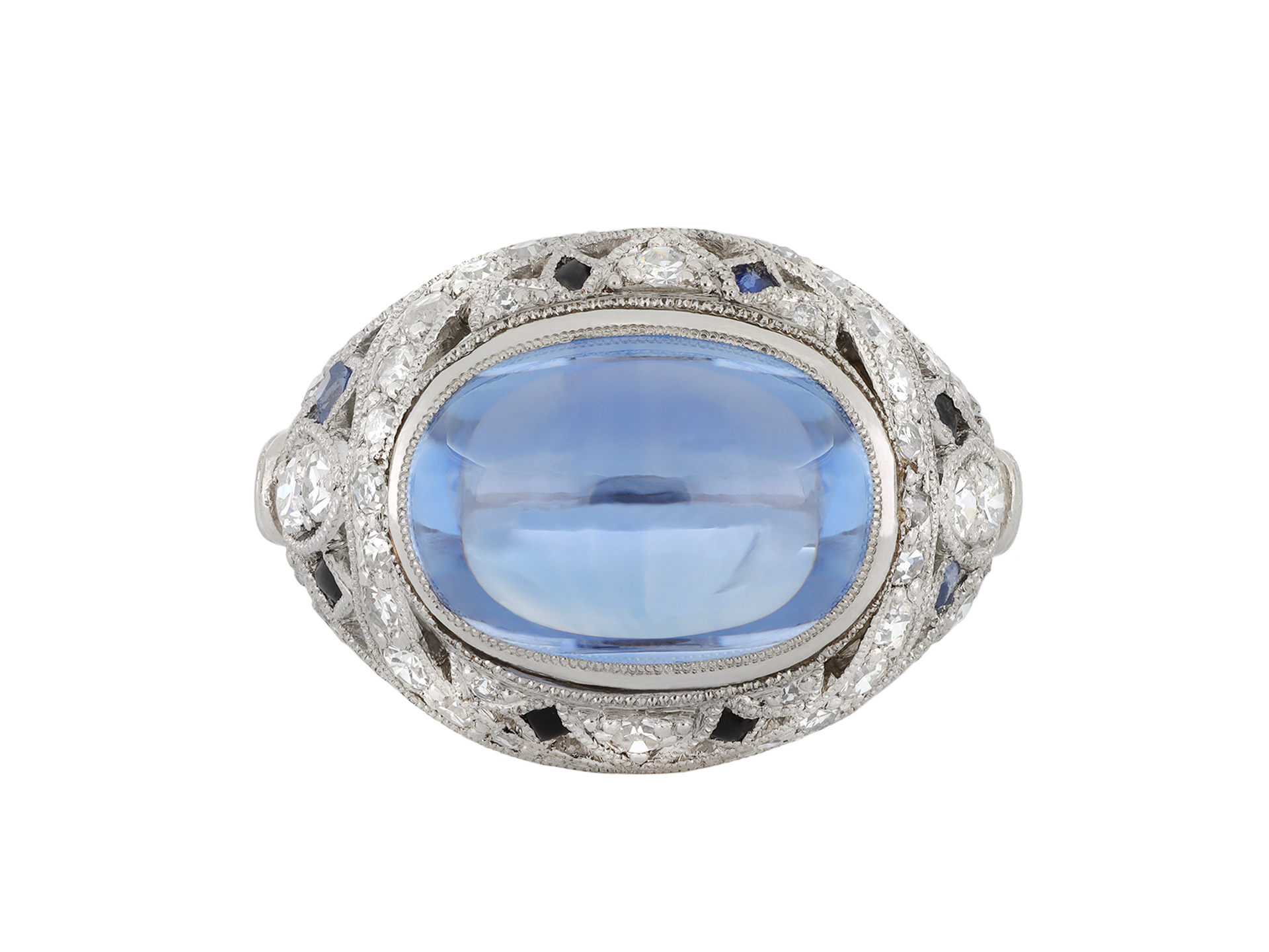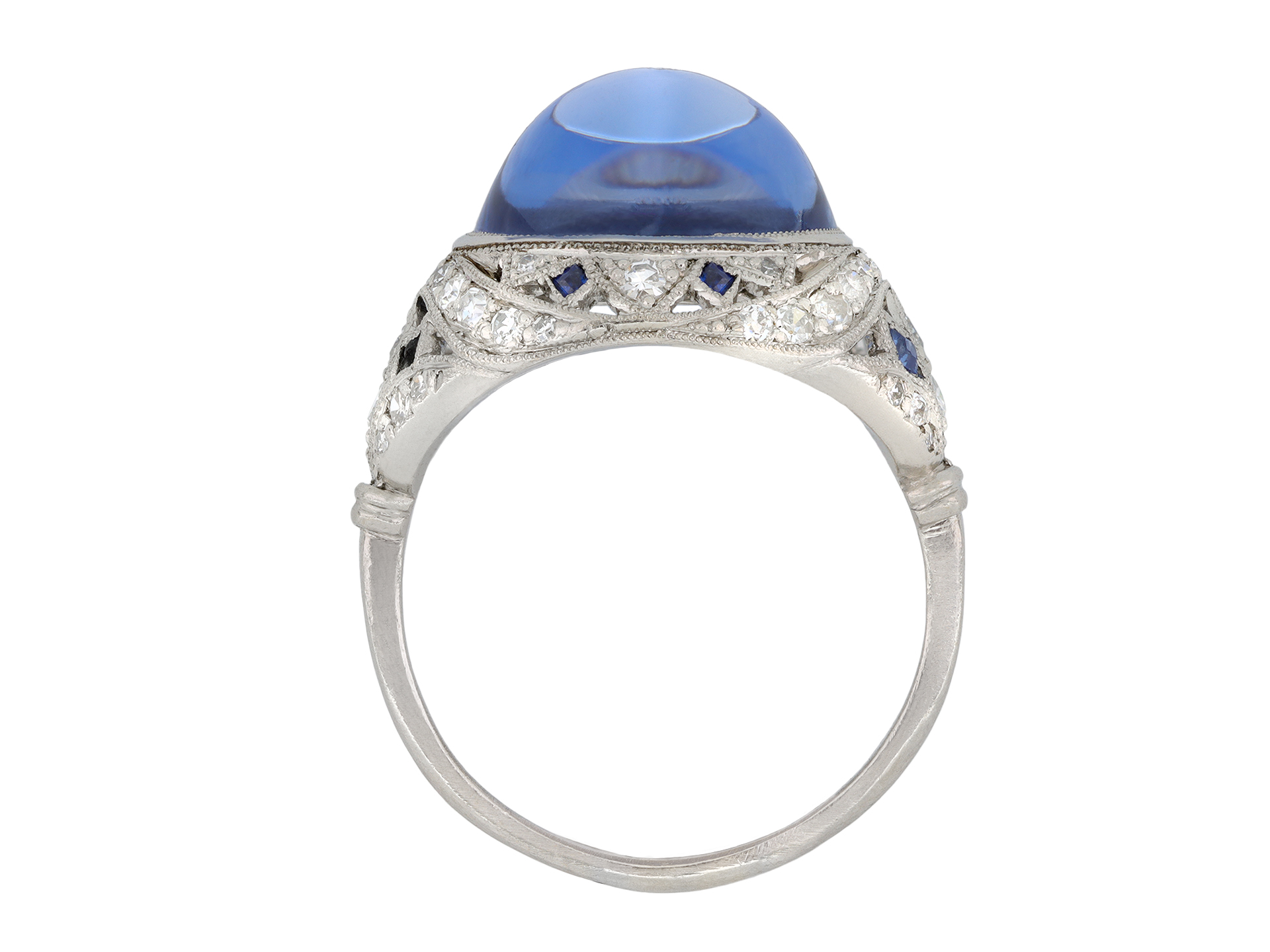 Cabochon Ceylon sapphire and diamond cluster ring. Horizontally set to centre with an oval cabochon natural unenhanced Ceylon sapphire in an open back rubover setting with an approximate weight of 8.60 carats, encircled by a cluster of fifty round old single cut diamonds in open back grain settings with an approximate combined weight of 0.50 carats, interspersed with eight triangular calibré cut natural unenhanced sapphires in open back rubover settings with a combined weight of 0.40 carats. The total approximate sapphire weight is 9.00 carats, to an ornate openwork design with millegrain borders, an intricately pierced gallery and open backholing, the trumpeting shoulders with floral motifs leading to a slim D-shape shank. Tested platinum, circa 1920, accompanied by Gemmological Certification Services report #78156-01.