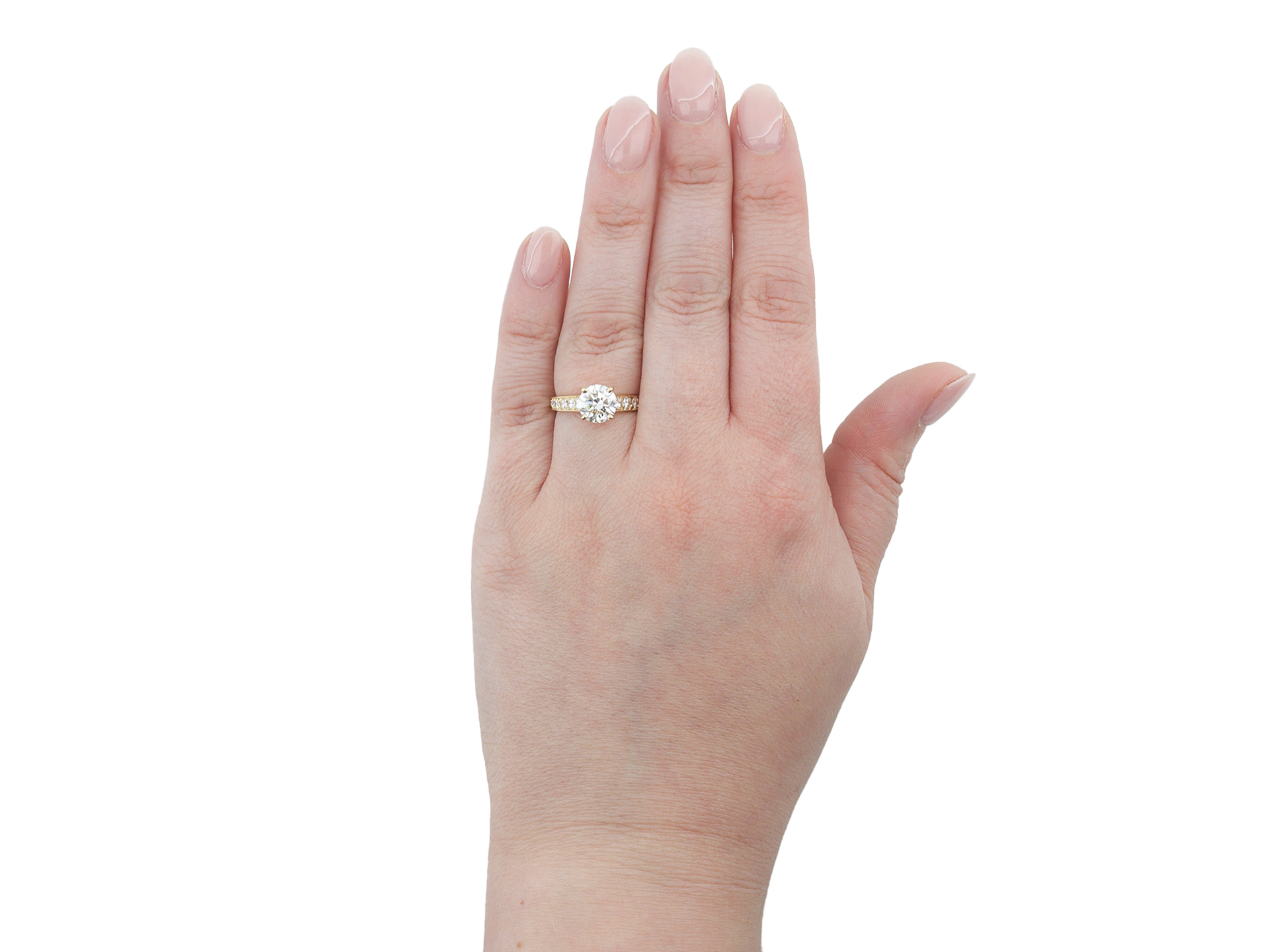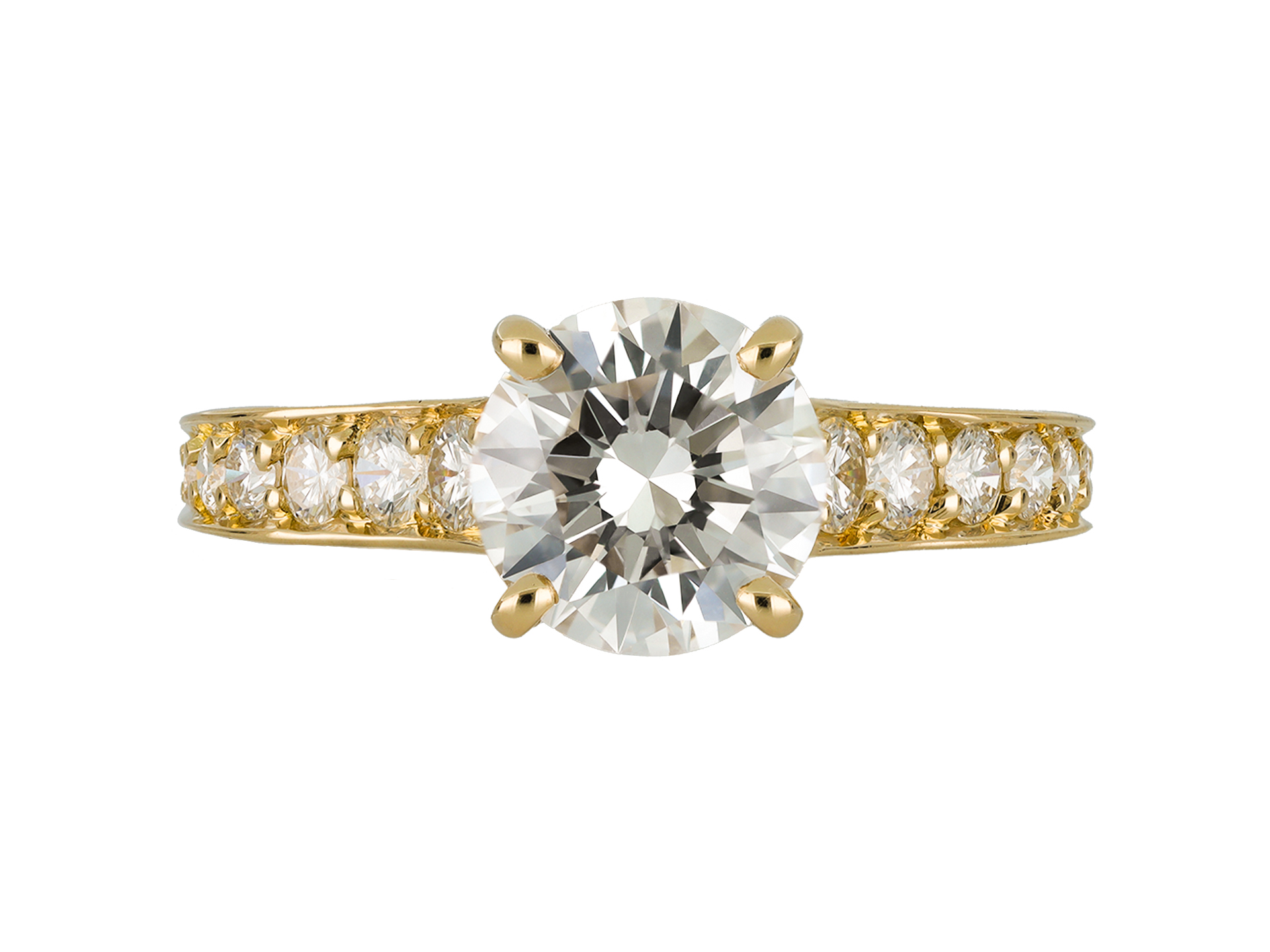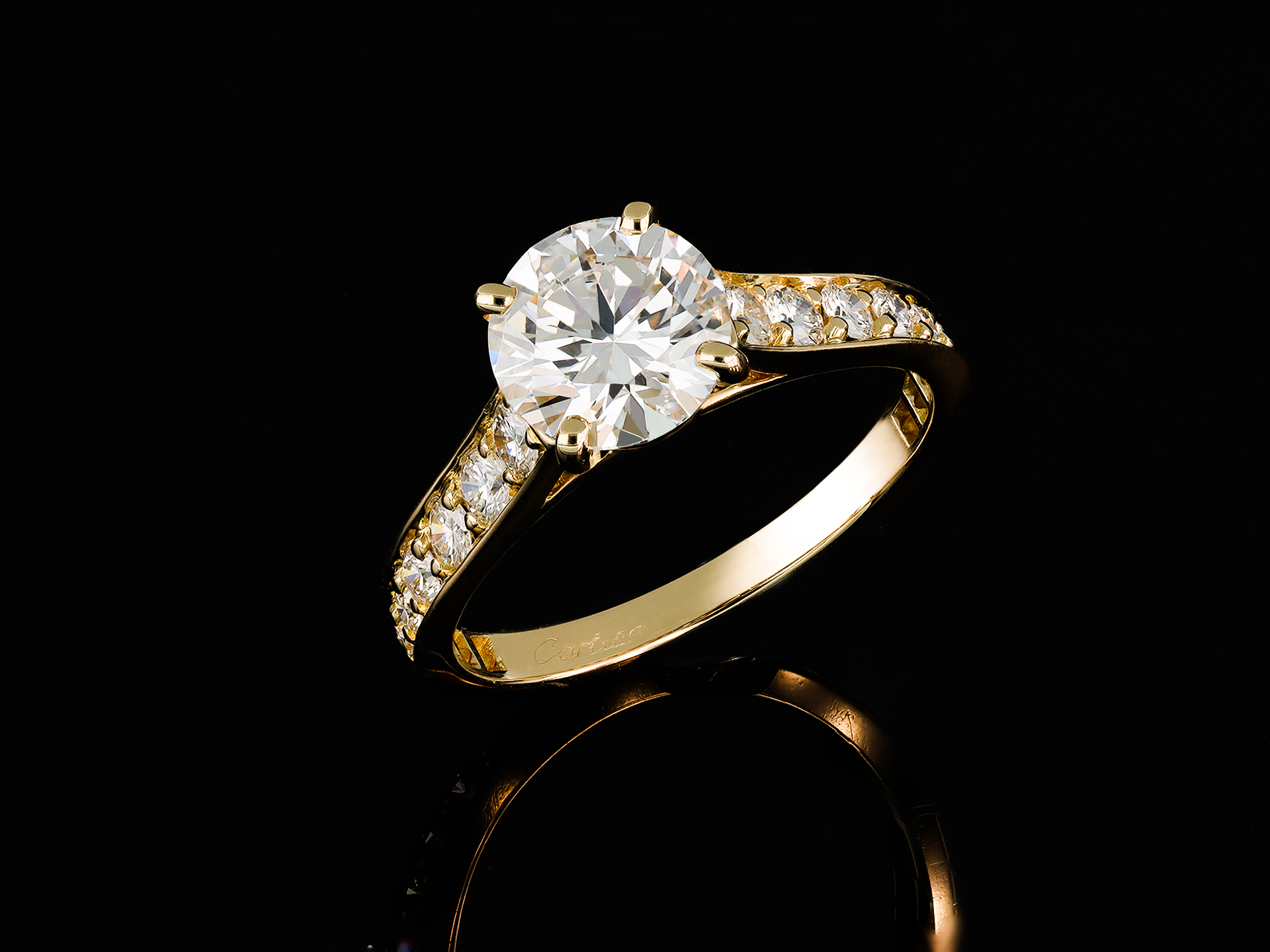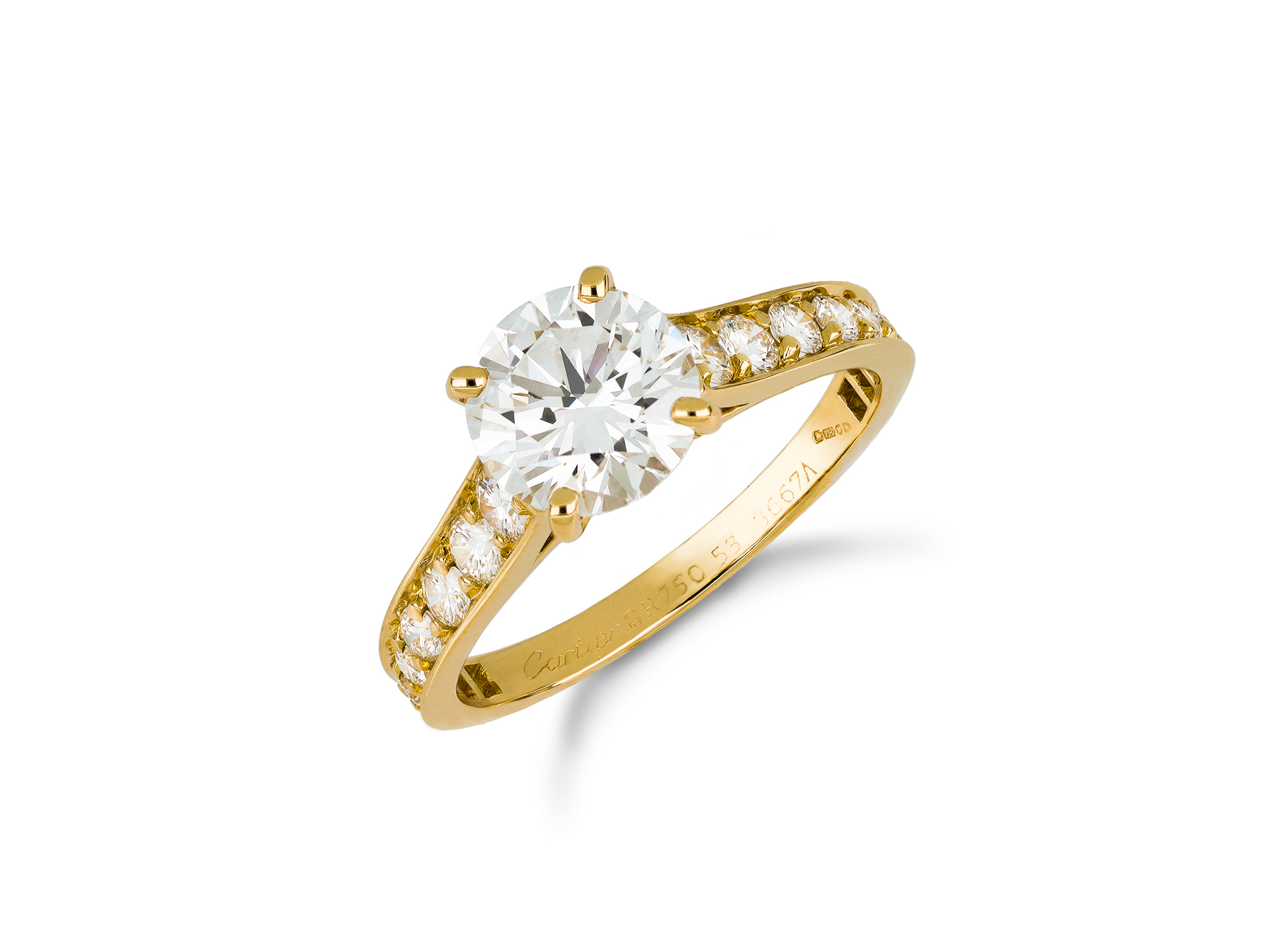 Cartier diamond flanked solitaire ring. Centrally set with a round brilliant cut diamond, D colour, VS2 clarity with a weight of 1.54 carats in an open back claw setting, flanked by eighteen brilliant cut diamonds in open back grain settings with an approximate combined weight of 0.60 carats. The total approximate diamond weight is 2.14 carats, to an elegant design with curving claws, an intricately pierced gallery and fancy open backholing leading to smooth shoulders which flow through to a solid flat shank. Marked 18 carat yellow gold, signed 'Cartier', engraved '750', numbered '5313667A', indistinct makers mark, hallmark for London, English, circa 2000, accompanied by Gemological Institute of America (GIA) report #5234334215, and Cartier box.