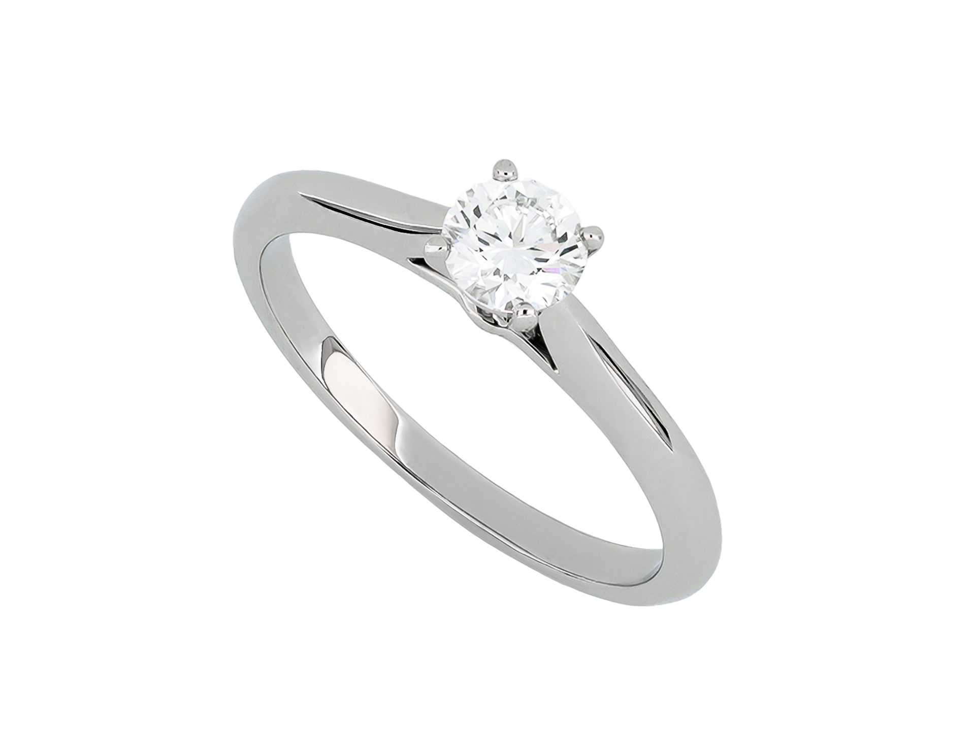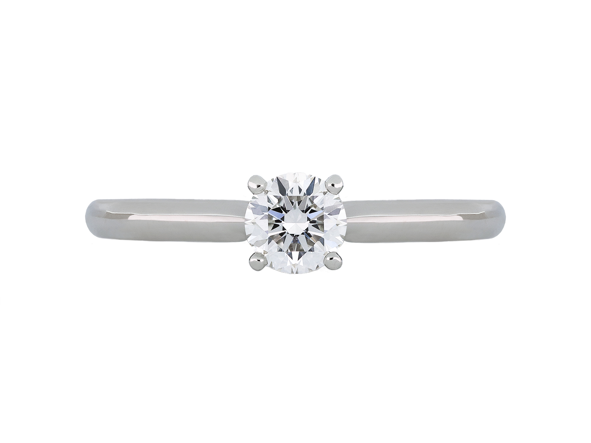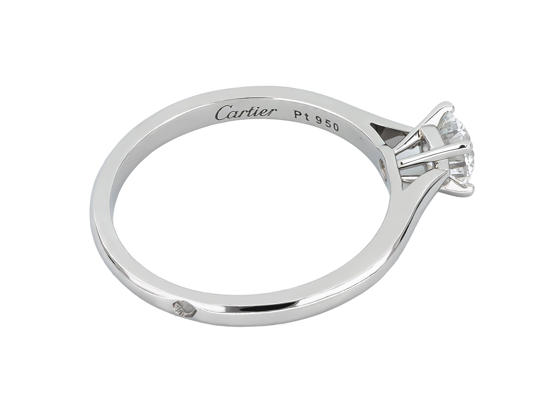 Cartier diamond solitaire ring. Set to centre with a round brilliant cut diamond, E colour, VS2 clarity, with a weight of 0.36 carats, in an open back claw setting, to an elegant solitaire design featuring curving claws, an openwork gallery and round open backholing, flanked by inwardly tapering openwork shoulders flowing through to a solid D-shape shank. Marked platinum, signed 'Cartier', numbered 'RL1347', engraved '0.36', makers mark 'GG', French, accompanied by Cartier certificate of authenticity and Gemmological Institute of America (GIA) report #6117906866