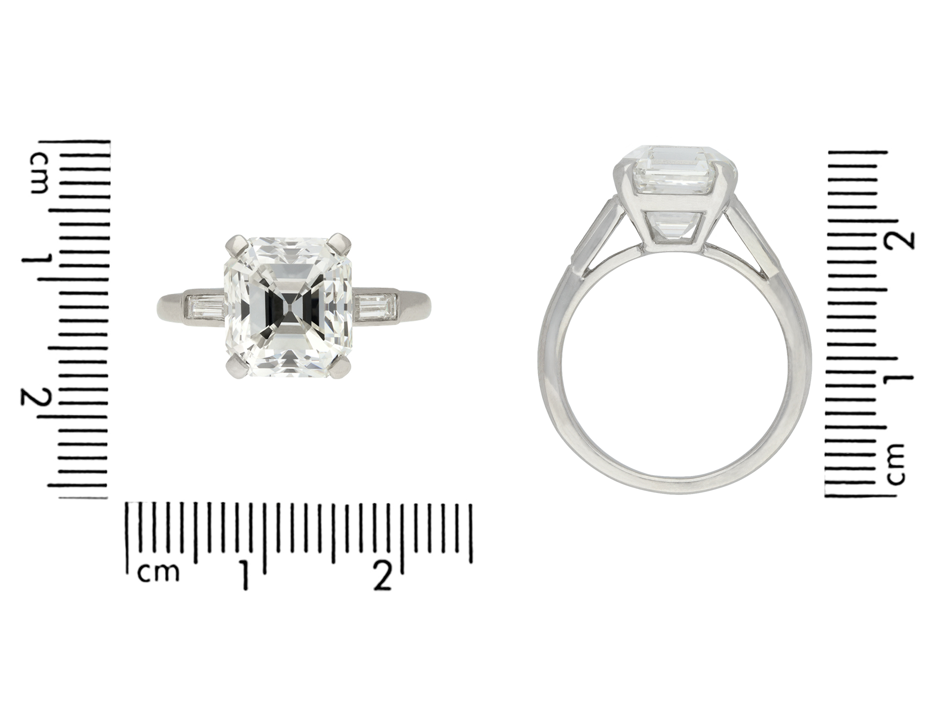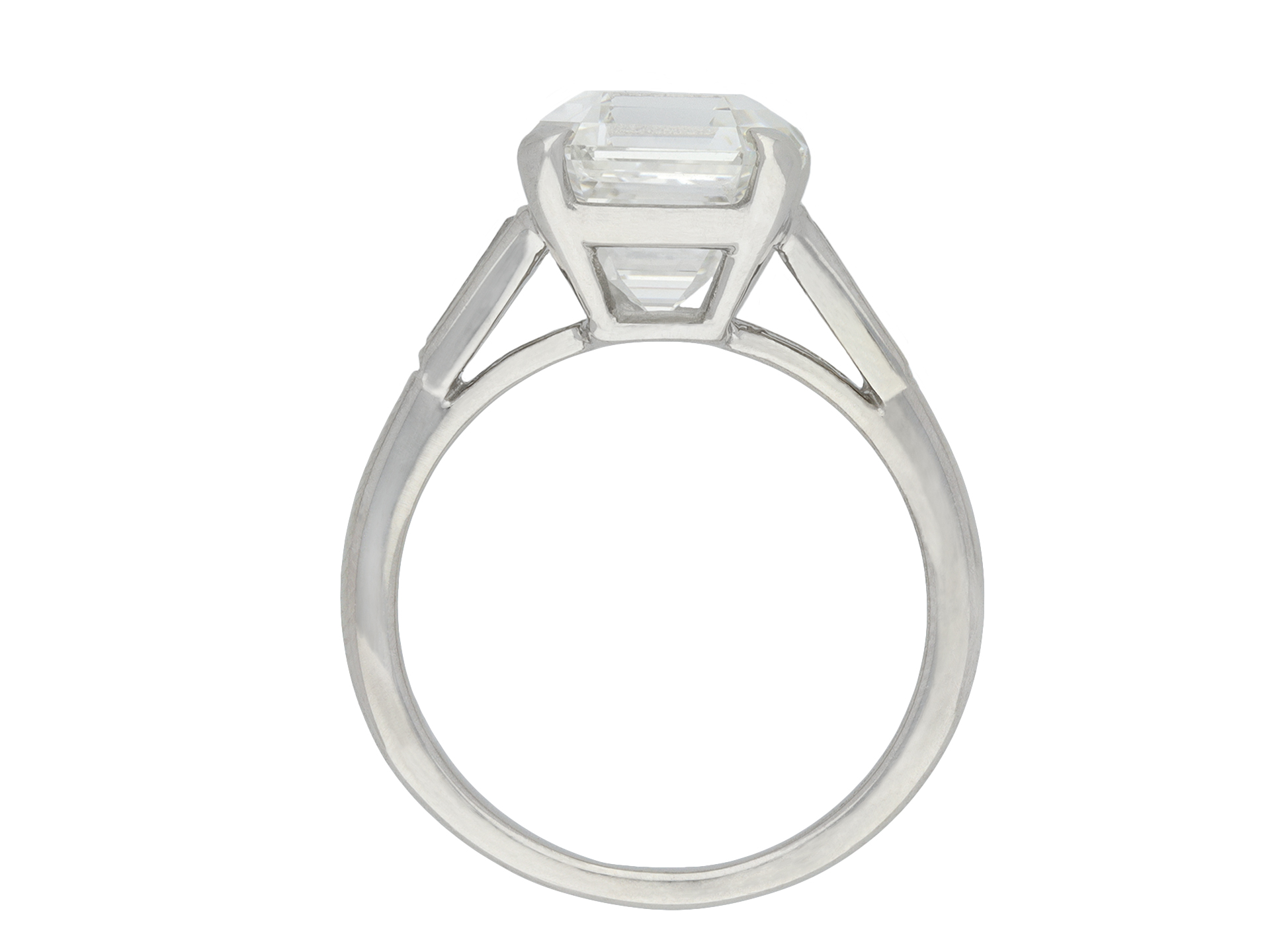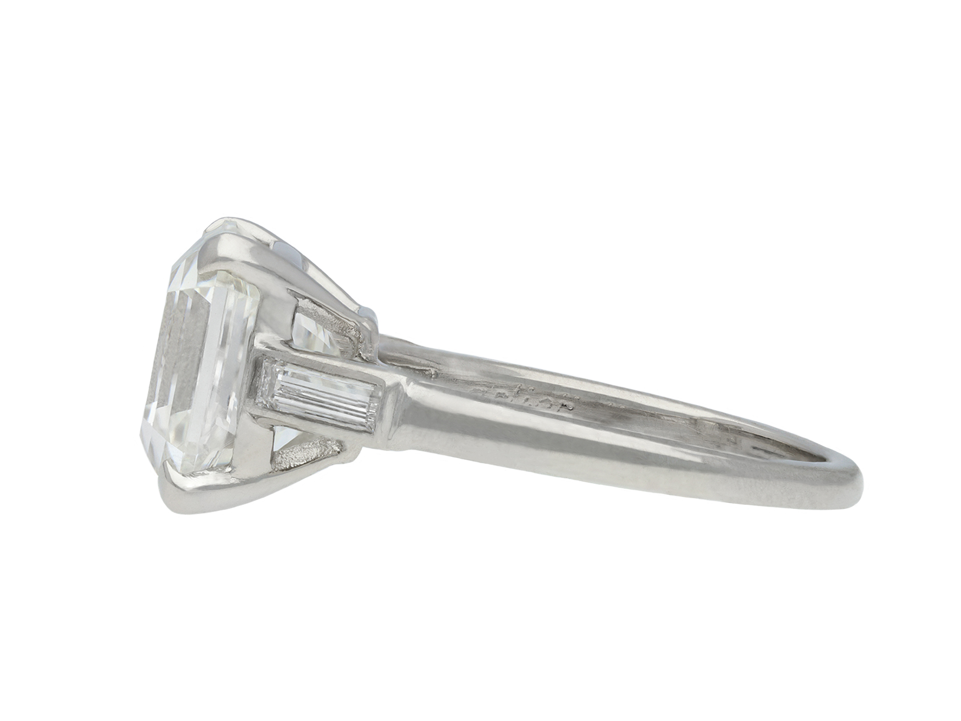 Cartier 4.68 carat emerald-cut diamond ring. Set with an impressive octagonal emerald-cut diamond, I colour, VVS2 clarity, with a weight of 4.68 carats in an open back claw setting, flanked by two rectangular baguette cut diamonds in open back rubover settings with an approximate combined weight of 0.40 carats. The total approximate diamond weight is 5.08 carats, to a striking flanked solitaire design with corner claws, a geometric openwork gallery and fancy open backholing, leading to raised shoulders and flowing through to a slightly tapering solid D-shape shank. Tested platinum, signed 'Cartier', partially numbered 'l 02203', circa 1980, accompanied by Gemological Institute of America (GIA) report #6234221266, accompanied by original fitted box.