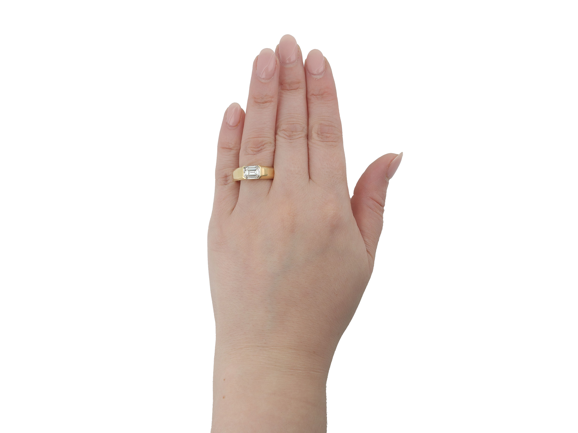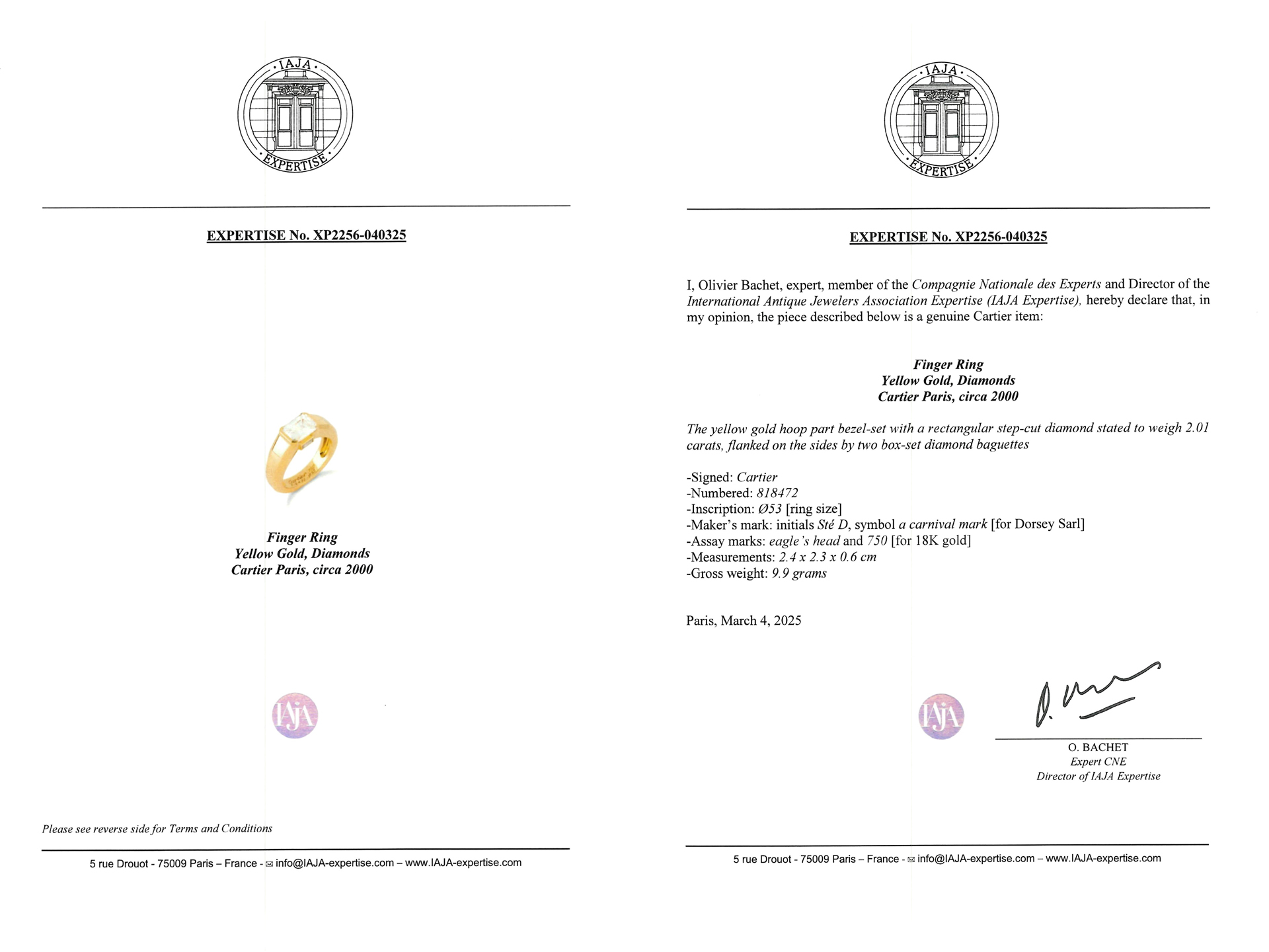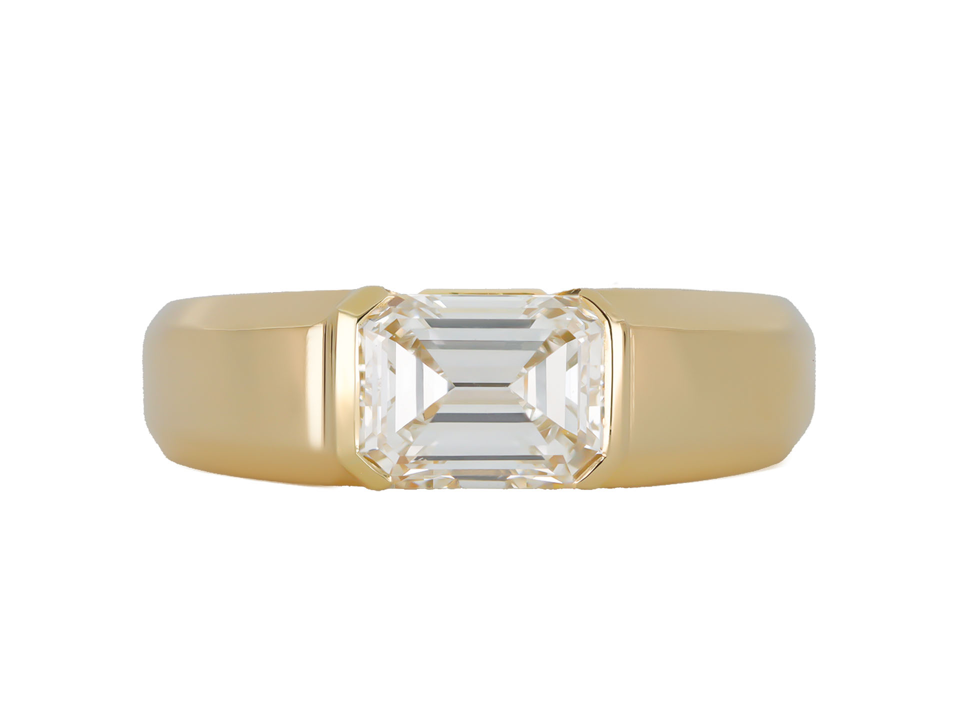 Cartier emerald-cut diamond solitaire. Set to centre with an octagonal emerald-cut diamond, G colour, VS1 clarity with a weight of 2.01 carats in an open back part-rubover setting, adorned by two rectangular baguette cut diamonds in open back rubover settings with a combined weight of 0.20 carats. The total approximate diamond weight is 2.21 carats to an impressive east-west solitaire design featuring smooth edges, a polished gallery, and open backholing, the broad integrated shoulders flowing through to a solid flat shank. Marked 18 carat yellow gold, signed 'Cartier', maker's mark 'Ste D' with a carnival mark for Dorsey Sarl, numbered '818472', French, circa 2000, accompanied by Gemological Institute of America (GIA) report #2239150905 and IAJA Expertise report #XP2256-040325, and Cartier box.
