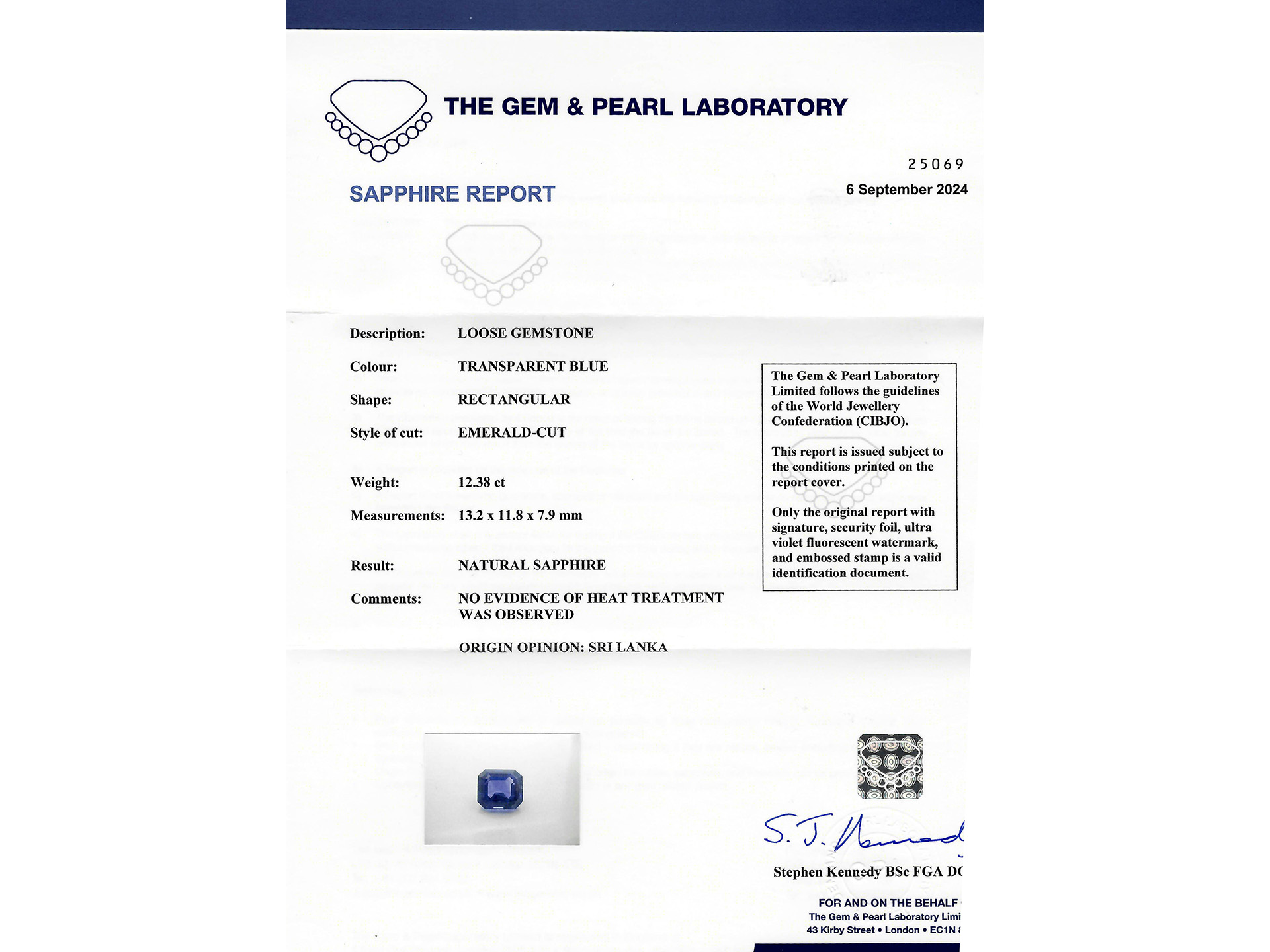 Gemstone Ceylon Unheated Sapphire, Emerald Cut, 12.38ct 20 x Diamonds, Baguette Cut, approximately 2.75ct total 42 x Diamonds, Brilliant Cut, approximately 0.65ct total