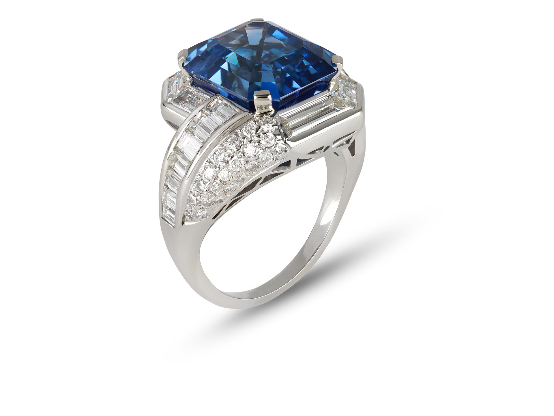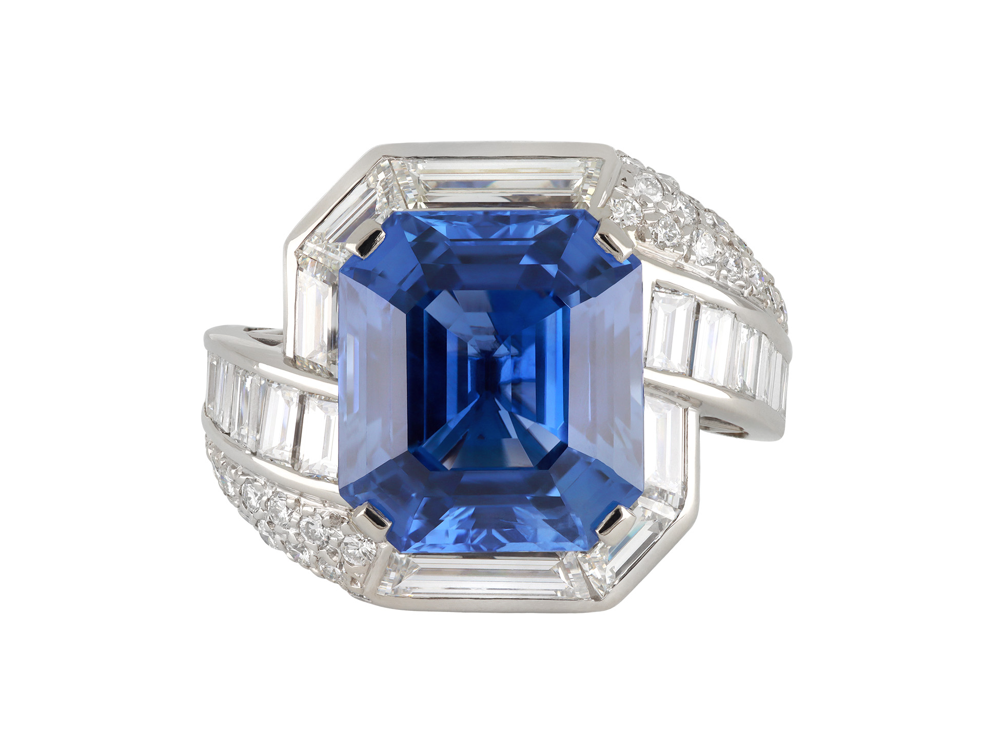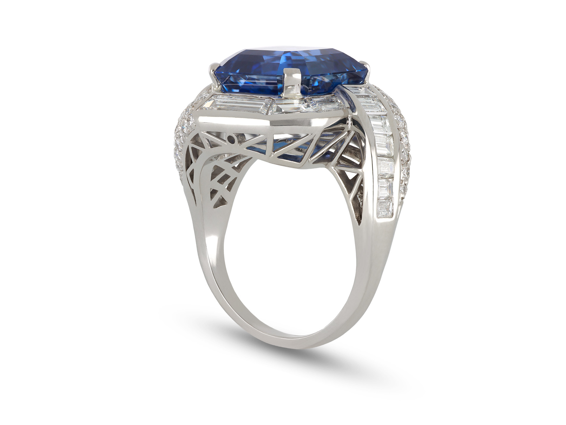 Ceylon sapphire and diamond cluster ring. Set to centre with an octagonal emerald-cut natural unenhanced Ceylon sapphire in an open back claw setting with a weight of 12.38 carats, further set with twenty tapered baguette cut diamonds in open back rubover settings with a combined approximate weight of 2.75 carats, and decorated with forty-two round brilliant cut diamonds in open back grain settings with a combined weight of 0.65 carats. The total approximate diamond weight is 3.40 carats, to an impressive geometric cluster design featuring polished edges, a decoratively pierced gallery with triangular motifs and chenier detail, and fancy shape open backholing, leading to tapering asymmetric shoulders and flowing through to a solid D-shape shank. Tested platinum and iridium, American, circa 1960, accompanied by SSEF report #141237 and The Gem and Pearl Laboratory report #25069.